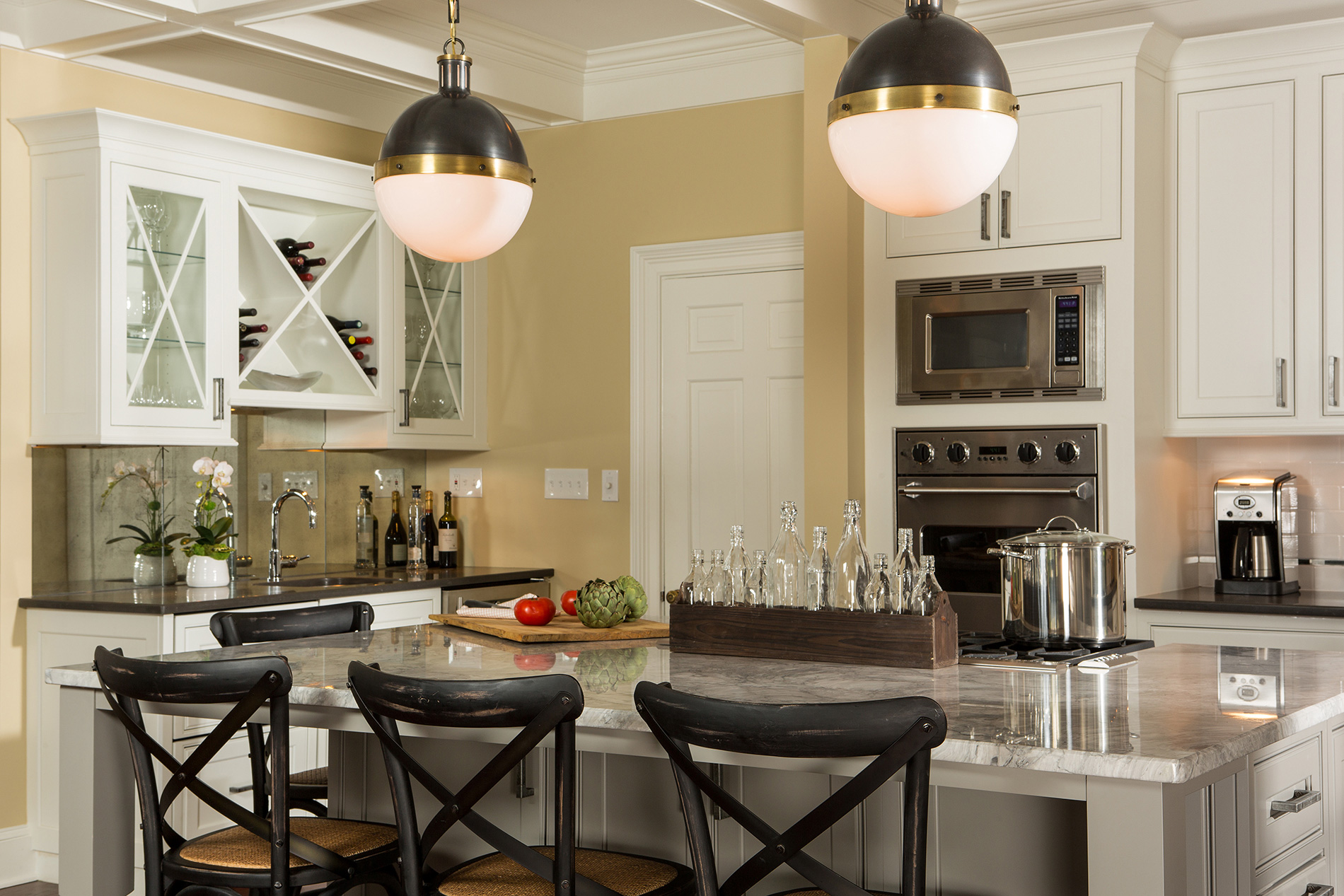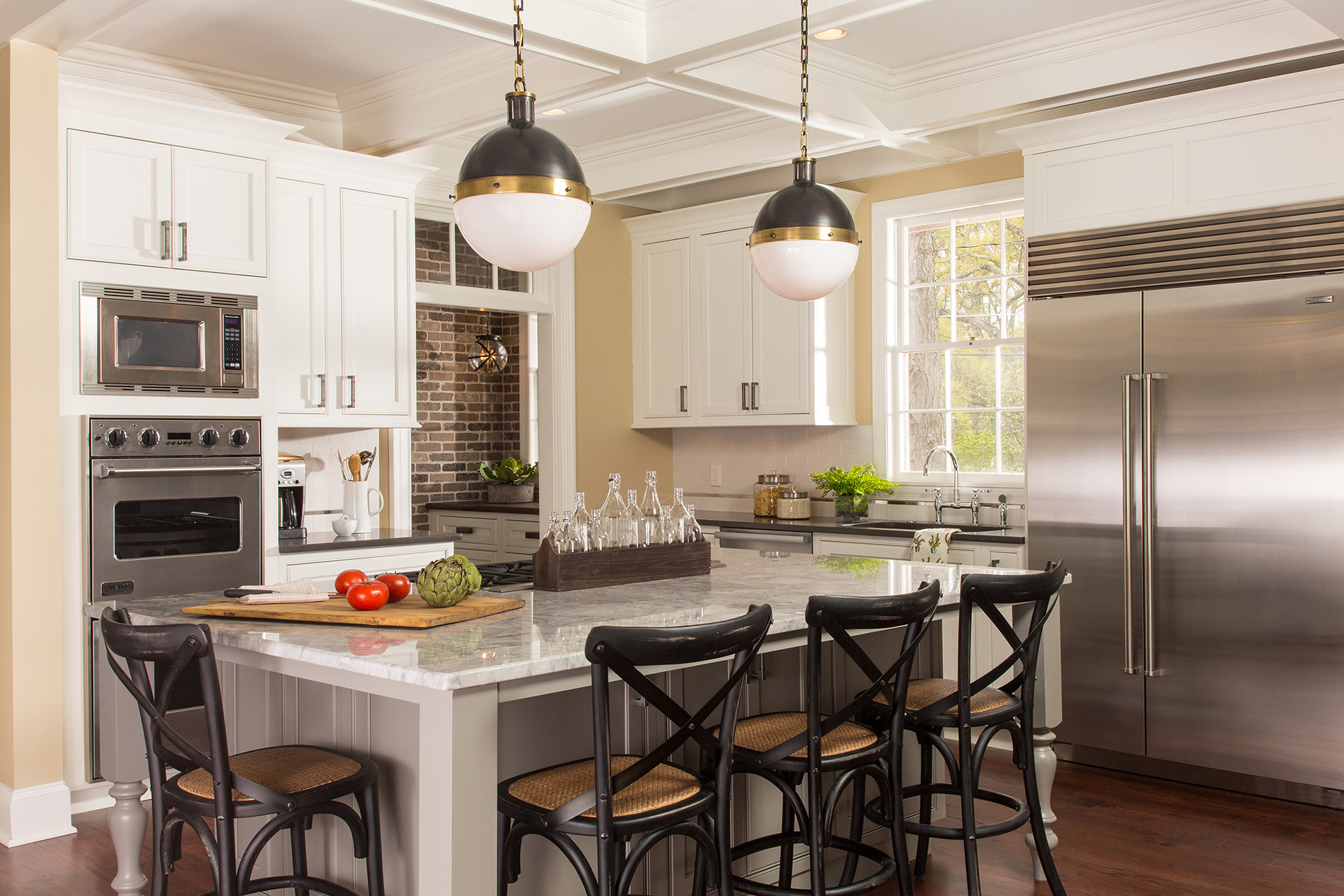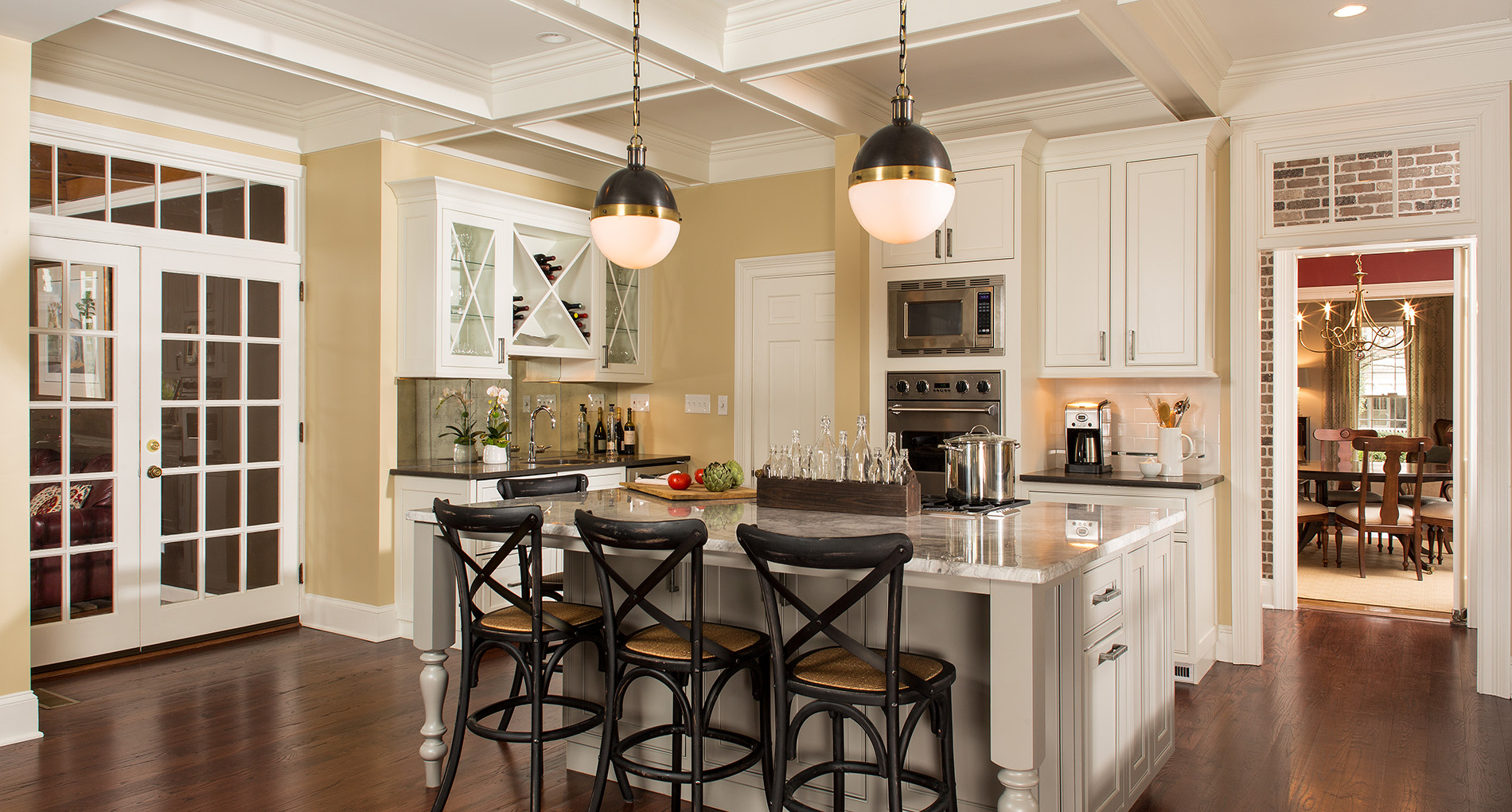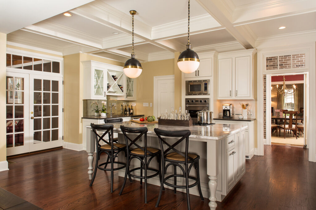 Balancing old and new, this renovation incorporates formal elements with a relaxed vibe. Timeless colors and details create a traditional feel. The lighting nods to the 1920s, while the cabinet hardware mixes antique and industrial styles. The kitchen features clever storage solutions, such as a cocktail bar, custom built-ins and a butler’s pantry with rustic brick veneer. Additional improvements include new hardwood floors and adding coffers to enhance the structural ceiling beams. The renovation created a tighter envelope with relocated ducts, added insulation, and air sealing. This beautifully transformed 500 sq. ft. kitchen not only meets this growing family’s everyday needs, but accommodates their love for entertaining.