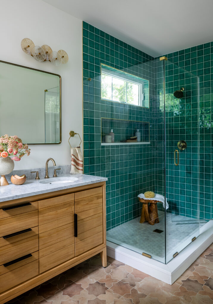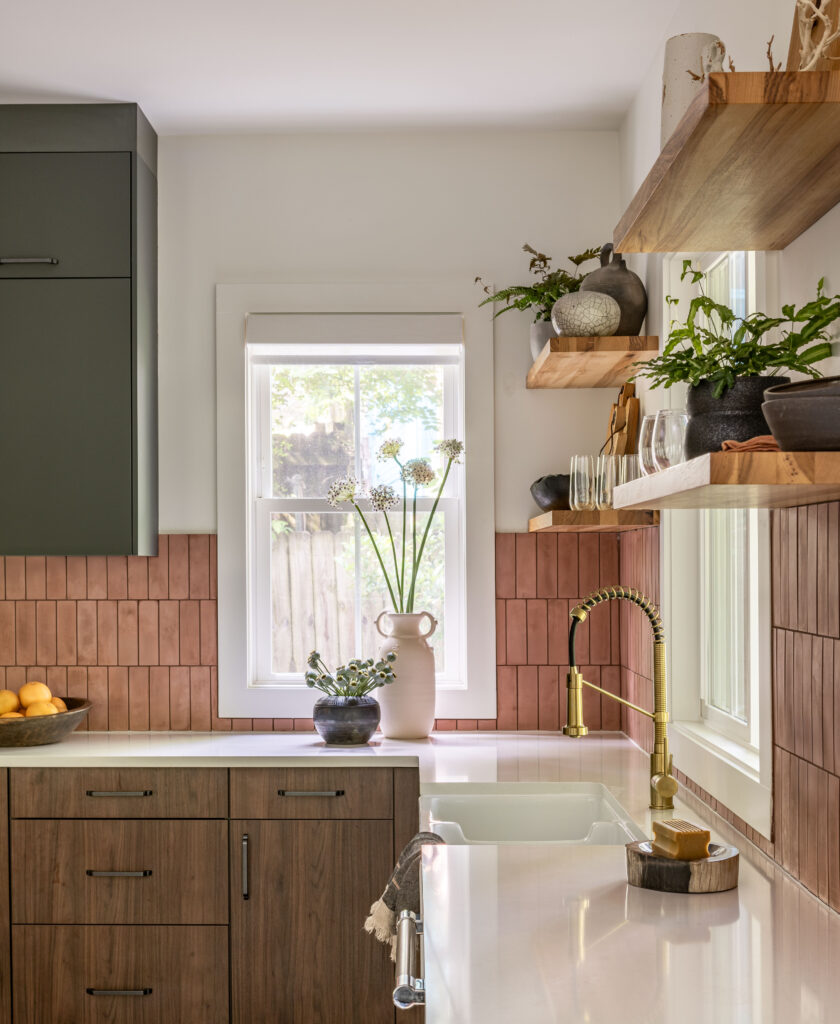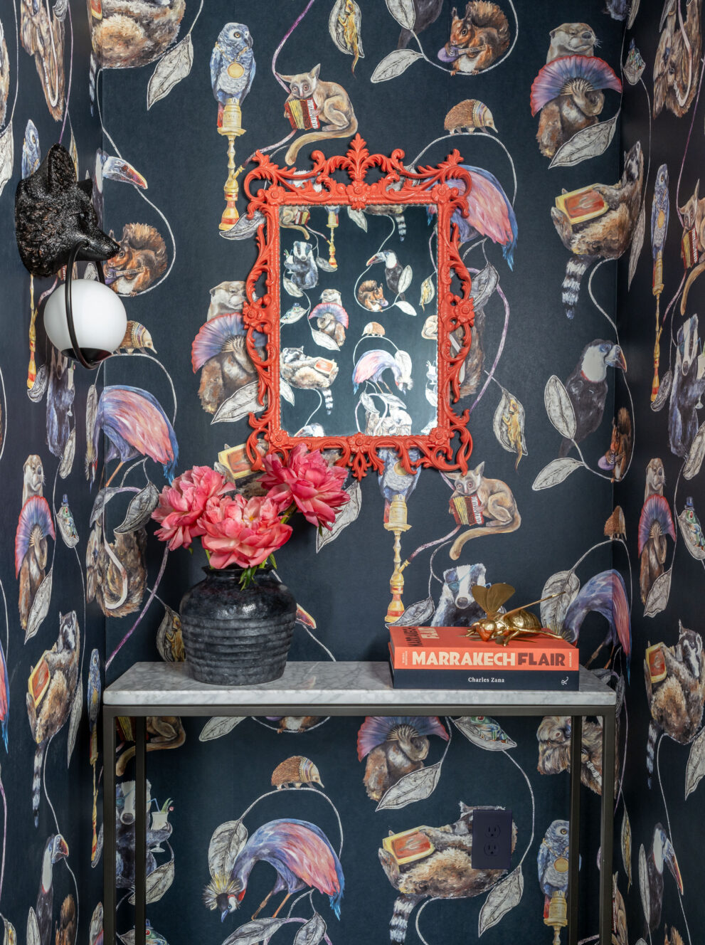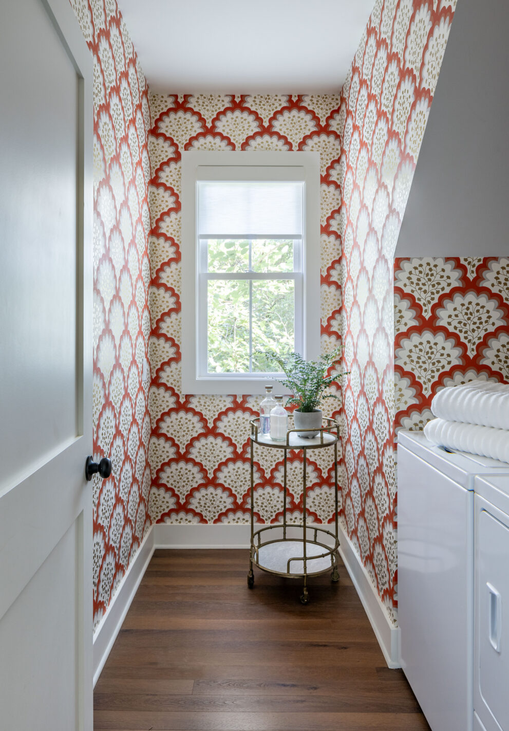 Now filled with creative expressions of the homeowners’ style, each design element (wallpaper, colorful tile, furniture, and more) pulls this home together into a coherent statement of better, joyful living.