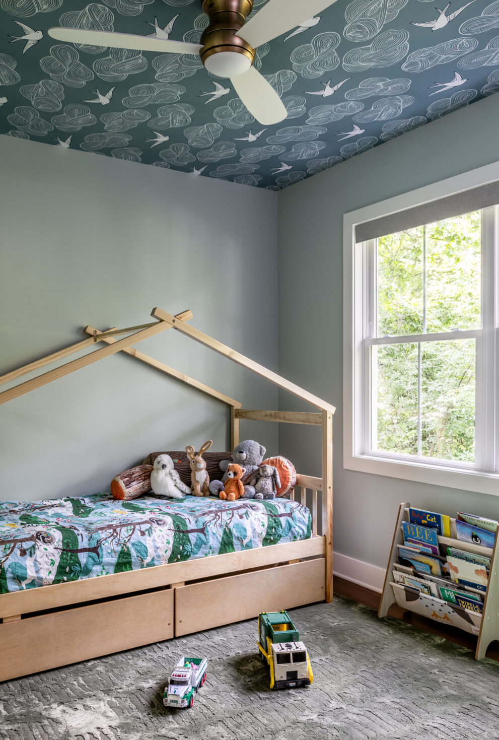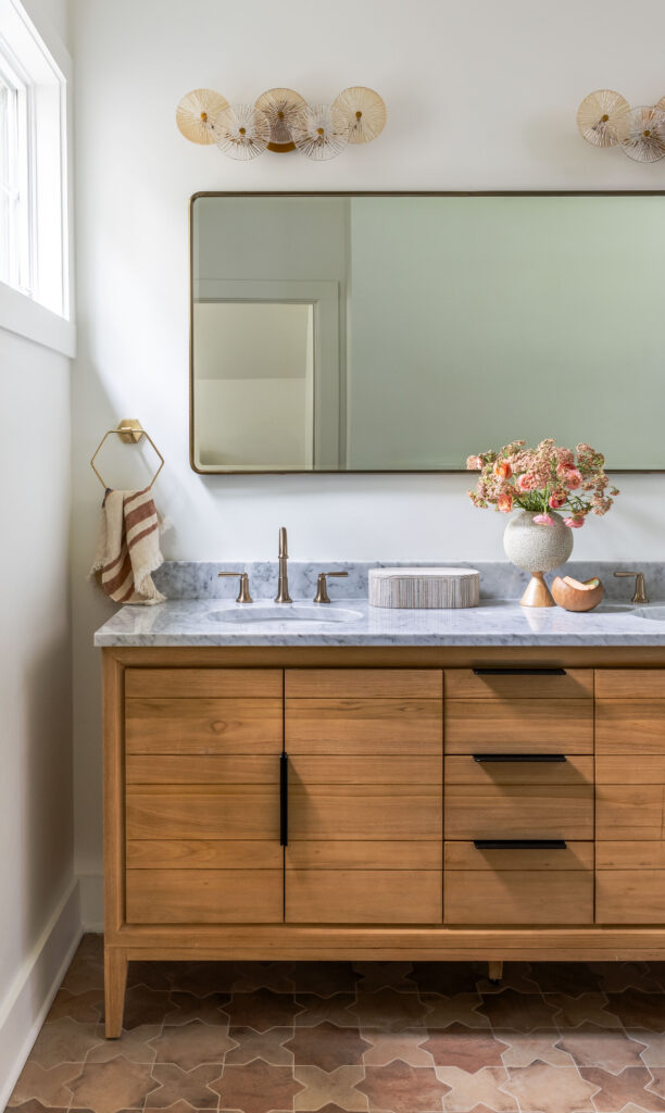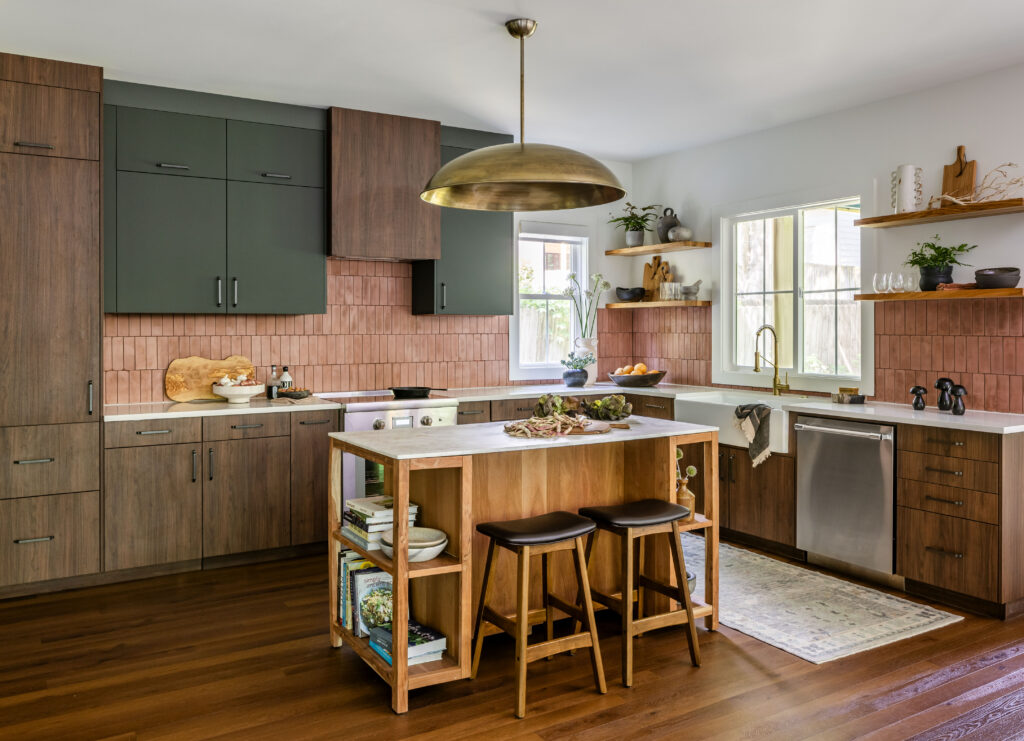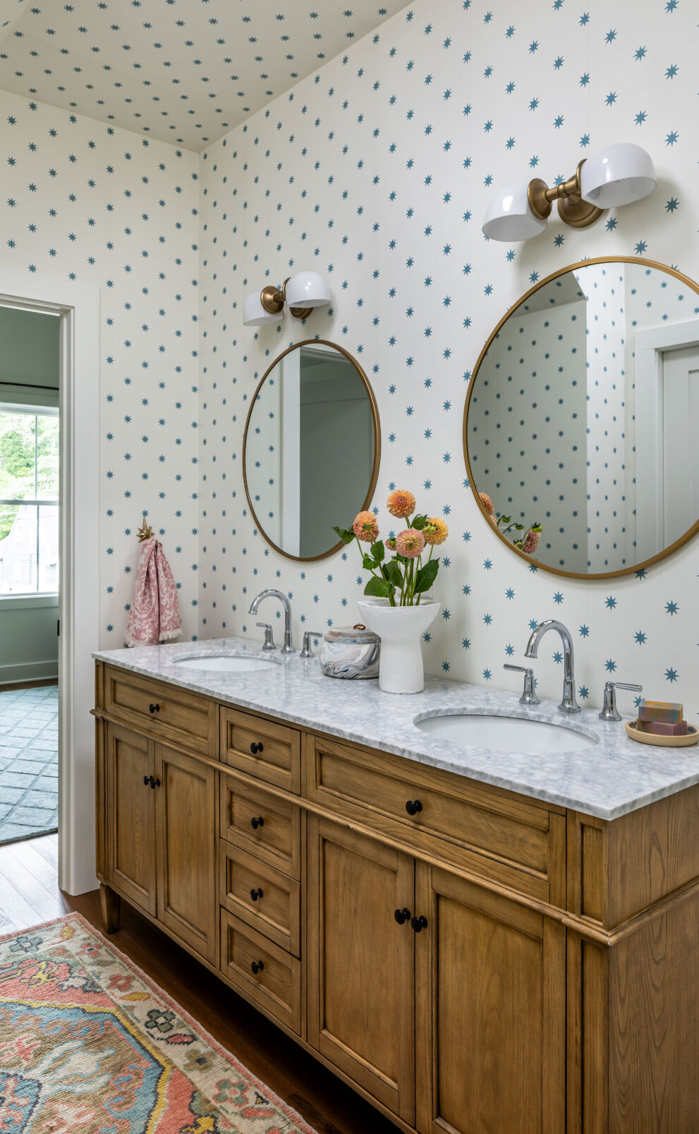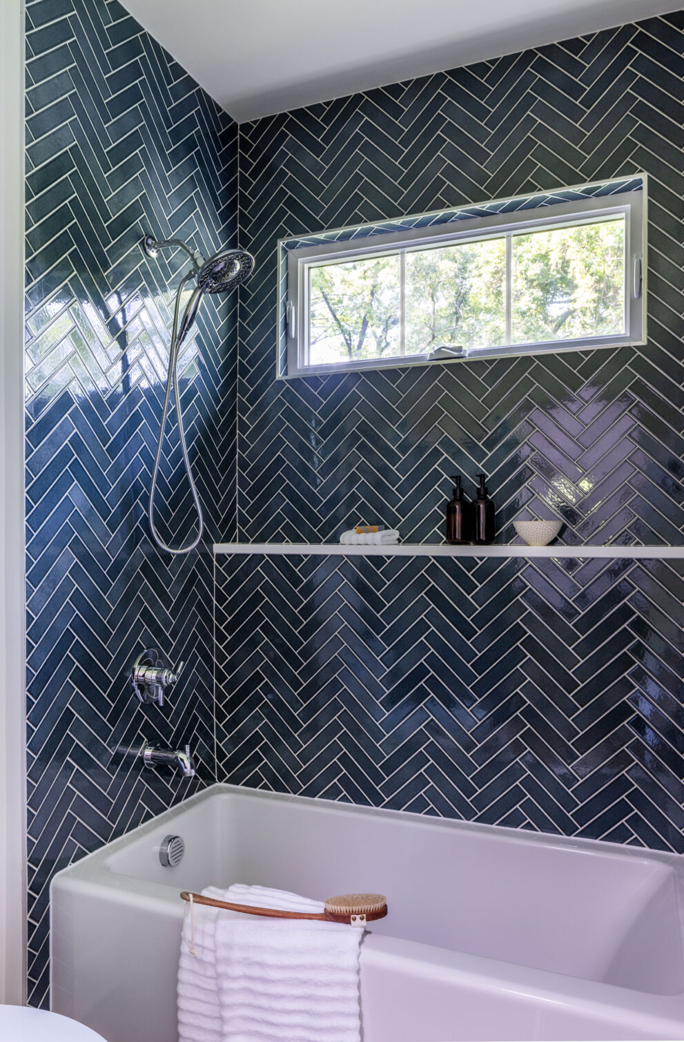 Now filled with creative expressions of the homeowners’ style, each design element (wallpaper, colorful tile, furniture, and more) pulls this home together into a coherent statement of better, joyful living.