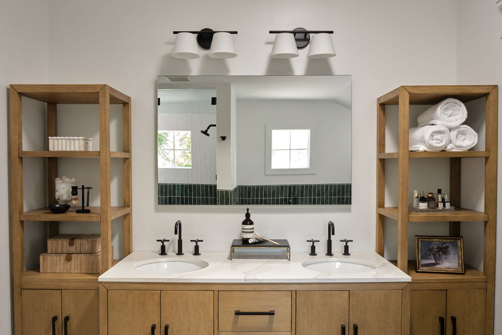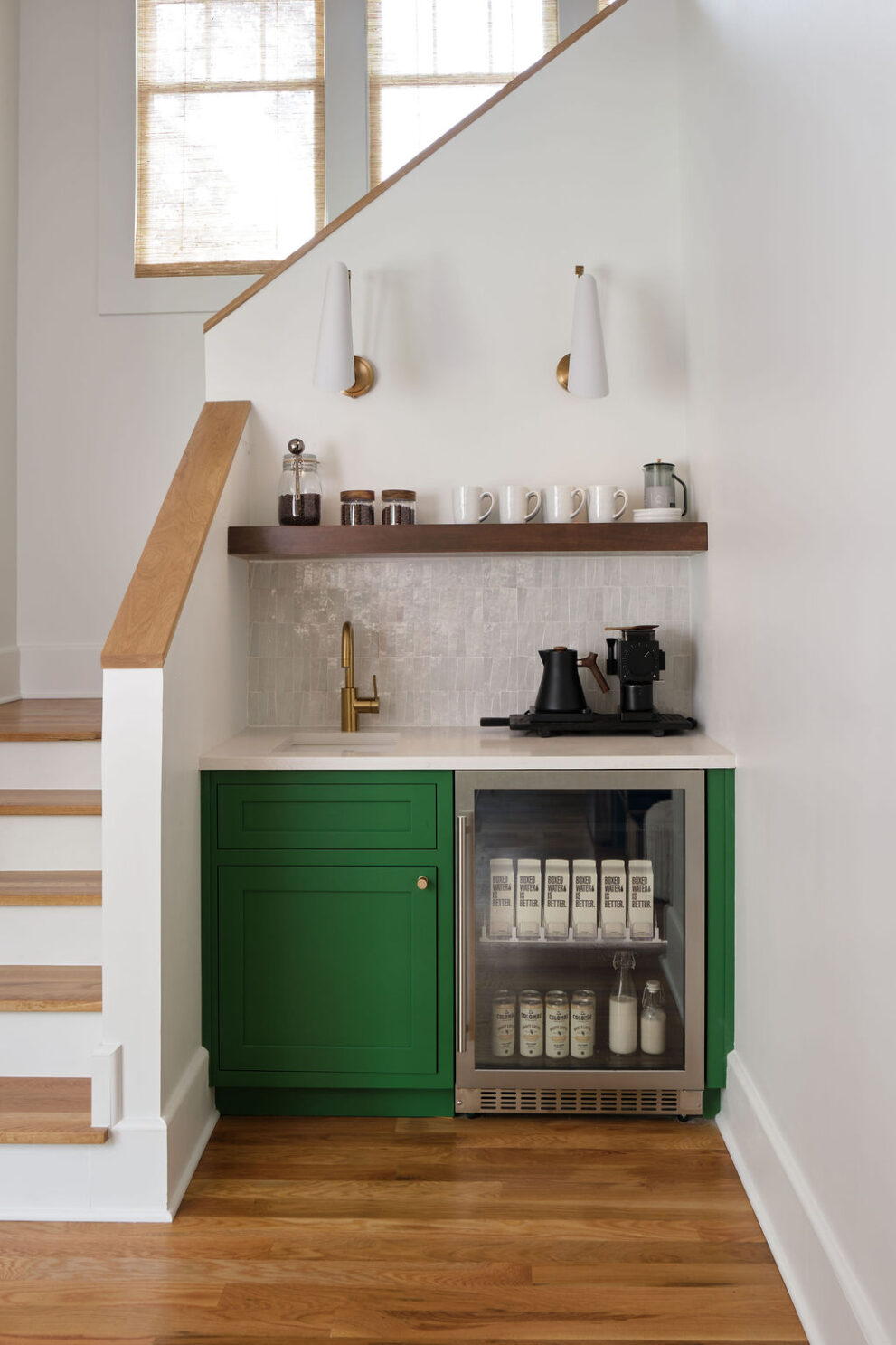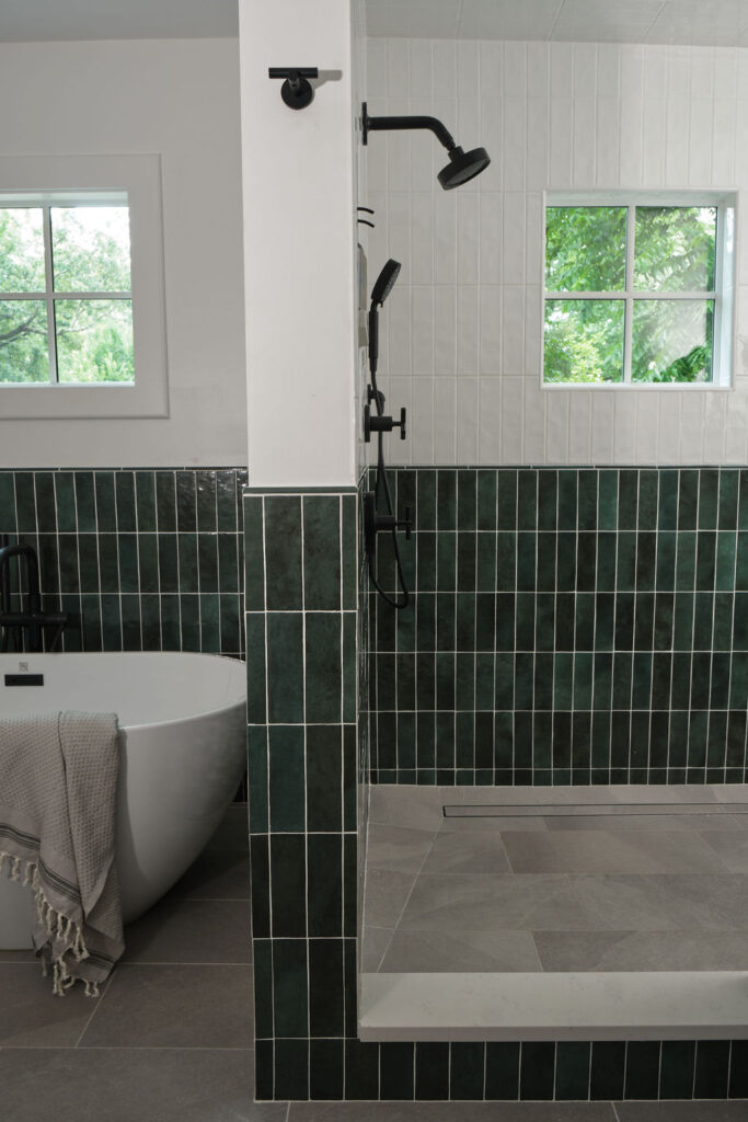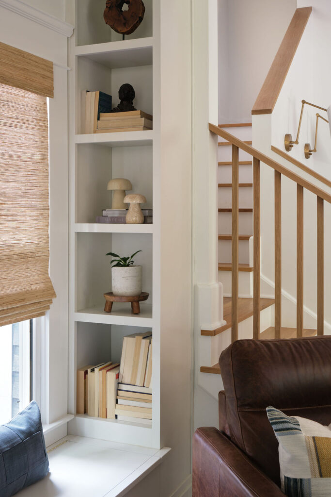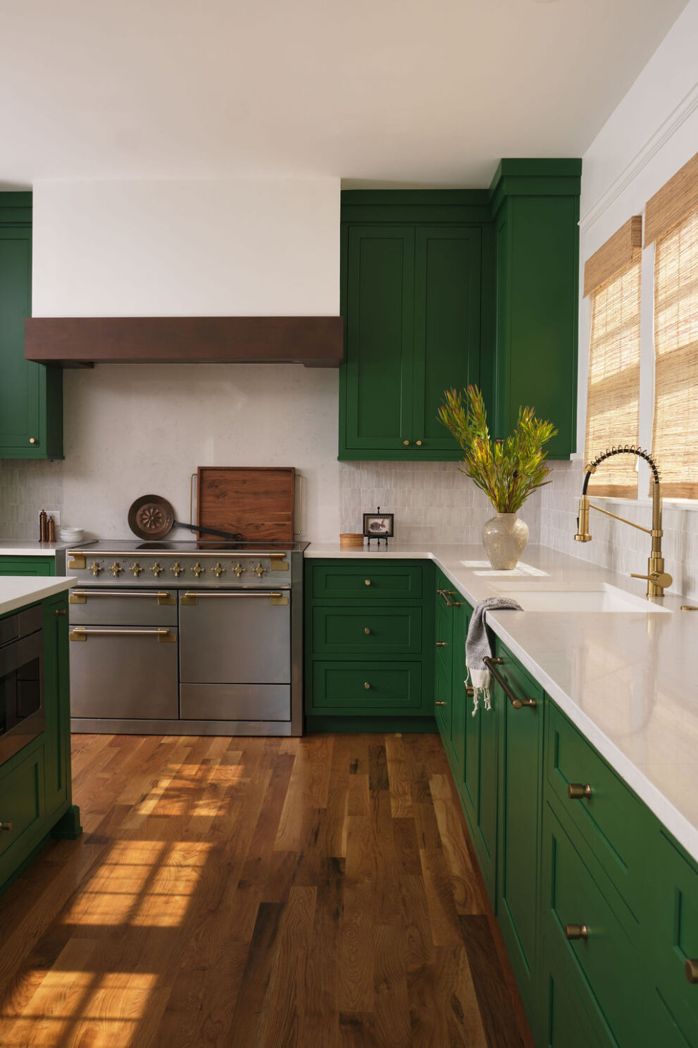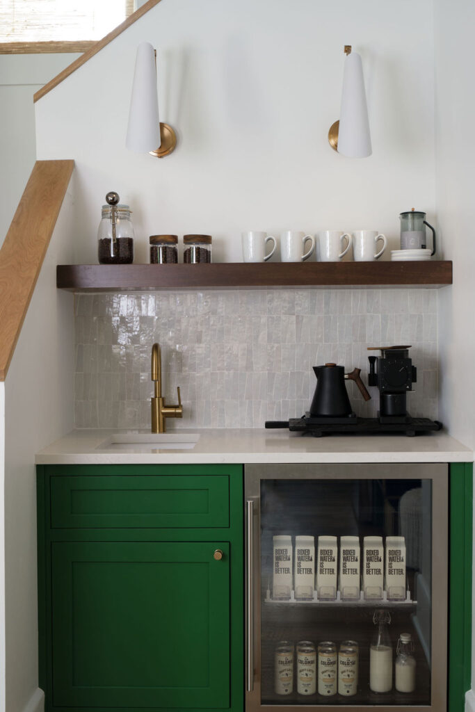 Special details, such as the custom staircase, vibrant green kitchen cabinetry, moody primary suite, and custom built-ins at the family room, all work cohesively to create a space that is as inspiring as it is restful.