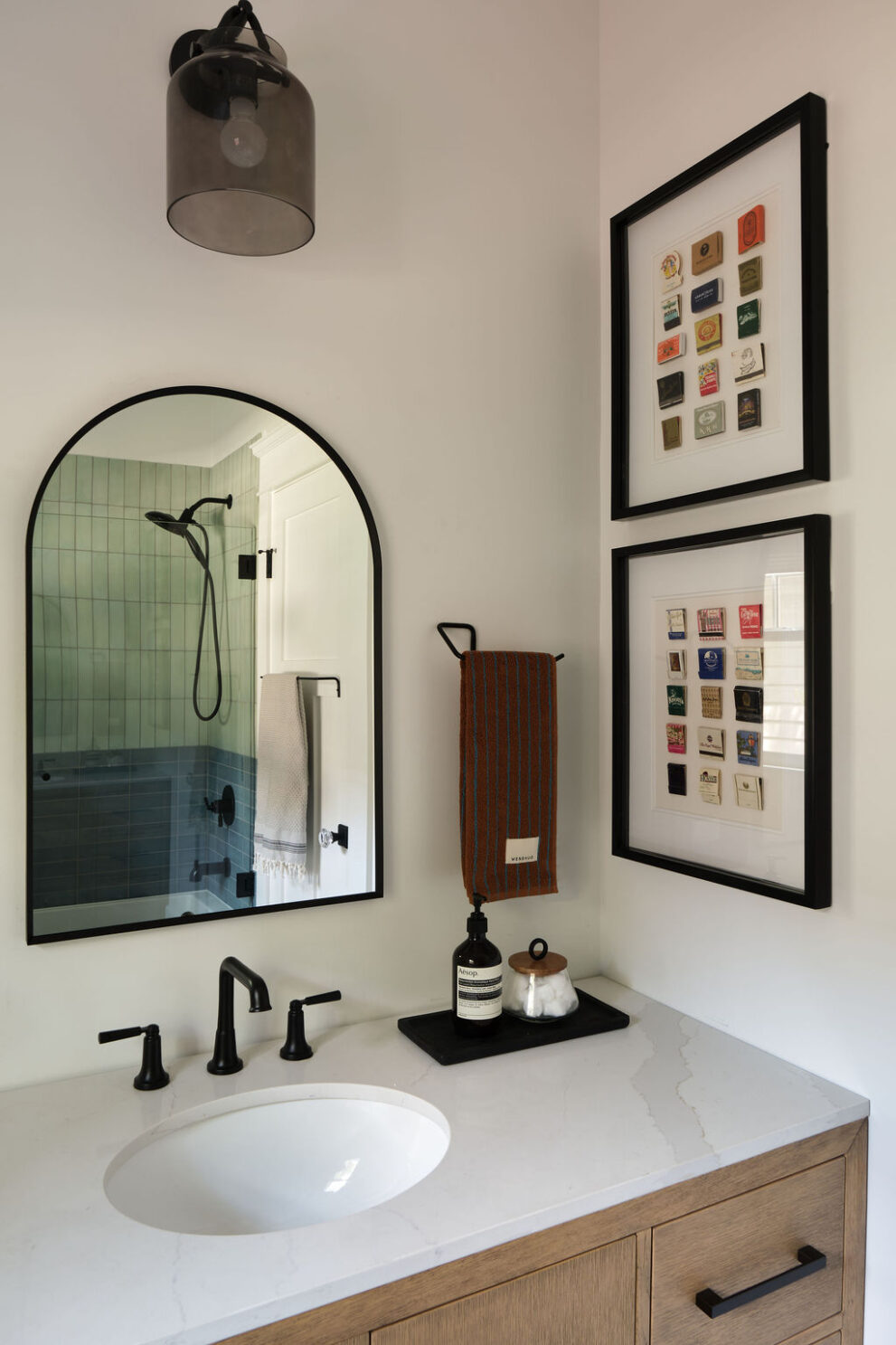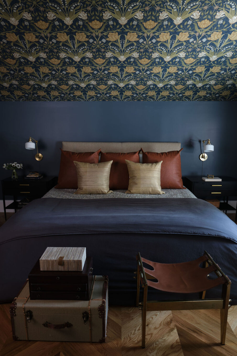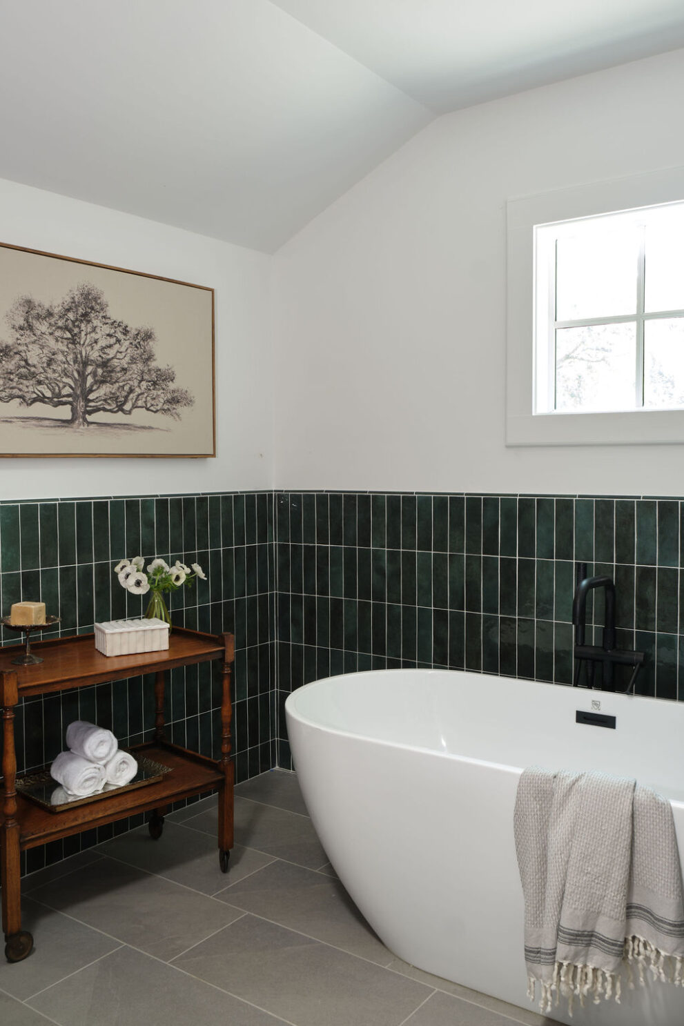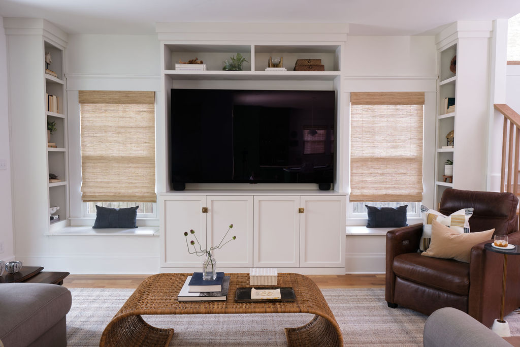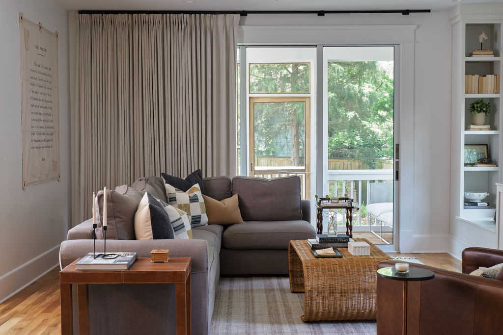 Special details, such as the custom staircase, vibrant green kitchen cabinetry, moody primary suite, and custom built-ins at the family room, all work cohesively to create a space that is as inspiring as it is restful.