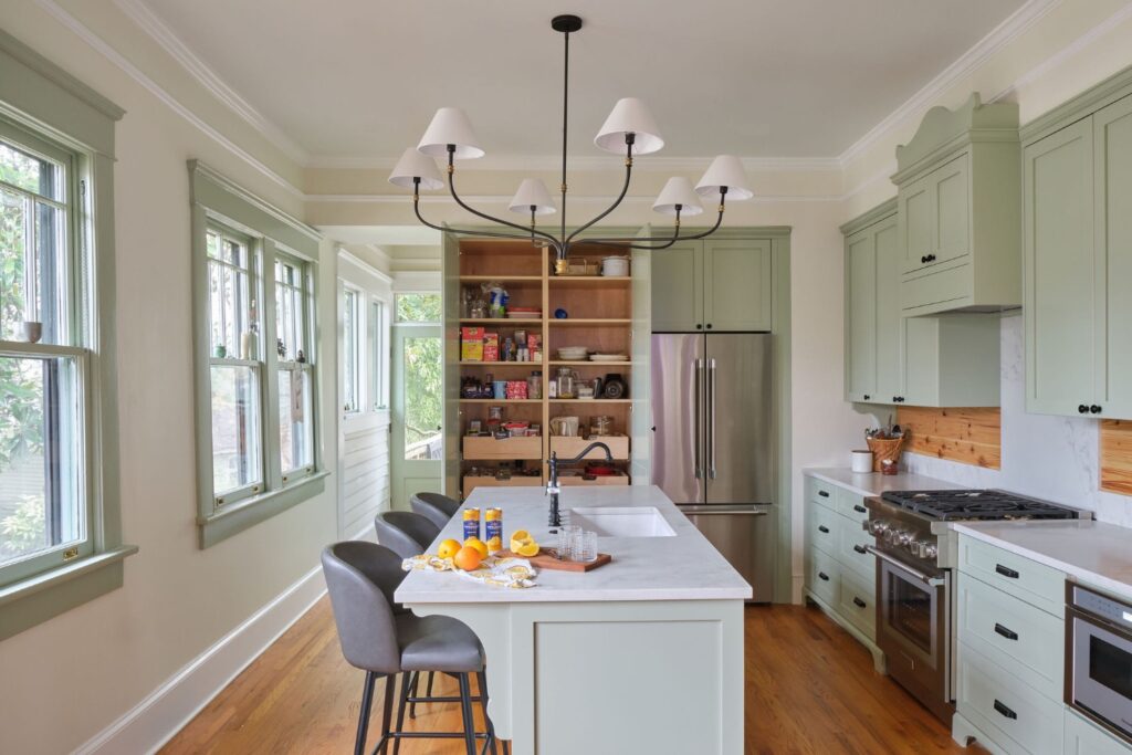 Changes in the kitchen included incorporation of a spacious island for prep and seating, a large pantry with pull out storage, and an improved connection to the dining room and public spaces. The primary bath and new closet were built into space previously occupied by mechanical equipment and laundry. New windows and aging in place functionality make it light-filled and appropriate for all users. The hall bath which had been dark and cramped benefited from a new layout and charming trim details to provide excellent function and design that complements the overall craftsman style of the home.