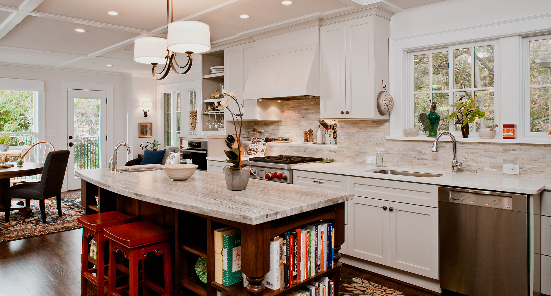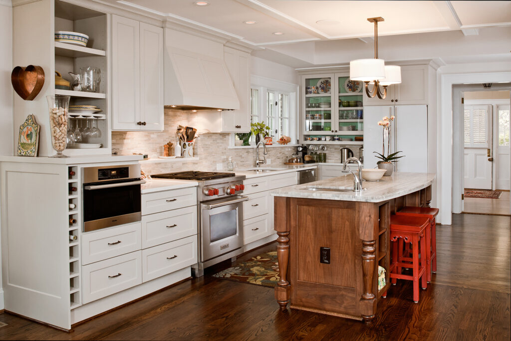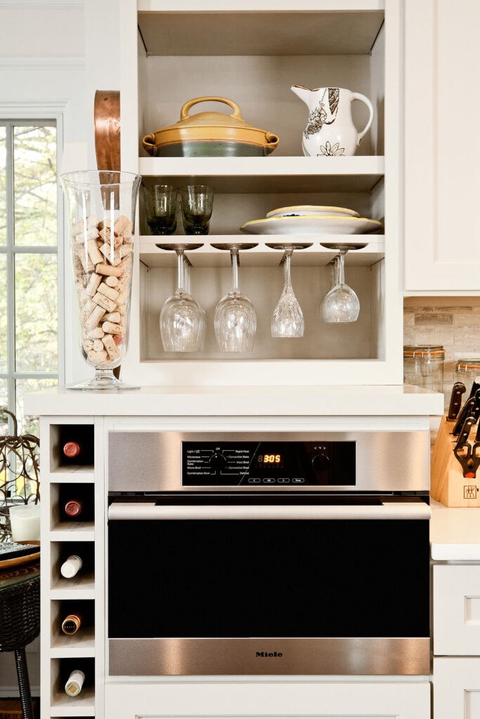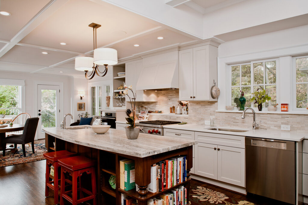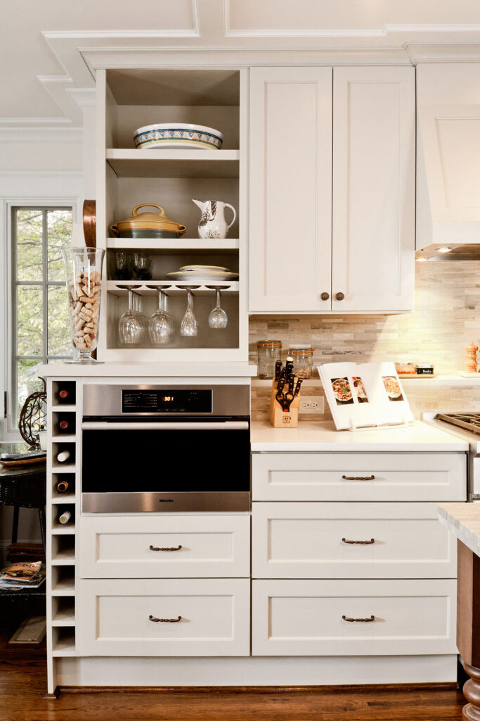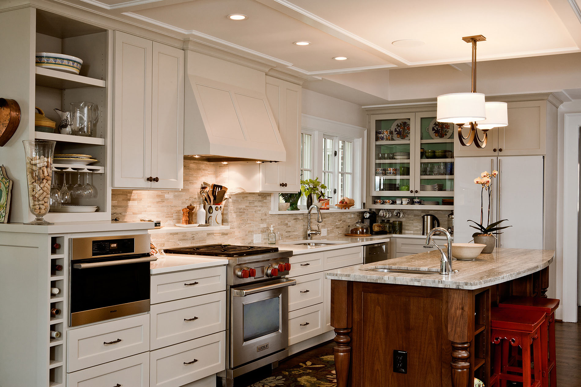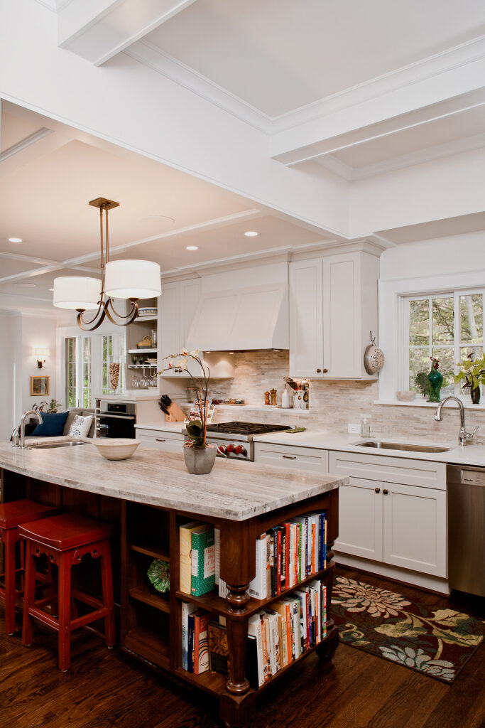 Frequent entertainers, these homeowners wanted a multifunctional kitchen with integrated living space. To do this, the kitchen peninsula and walls were removed, opening up the area and enabling us to create a multifunctional kitchen with a drop zone and coffee and wine stations. We did this by incorporating detailed elements, such as: the display cabinet, wine storage, sitting area, and the furniture–like design of the island. The contrasting ceiling heights posed a challenge, but as a result of careful detailing and trim work it is now a cohesive, interesting feature of the new kitchen. The homeowners now enjoy a bright, modern kitchen with a seamlessly integrated living area.