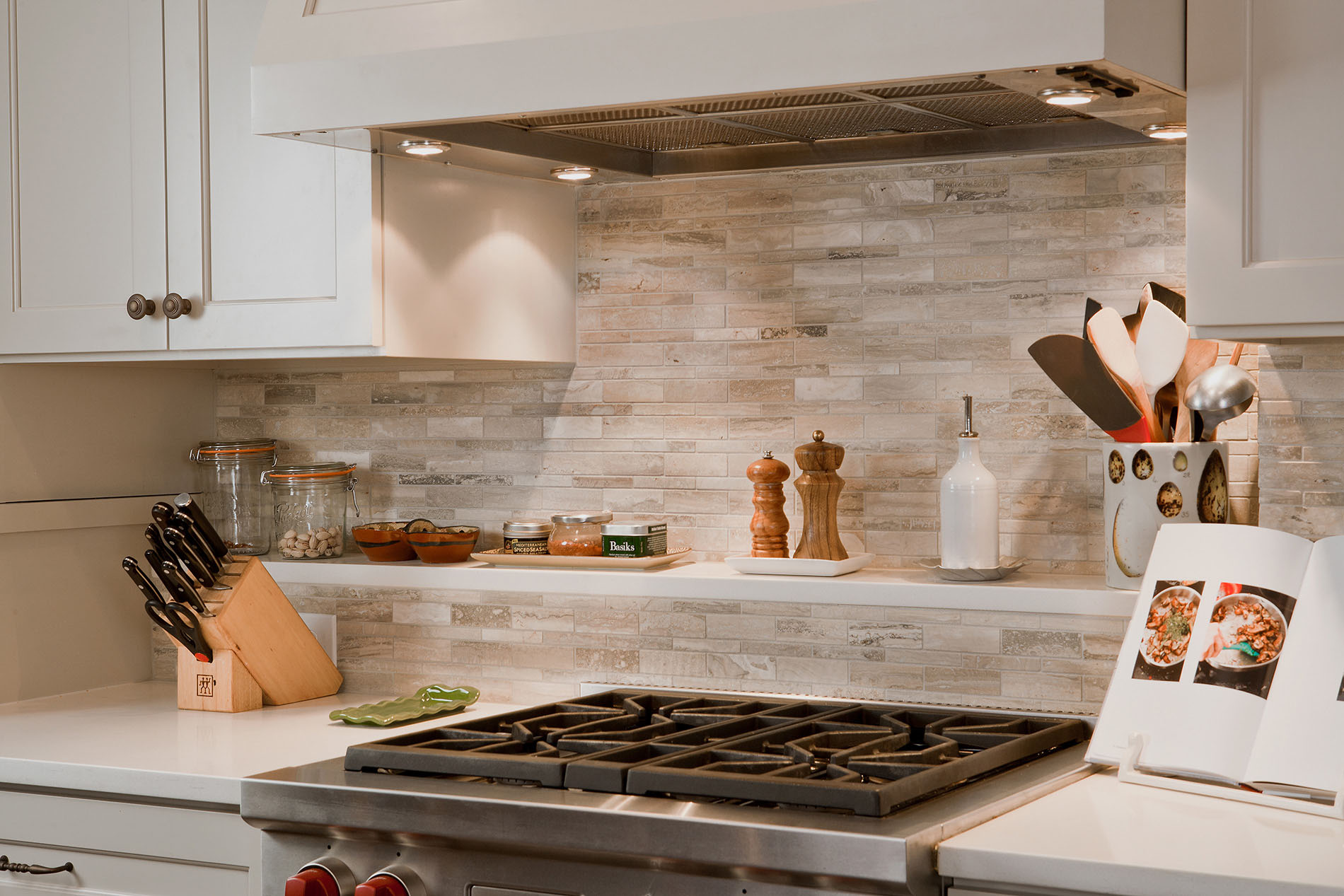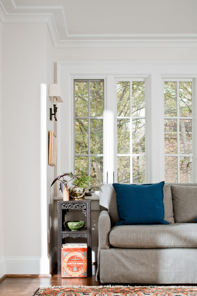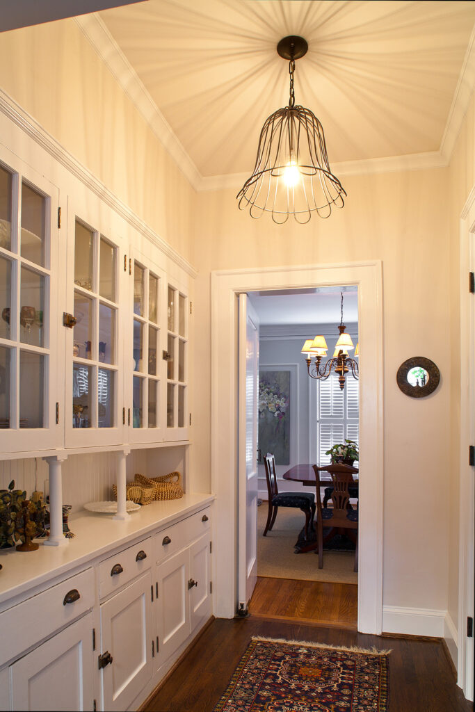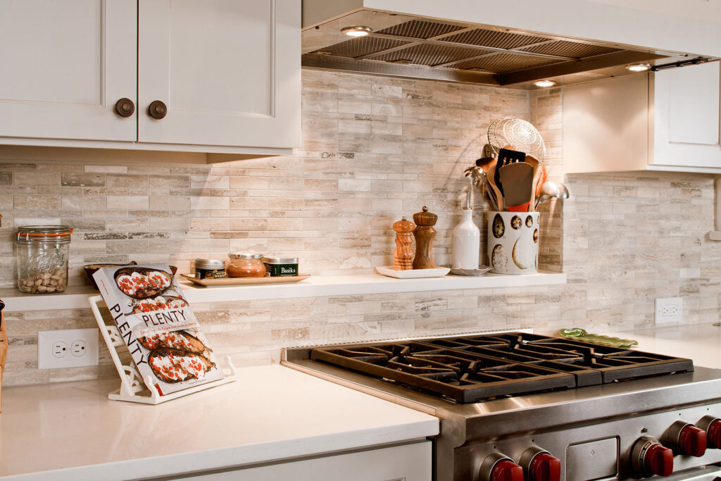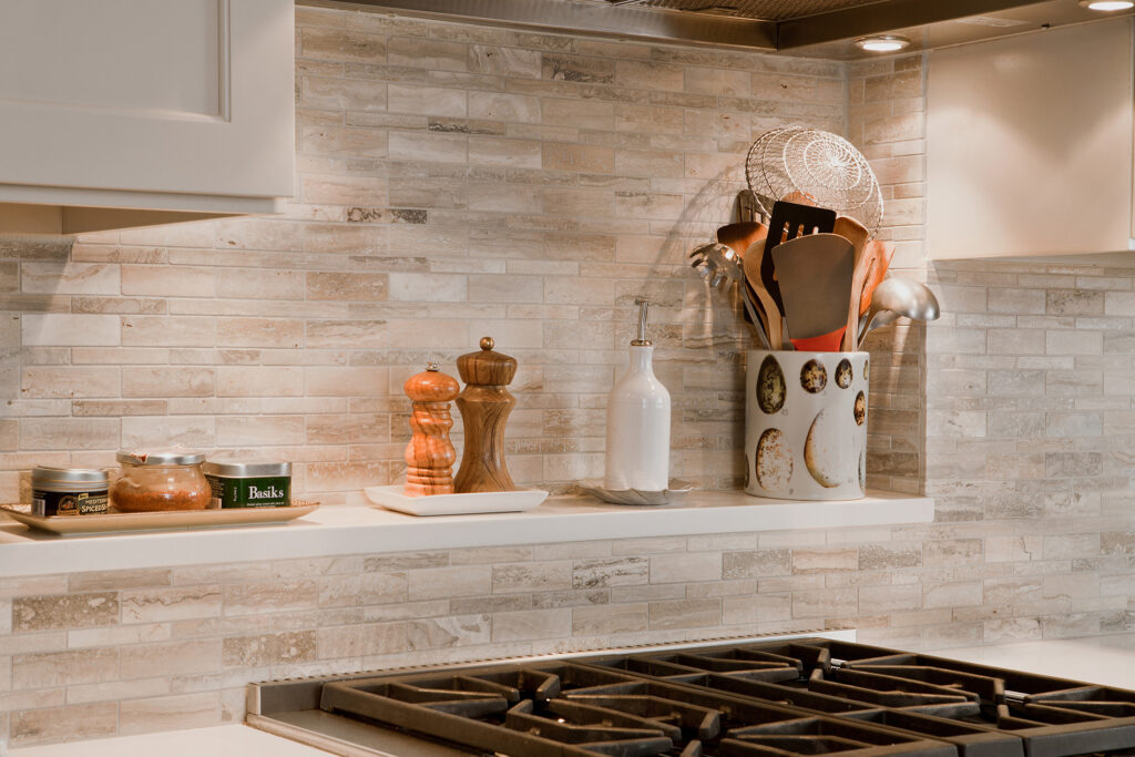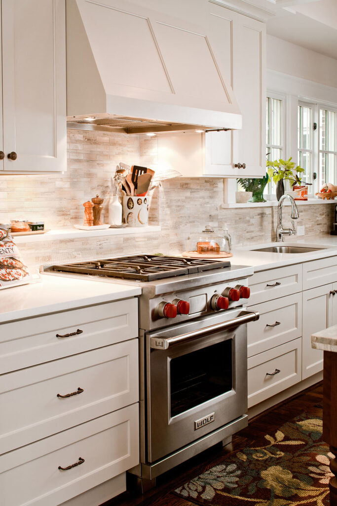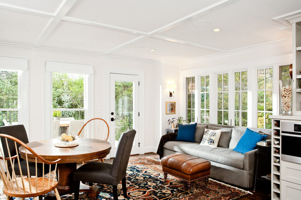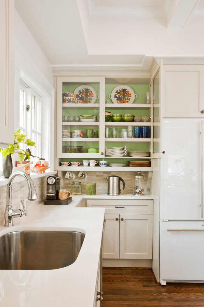 Frequent entertainers, these homeowners wanted a multifunctional kitchen with integrated living space. To do this, the kitchen peninsula and walls were removed, opening up the area and enabling us to create a multifunctional kitchen with a drop zone and coffee and wine stations. We did this by incorporating detailed elements, such as: the display cabinet, wine storage, sitting area, and the furniture–like design of the island. The contrasting ceiling heights posed a challenge, but as a result of careful detailing and trim work it is now a cohesive, interesting feature of the new kitchen. The homeowners now enjoy a bright, modern kitchen with a seamlessly integrated living area.