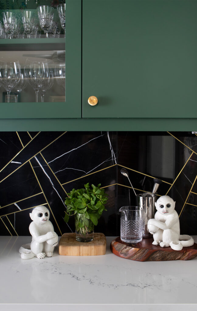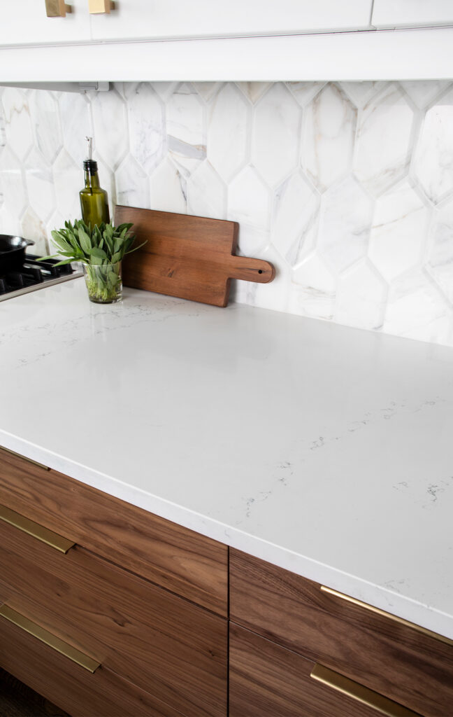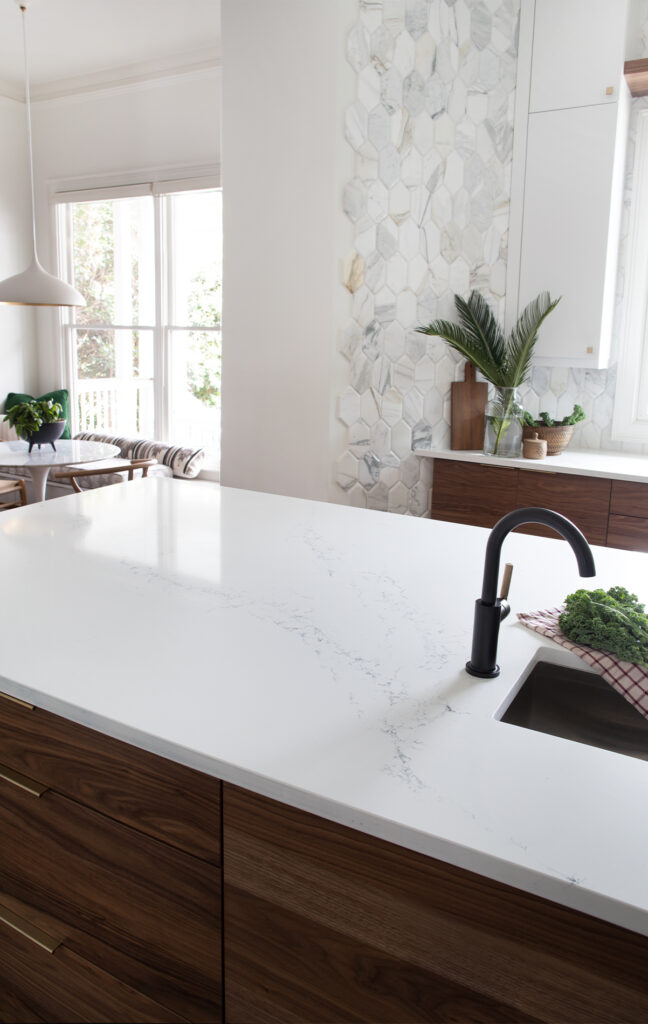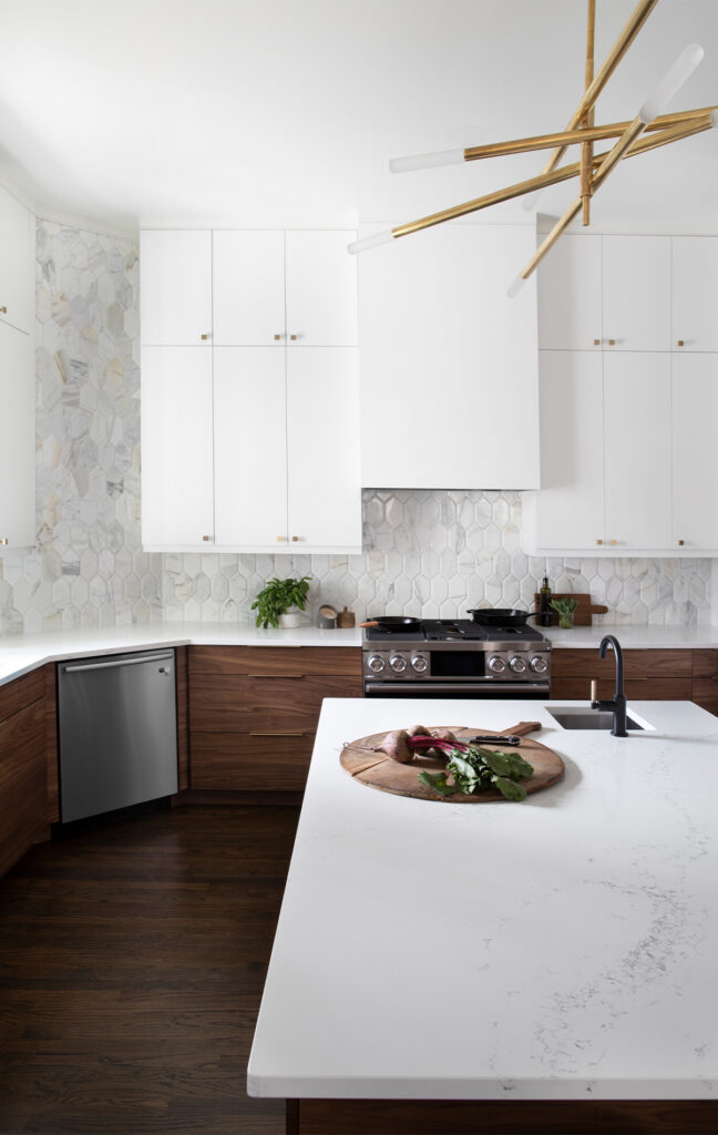 The design stayed within the existing footprint but created an open, functional, and airy space. A large island with fantastic storage and adequate seating anchors the room, while beautiful hexagon tiles from the countertop to the ceiling add texture and detail without overwhelming.