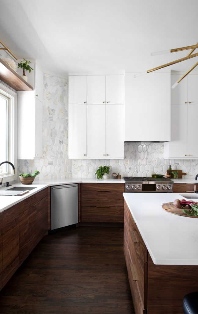 The light palette is balanced with rich walnut base cabinets, glowing gold hardware and black plumbing fixtures.