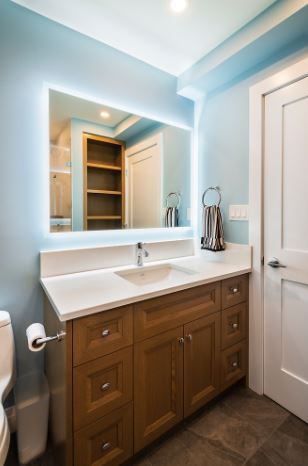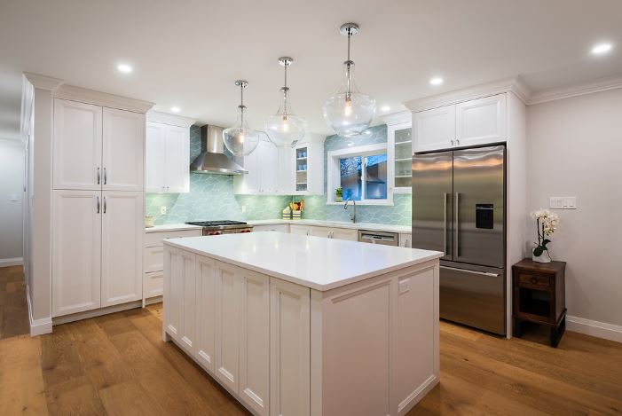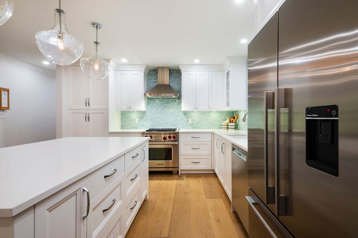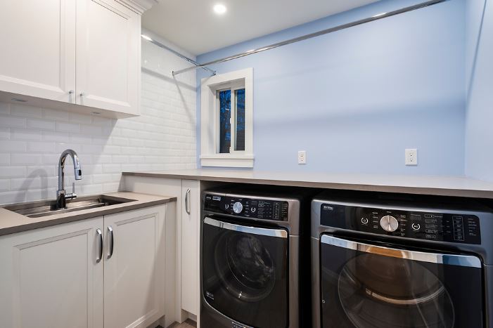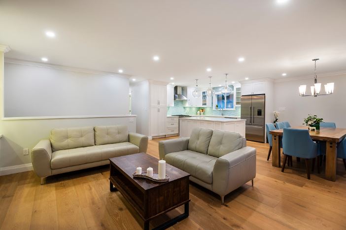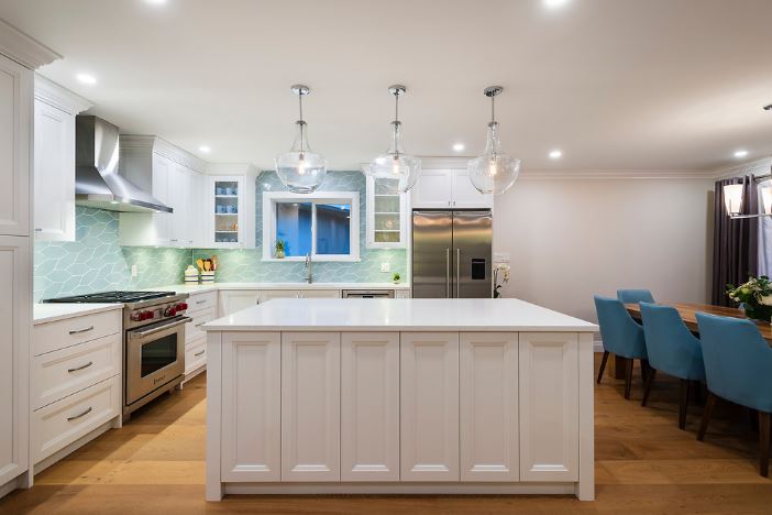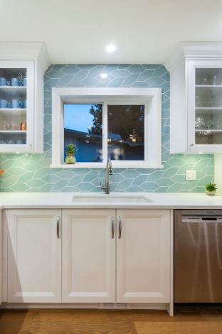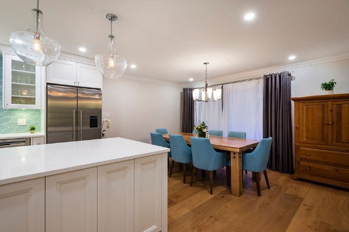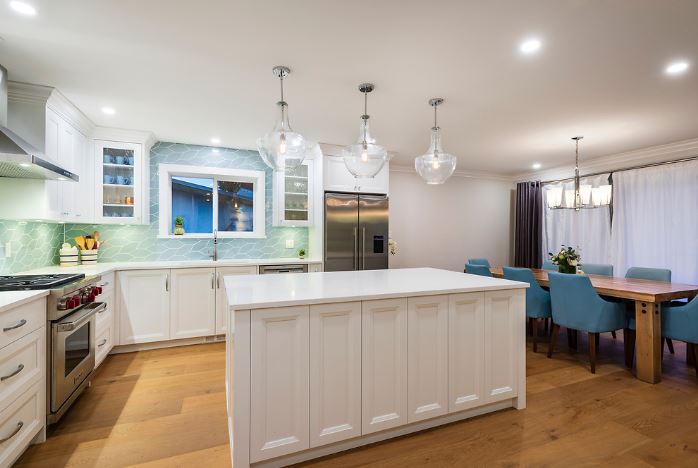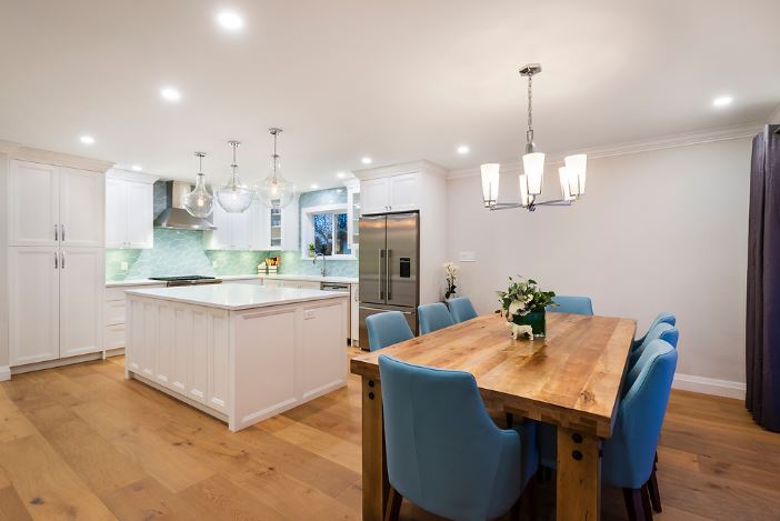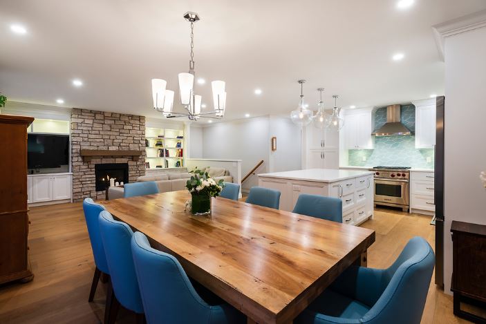 This was a major home renovation with modern updates to the kitchen, dining room, and living room. The kitchen features a handcrafted tile backsplash, giving the kitchen a unique flair. The open concept layout gives the space a more open feel. Sarah Gallop Design provided the extensive and impressive design.