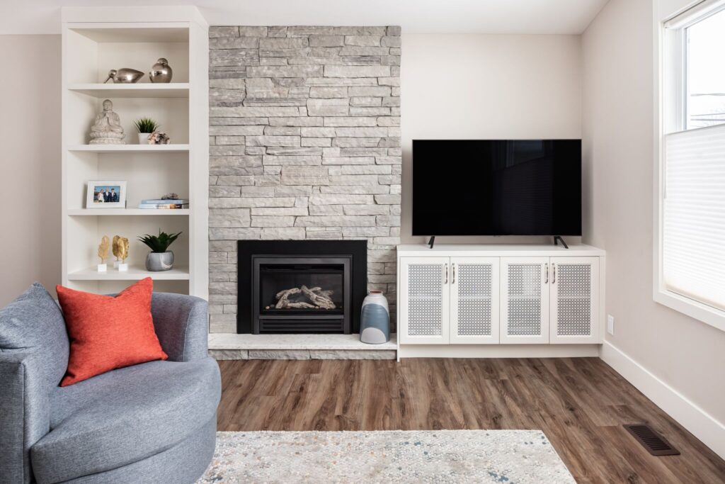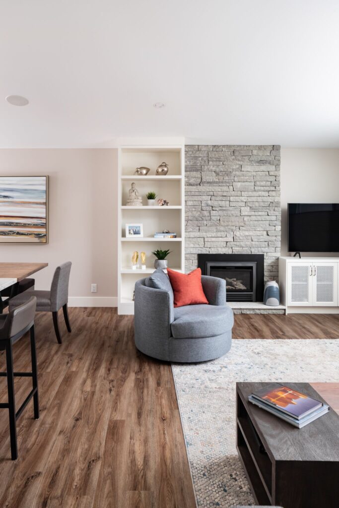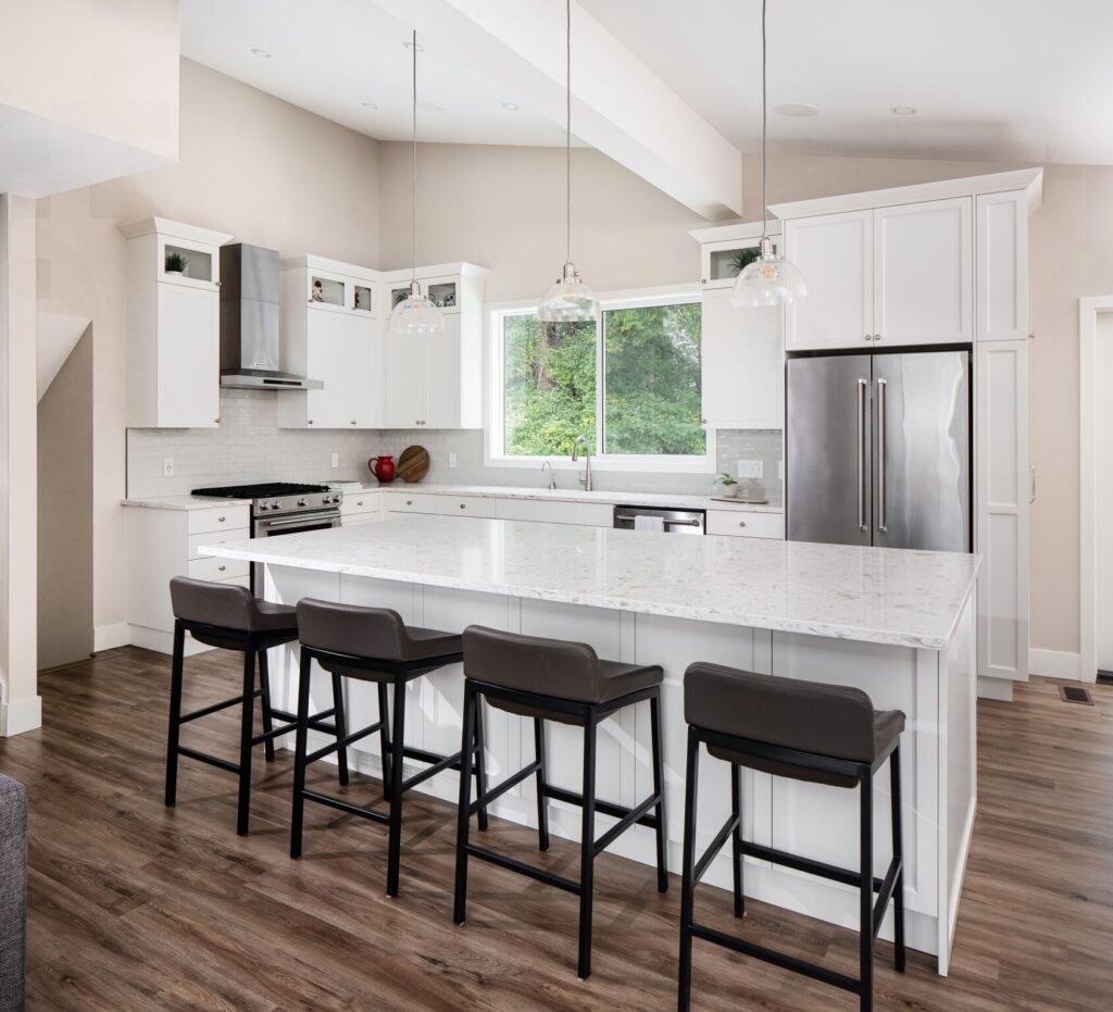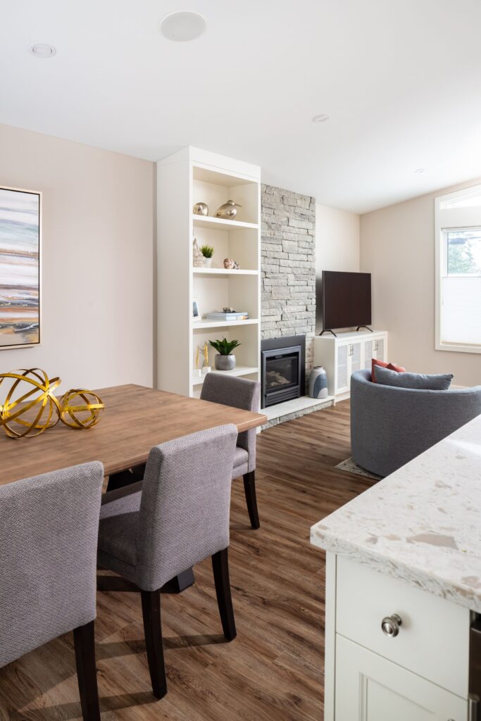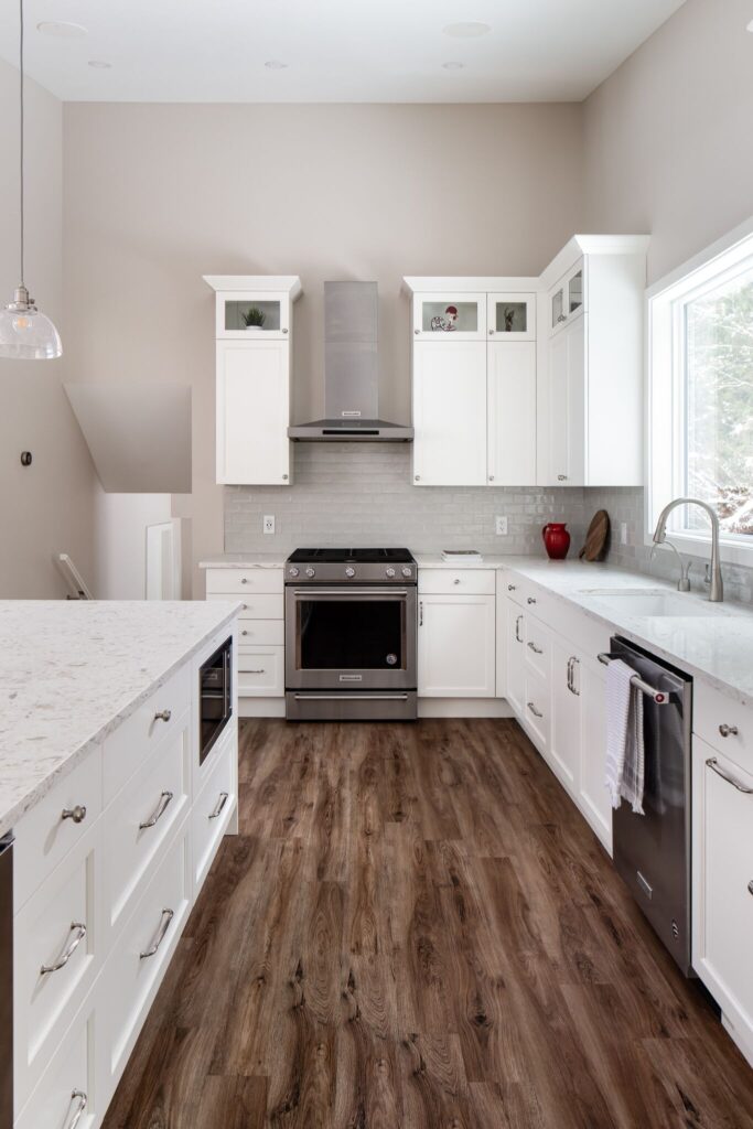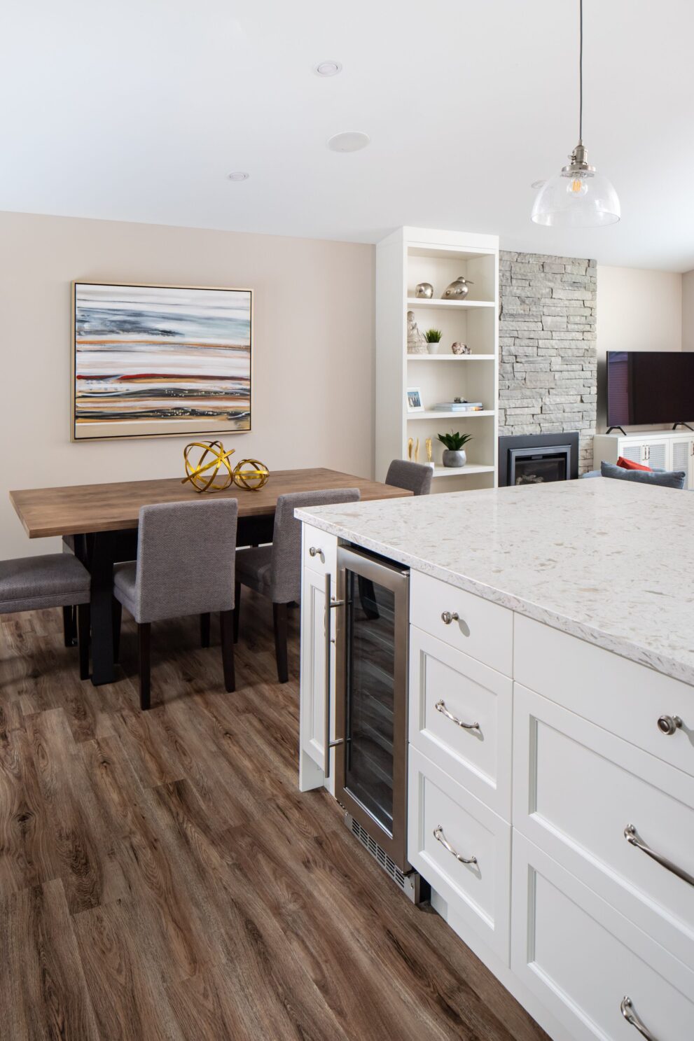 This home had a major facelift with a new front entry, doors, windows & siding. The main floor was completely opened up to take full advantage of the large gathering space and vaulted ceilings. The renovation also included enclosing their under deck space to turn into a proper laundry room and home gym area.