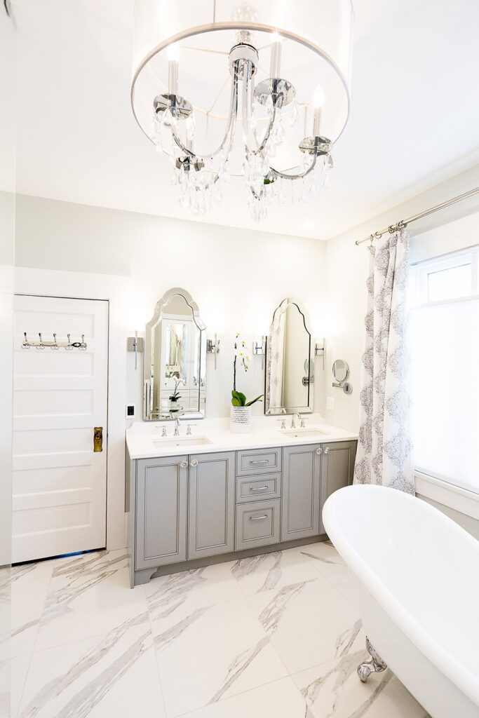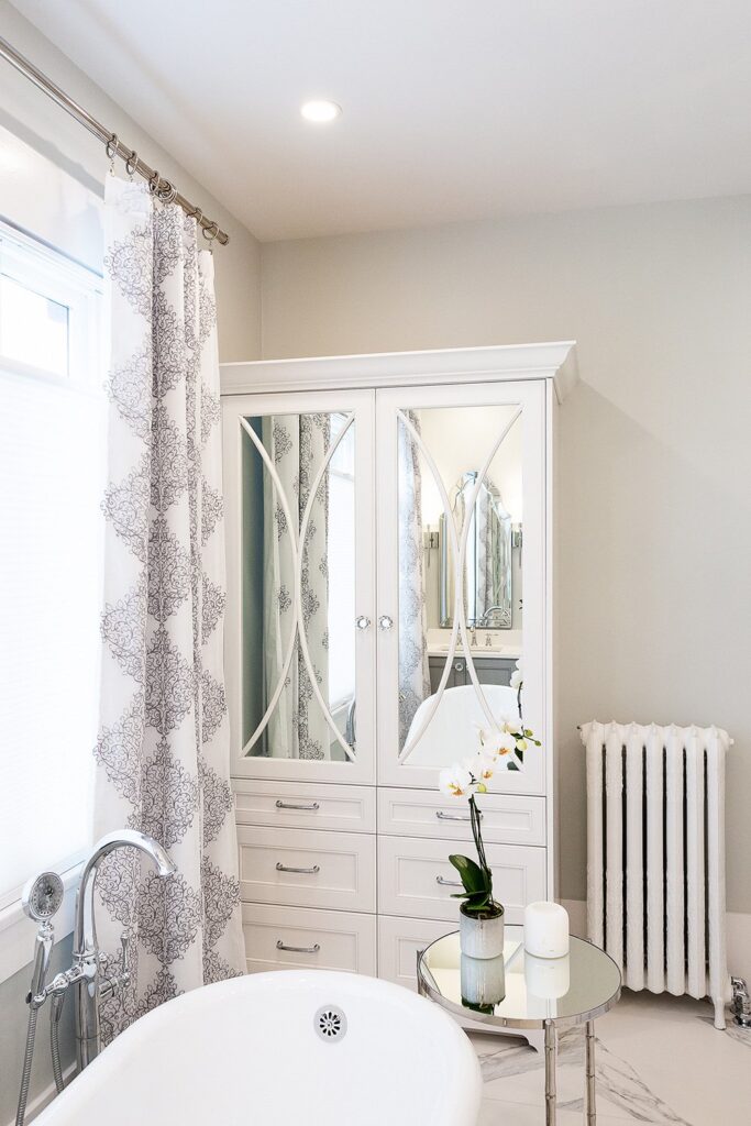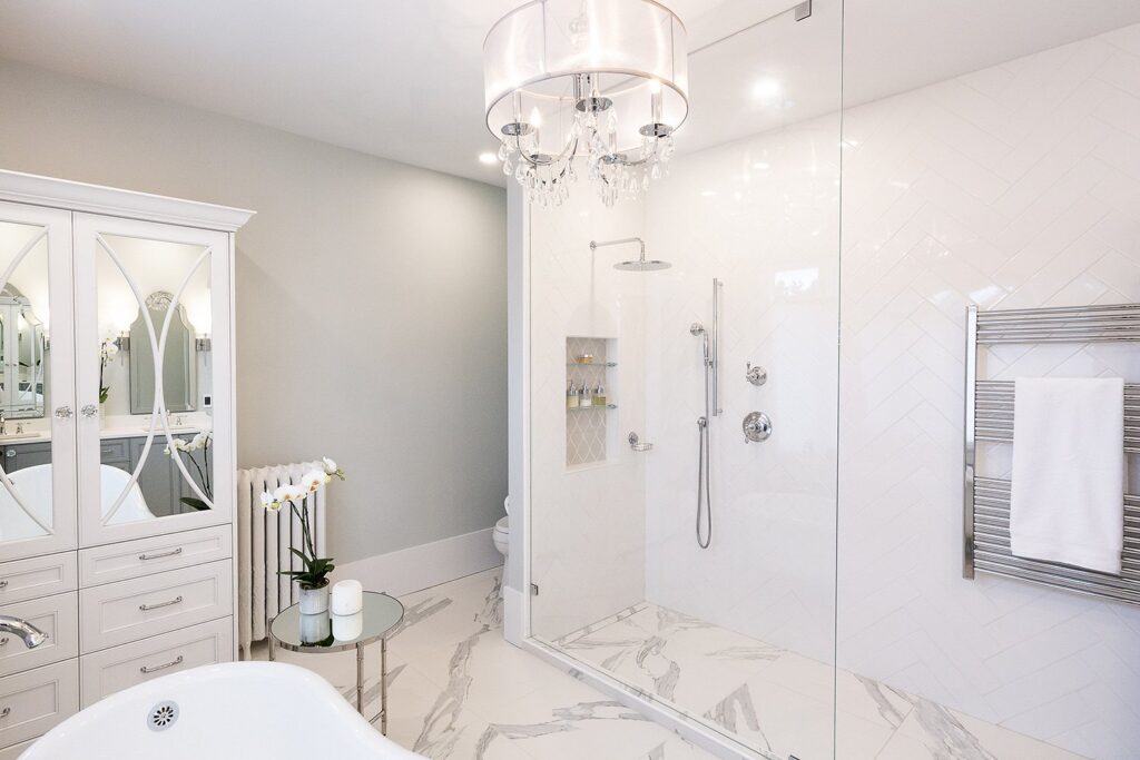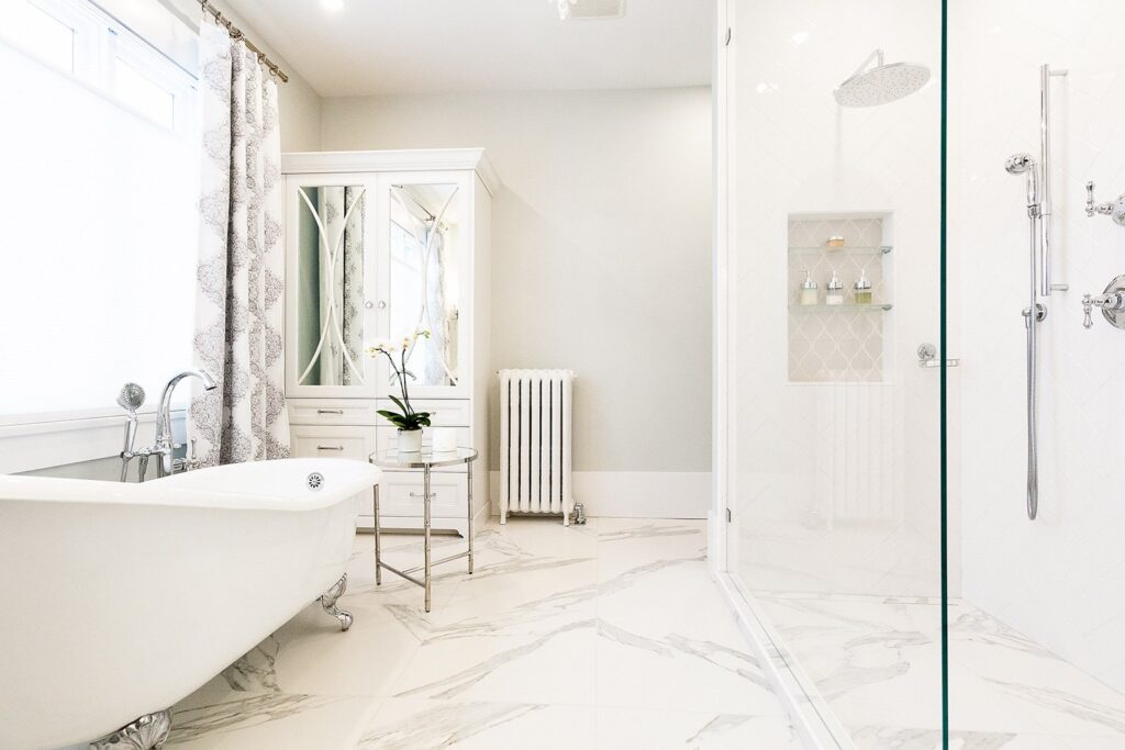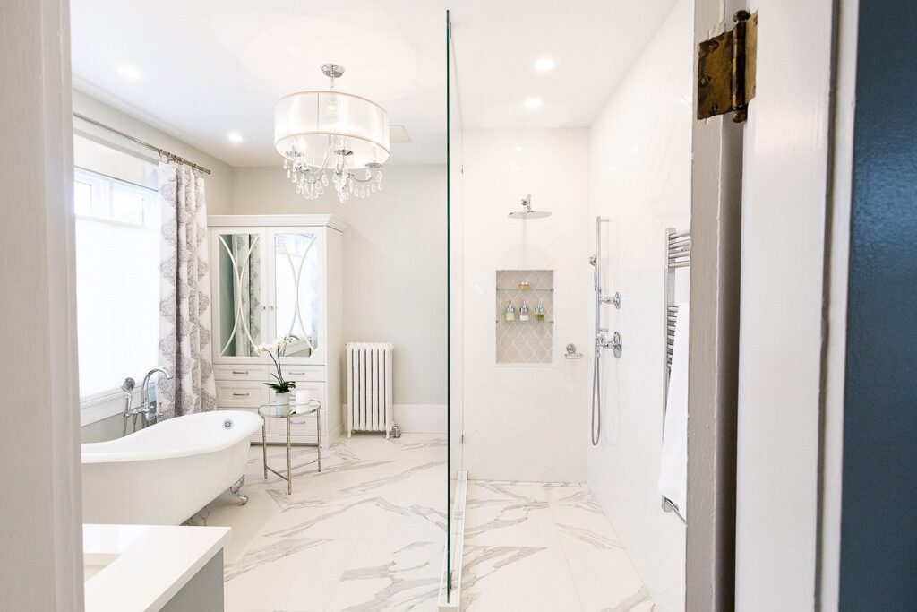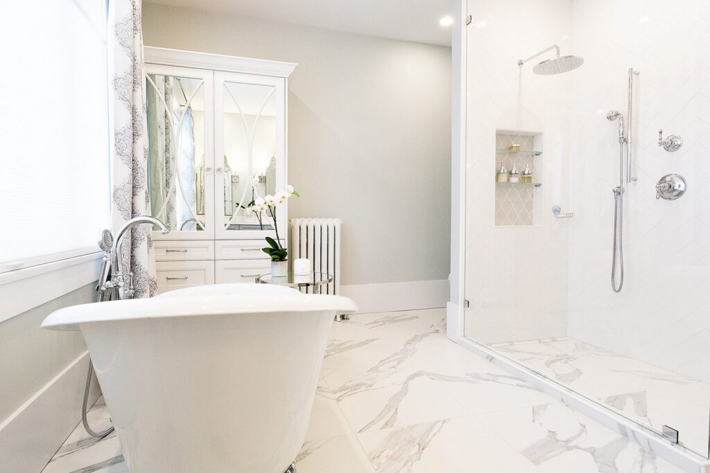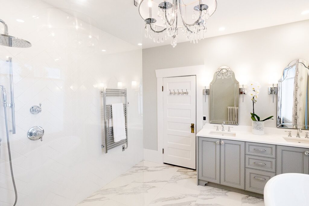 This bathroom renovation brings a modern and luxurious feel to this heritage home. Featuring a double vanity, mirrored cabinet, and elegant spa-like tub – this bathroom is the perfect place to relax and recharge.