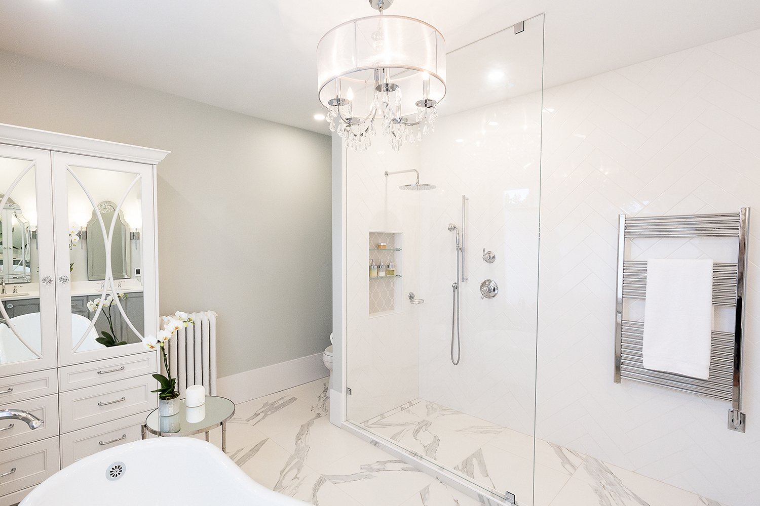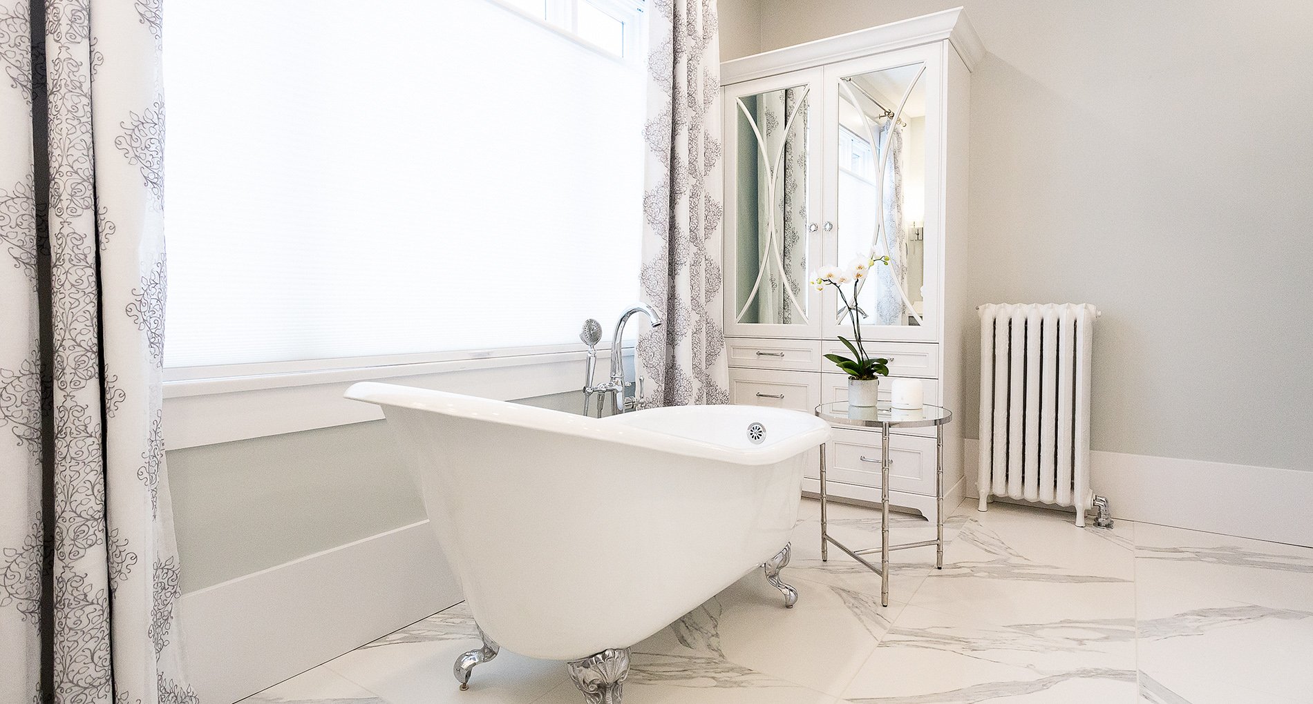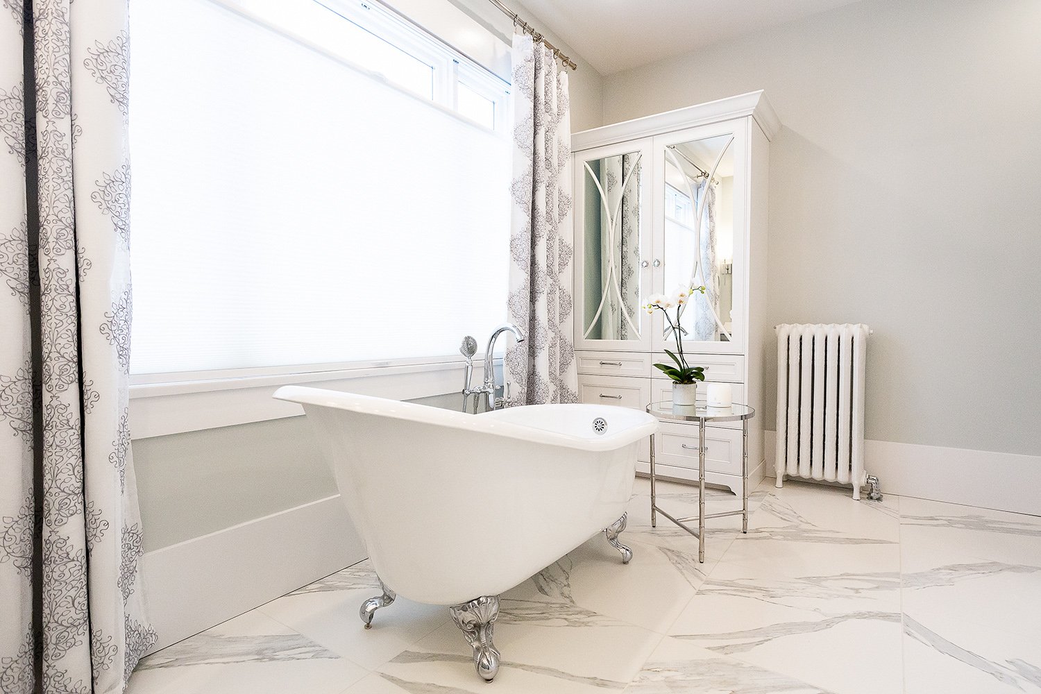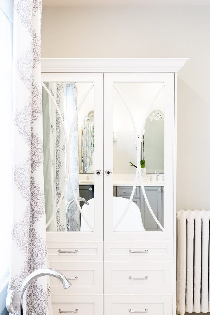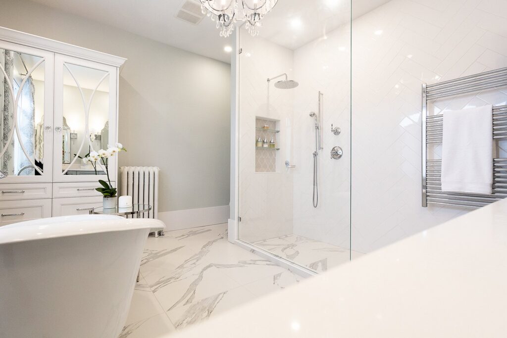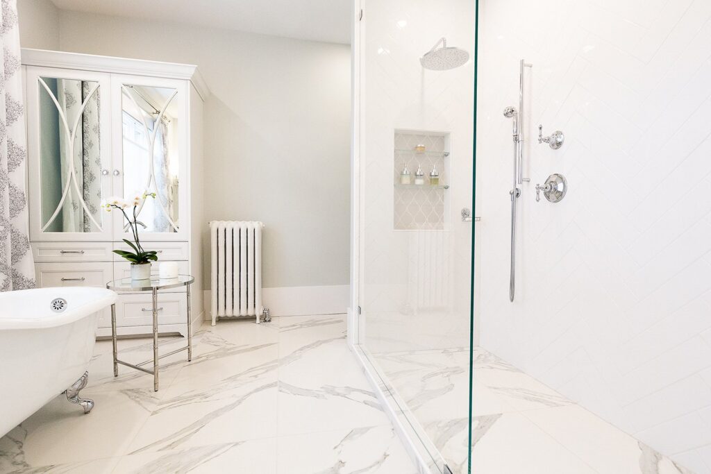 This bathroom renovation brings a modern and luxurious feel to this heritage home. Featuring a double vanity, mirrored cabinet, and elegant spa-like tub – this bathroom is the perfect place to relax and recharge.