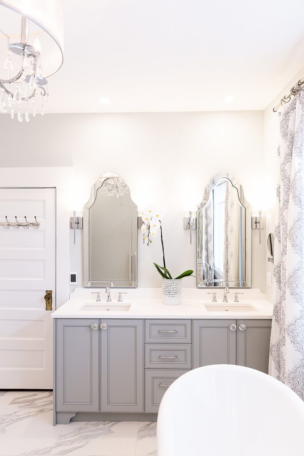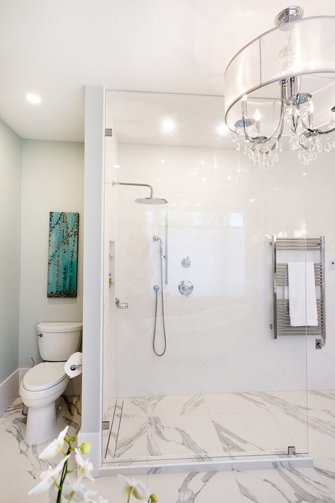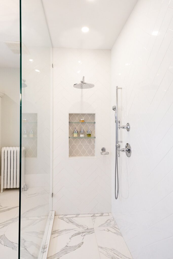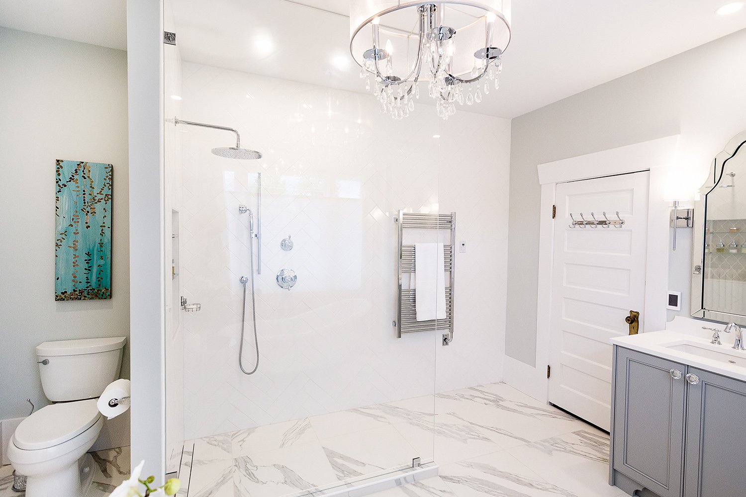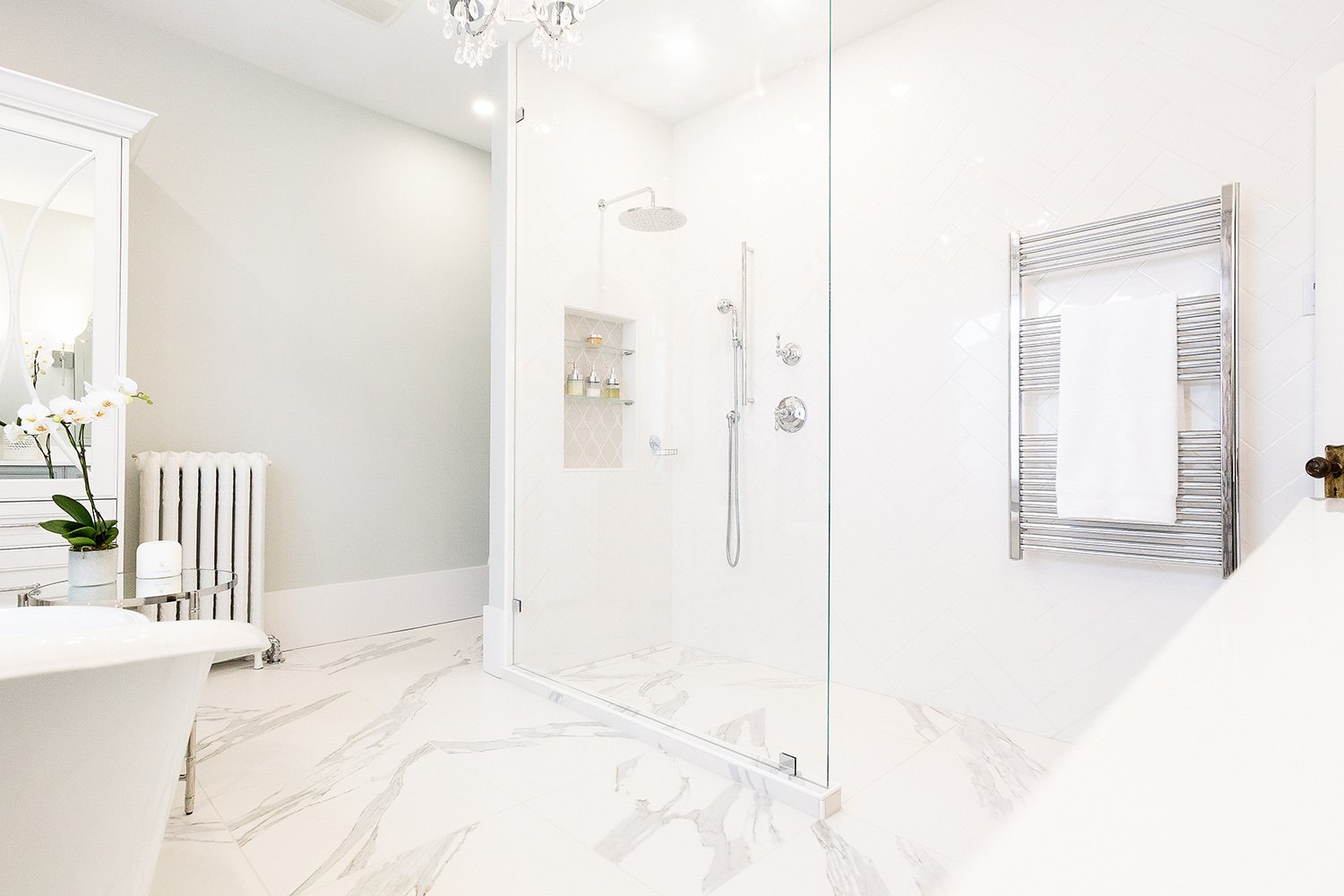 This bathroom renovation brings a modern and luxurious feel to this heritage home. Featuring a double vanity, mirrored cabinet, and elegant spa-like tub – this bathroom is the perfect place to relax and recharge.