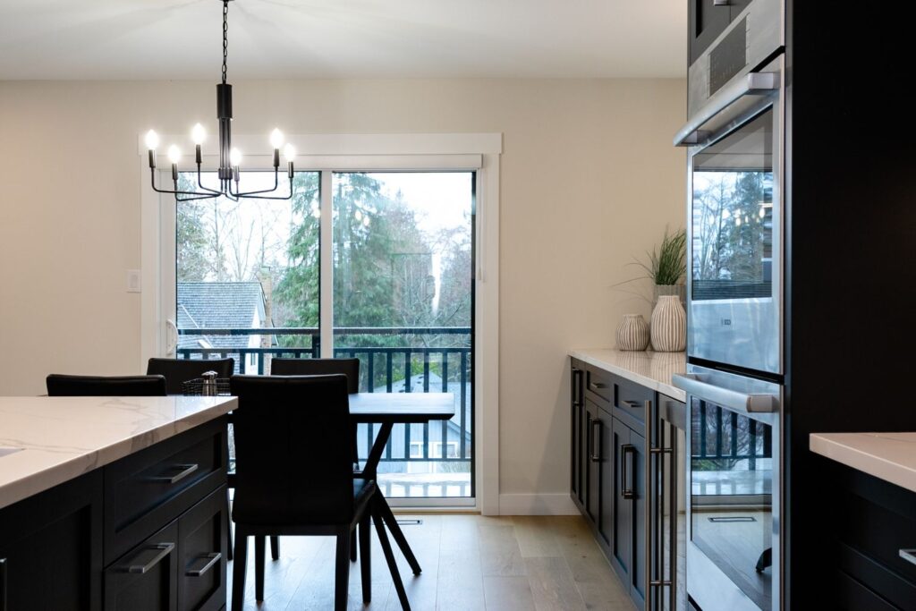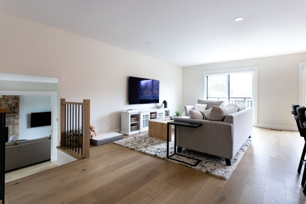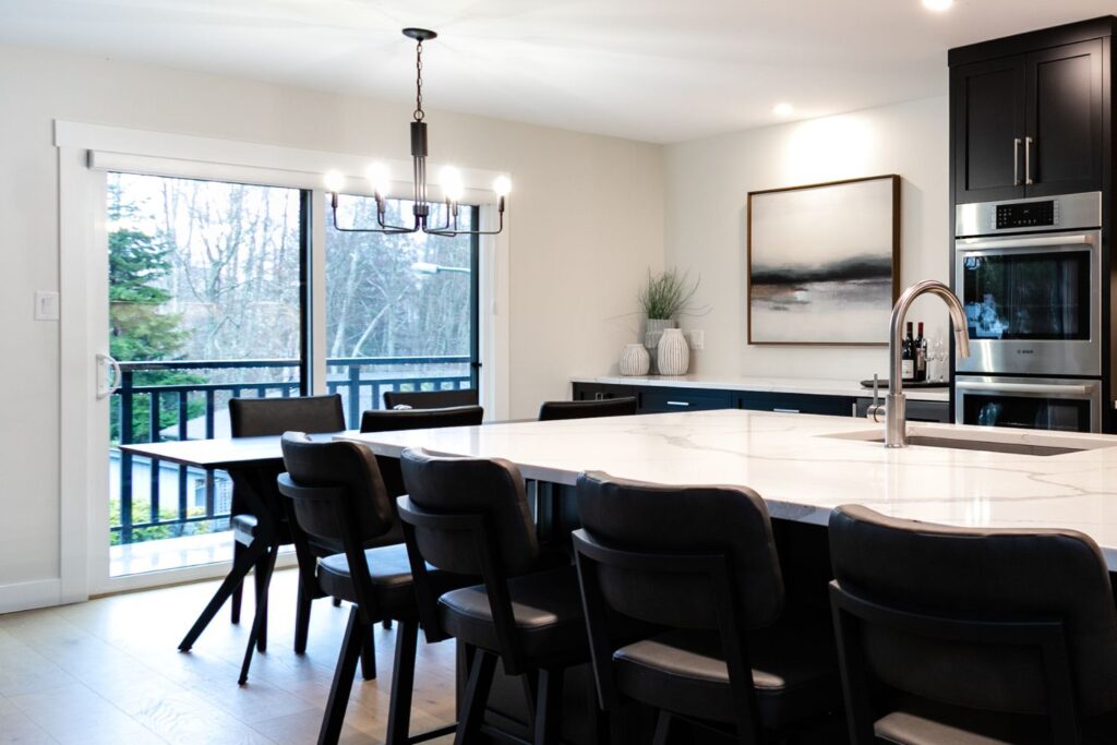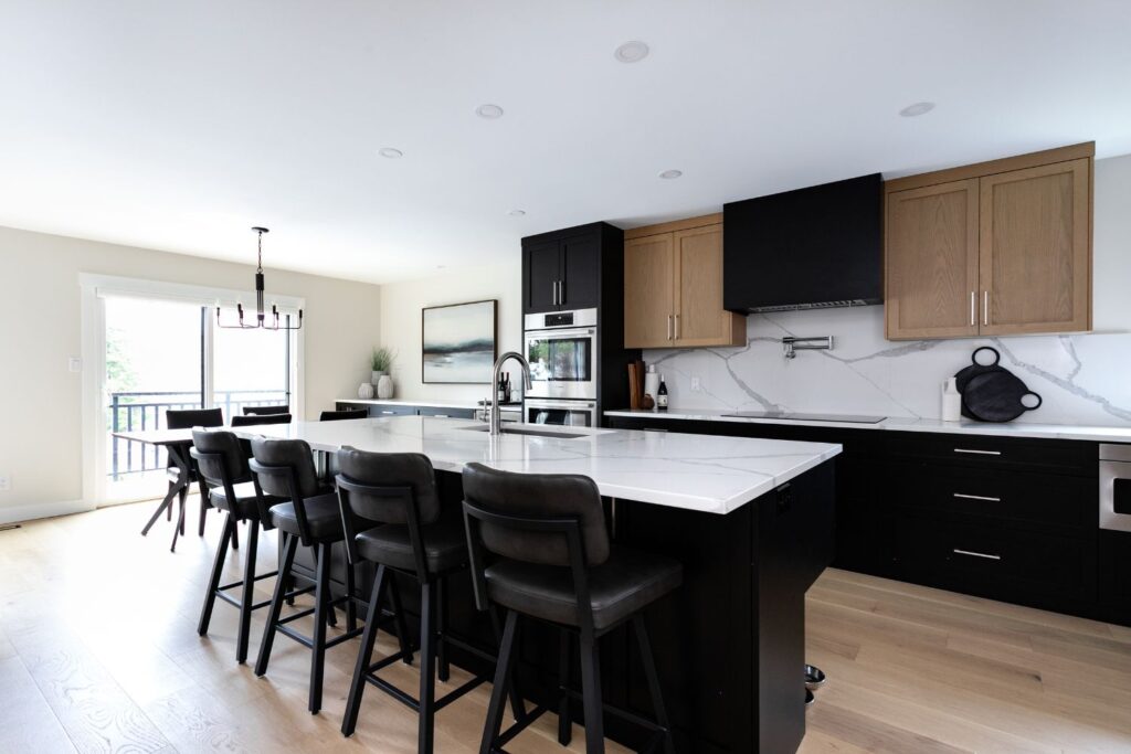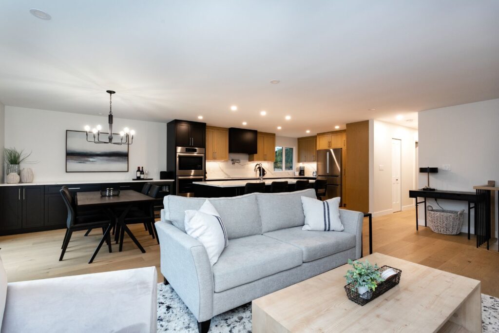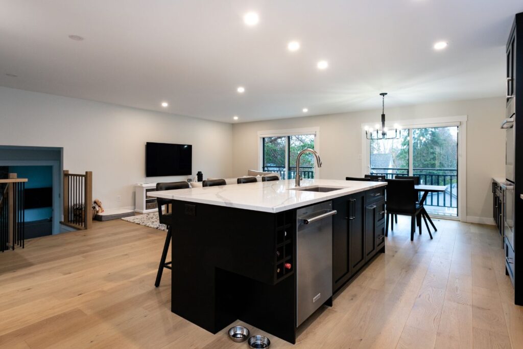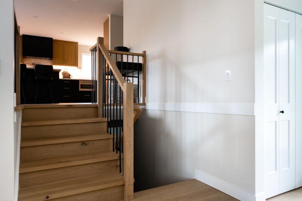Whole home renovation, including connecting the existing living room and kitchen space to create a new “great room”, renovations to the main bathroom and en suite, new flooring, paint, as well as new finishes to the exterior including new paint, balcony railing, windows and doors.