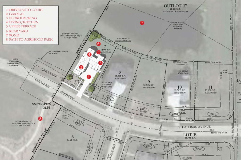Presenting 3651 Callison Ave. at Great Western Crossing. Enjoy a relaxed setting in Iowa’s first Agrihood. Middlebrook is a unique community that combines agricultural traditions with distinct and architecturally rich neighborhoods. Amenities include a farm-themed park and bike trails, in addition to the Mercantile and Iowa Distilling Co., which are a stone’s throw away. Summer events include Fridays at the Farm and feature live music and local vendors. The main floor features a glass entry way with vaulted living spaces and bonus office loft, as well as an outdoor entertaining terrace. The great room features a wall of windows overlooking the pond and rolling hills. The bedroom wing creates a private oasis. The primary bedroom suite boasts views of the pond and beyond. The lower-level concept includes a family room with full bar, access to the rear yard, and additional bedrooms. This is an amazing opportunity to explore the possibilities of a truly custom experience tailored specifically to your needs. We invite you to a collaborative design process with Alair Homes, Curran & Co. Architects and Jeid Studio.