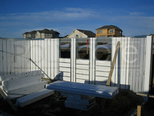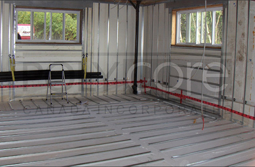 This new foundation system was designed and developed by Polycore Canada Inc. and uses “industry accepted 2 1/2″ galvanized structural steel studs, encased in 4″ builder quality type I EPS (expanded polystyrene) rigid insulation provided in standard size sections. In combination, these components provide the strength and properties that easily replace a traditional concrete foundation floor for all residential applications. Each Polycore Floor System is mapped out and designed for easy installation.”