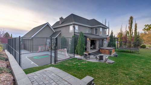 Hockey-ready boards can be erected on the perimeter, with netting installed 12 feet higher on top. This will keep any stray balls or pucks from ending up in your living room via the picture window. Chain link fence can also be a good option if hockey is not the game of choice, that way sight lines are a lot clearer.