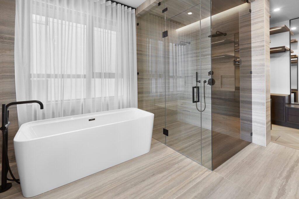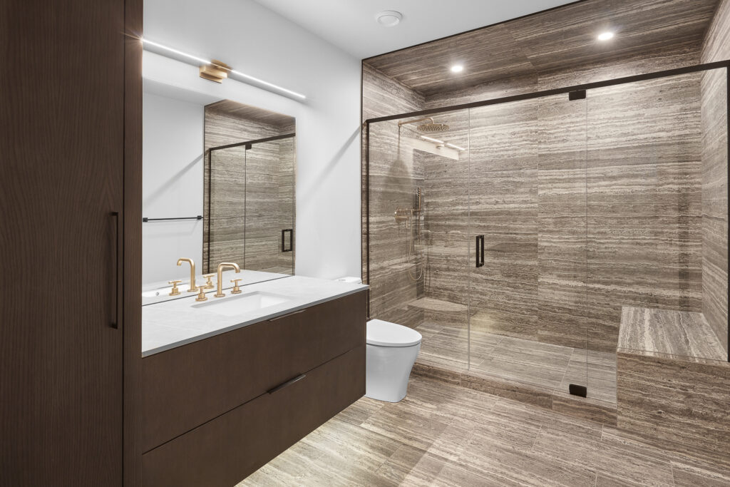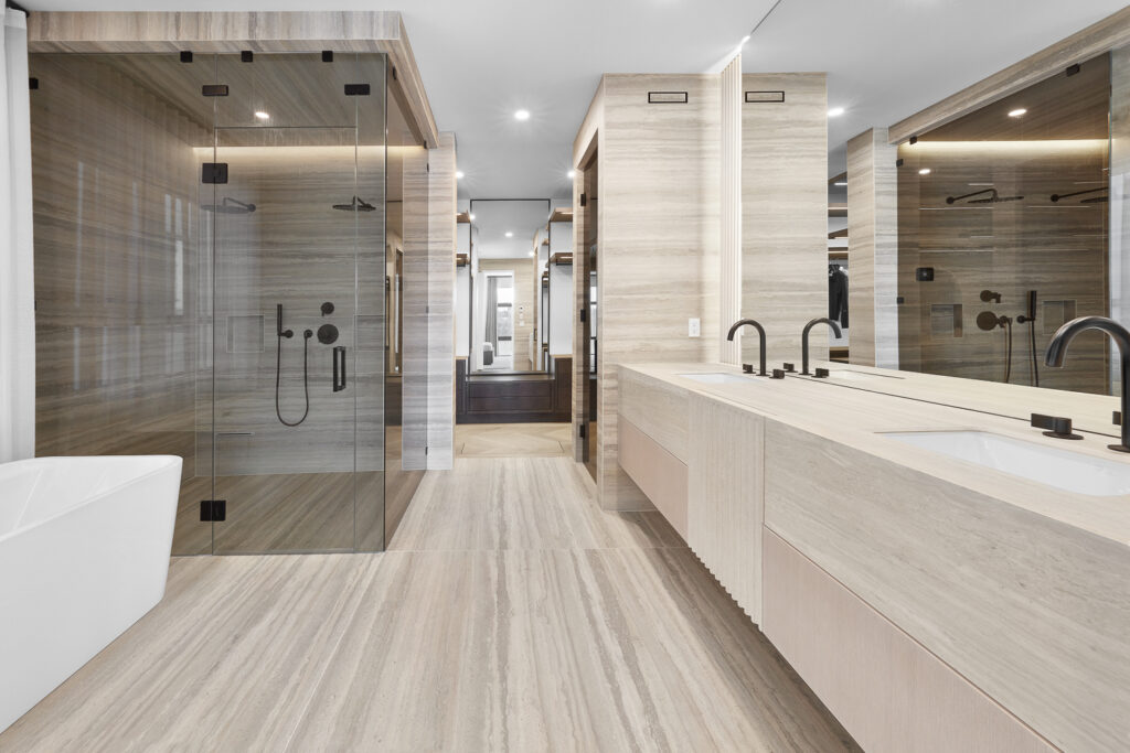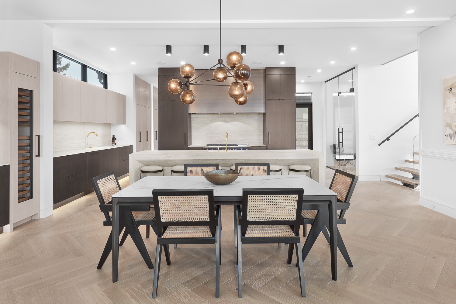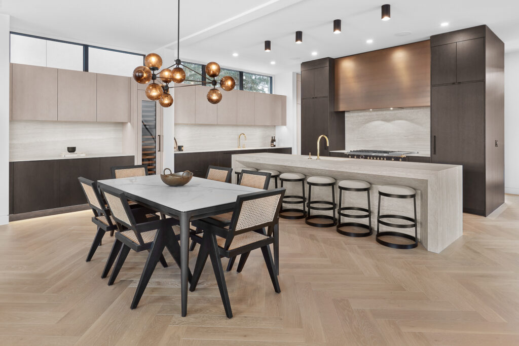 The overall design intent into this house was details you don’t see in Western Canada. Inset wall plugs so you don’t see the them, flush baseboards throughout, inset copper board in the engineered hardwood, riff cut white oak cabinets, and Neolith porcelain from Spain.