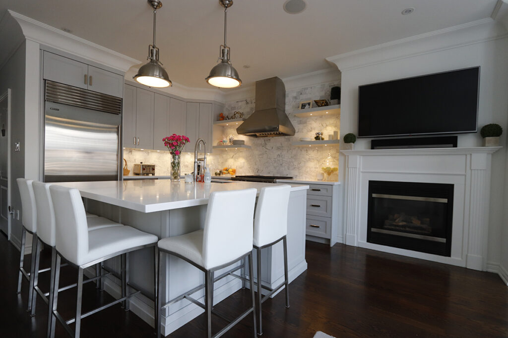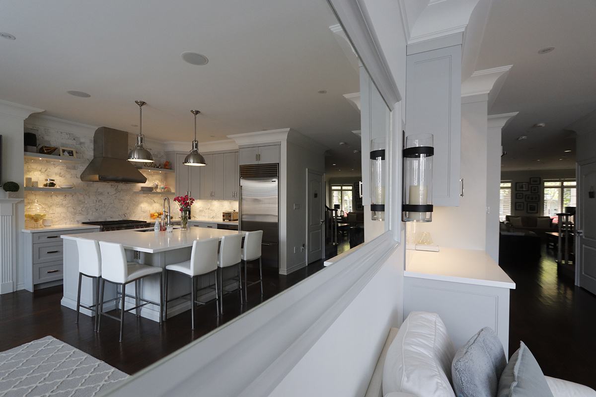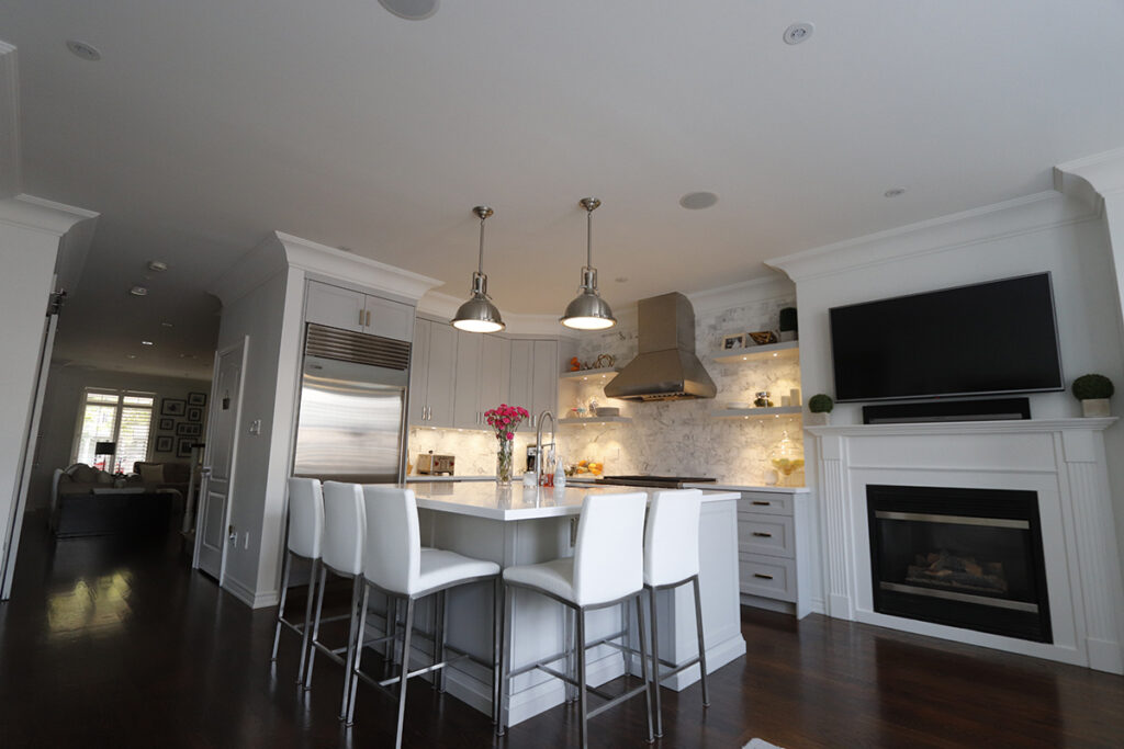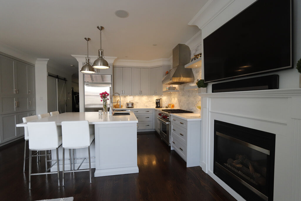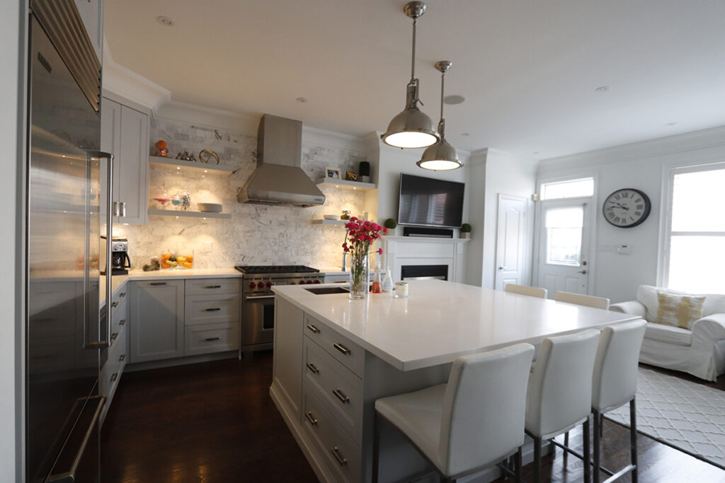 This contemporary Kitchen Renovation was completed in only nine weeks, with a bright neutral color scheme and modern furnishings. The kitchen is included in an open layout with a partial divider to keep a sense of privacy in the living room.