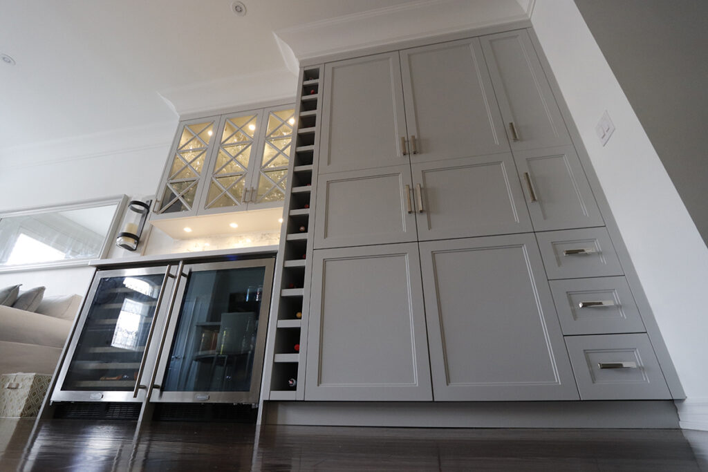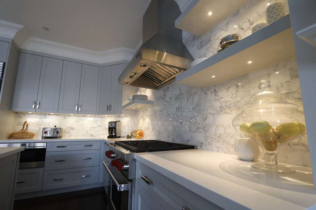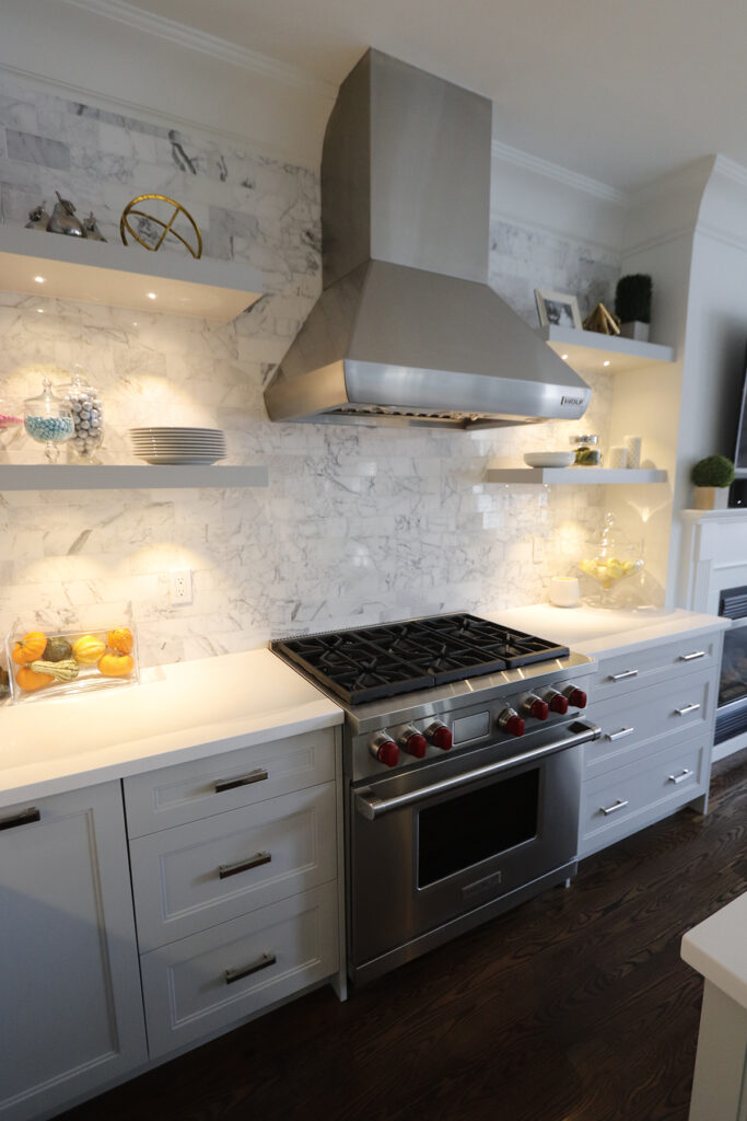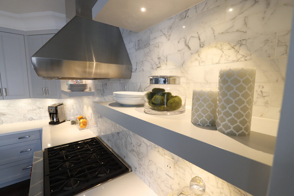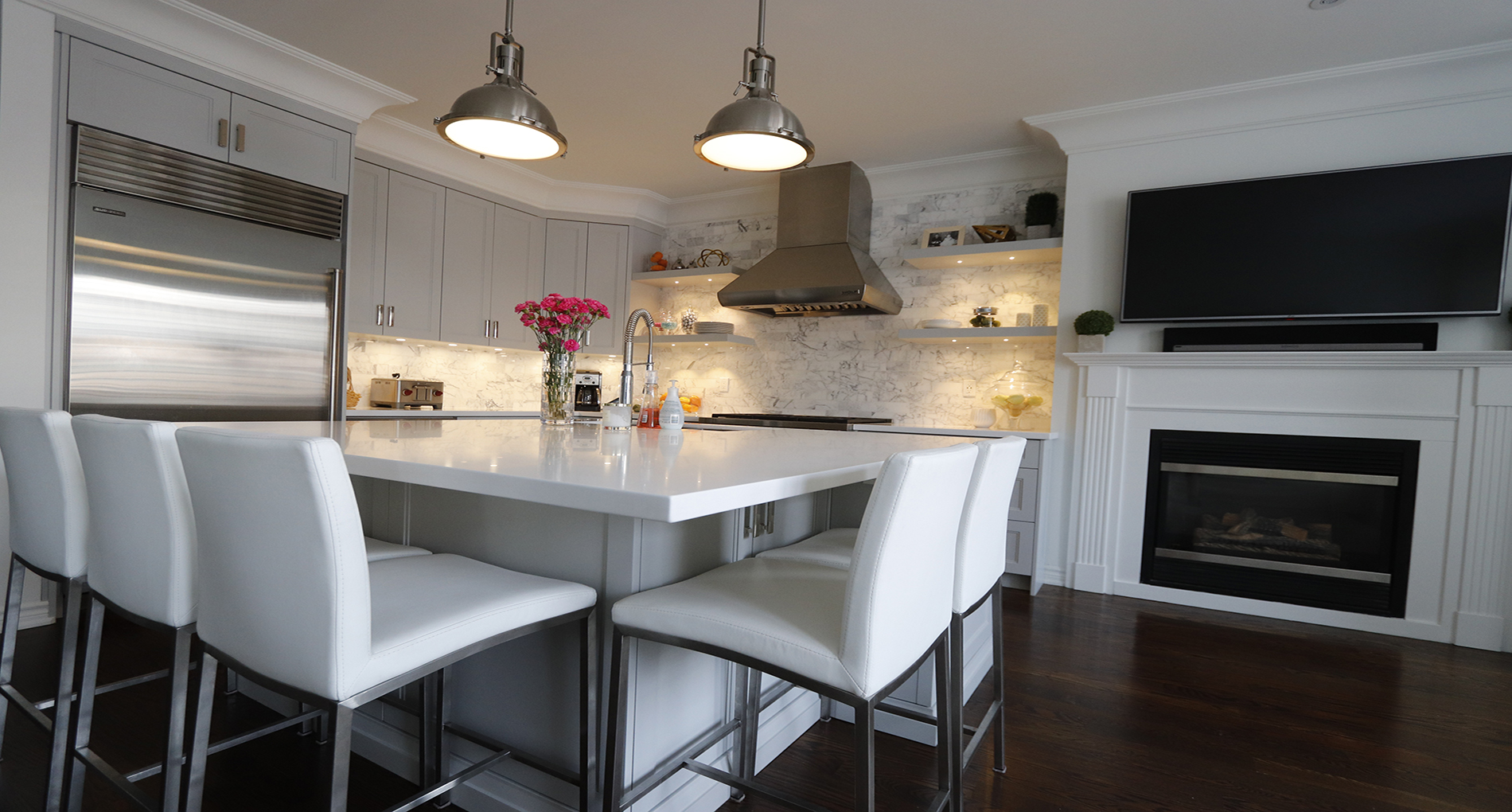 This contemporary Kitchen Renovation was completed in only nine weeks, with a bright neutral color scheme and modern furnishings. The kitchen is included in an open layout with a partial divider to keep a sense of privacy in the living room.
