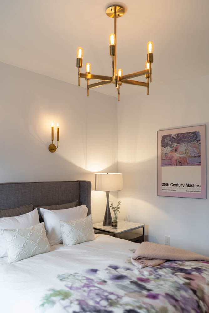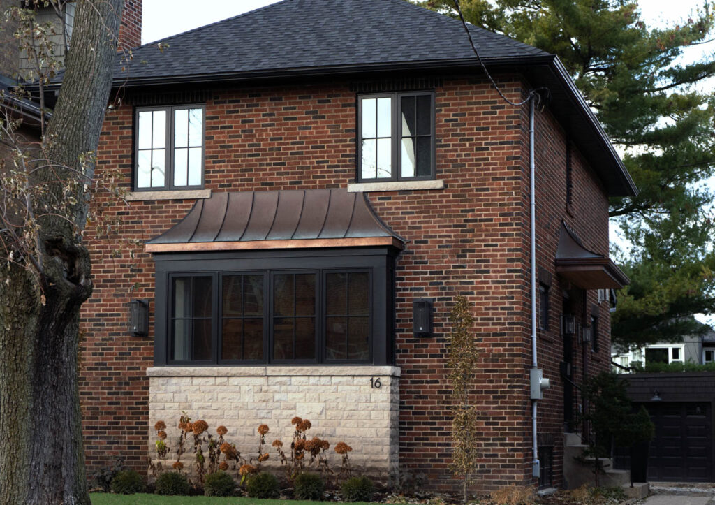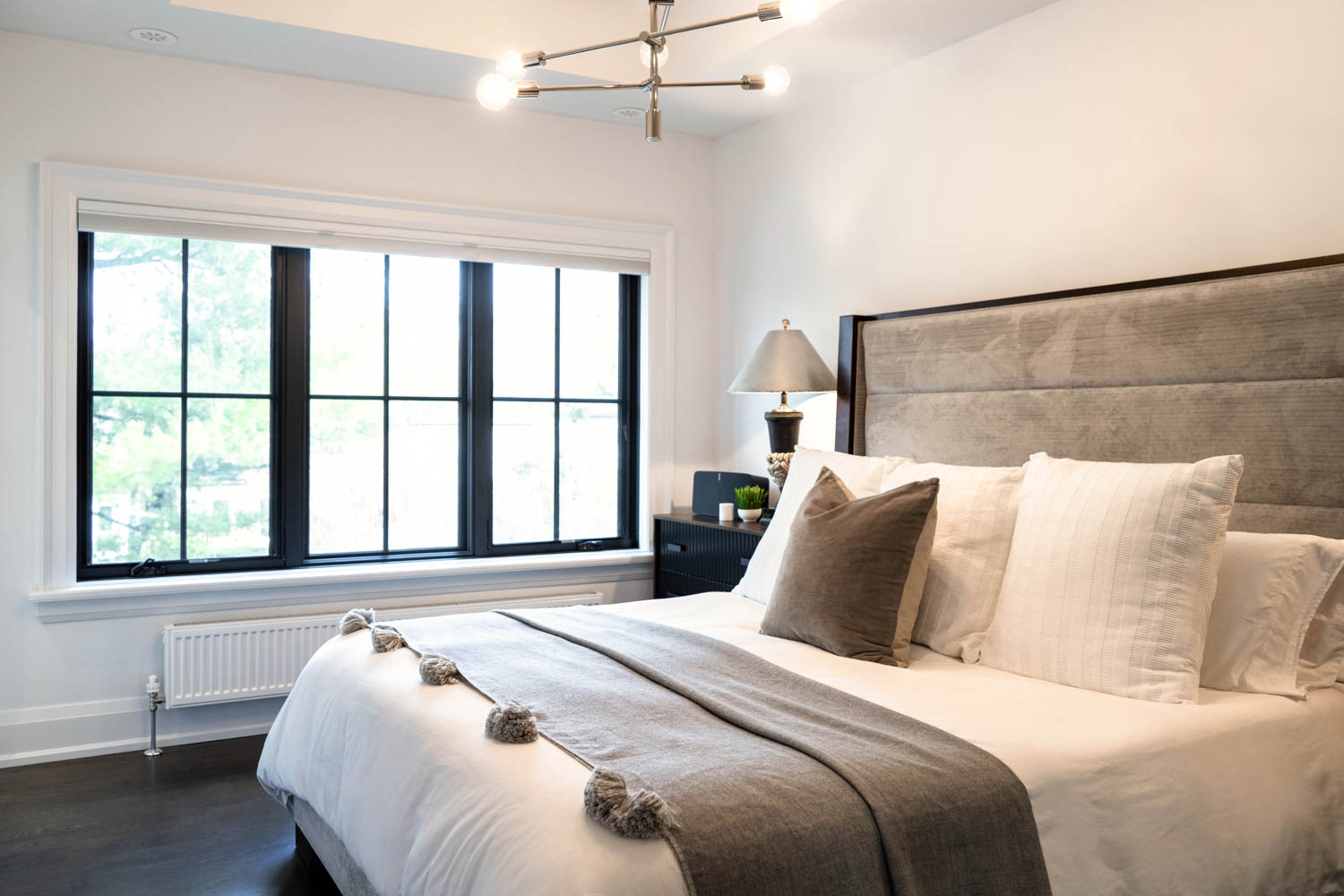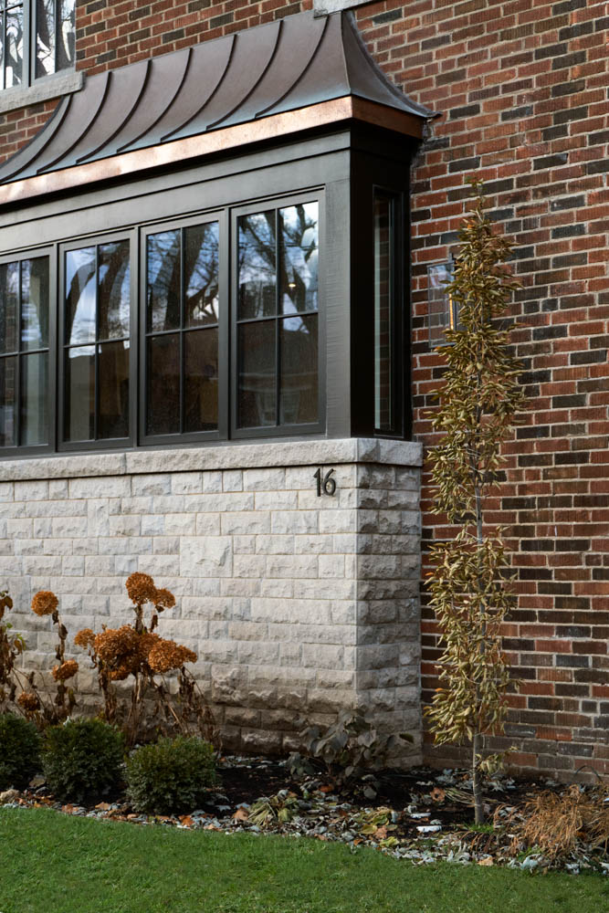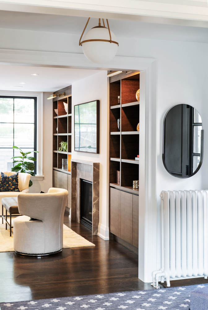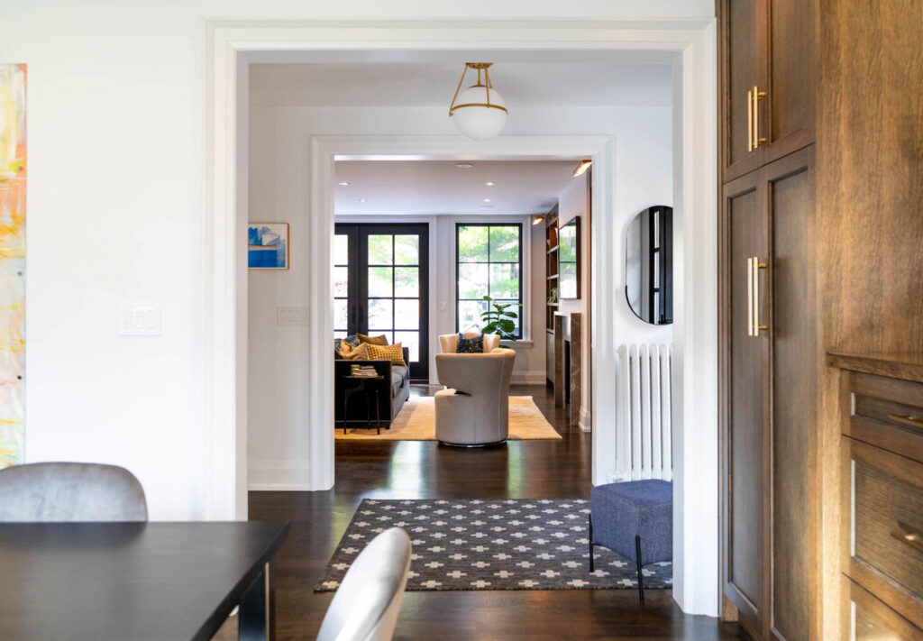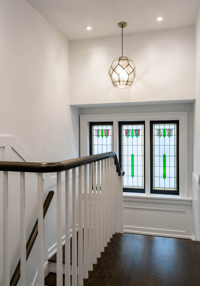 This major renovation and addition features an open concept kitchen and living room, with a seated kitchen island and distressed wood drawers. The stained glass windows of this home were preserved.