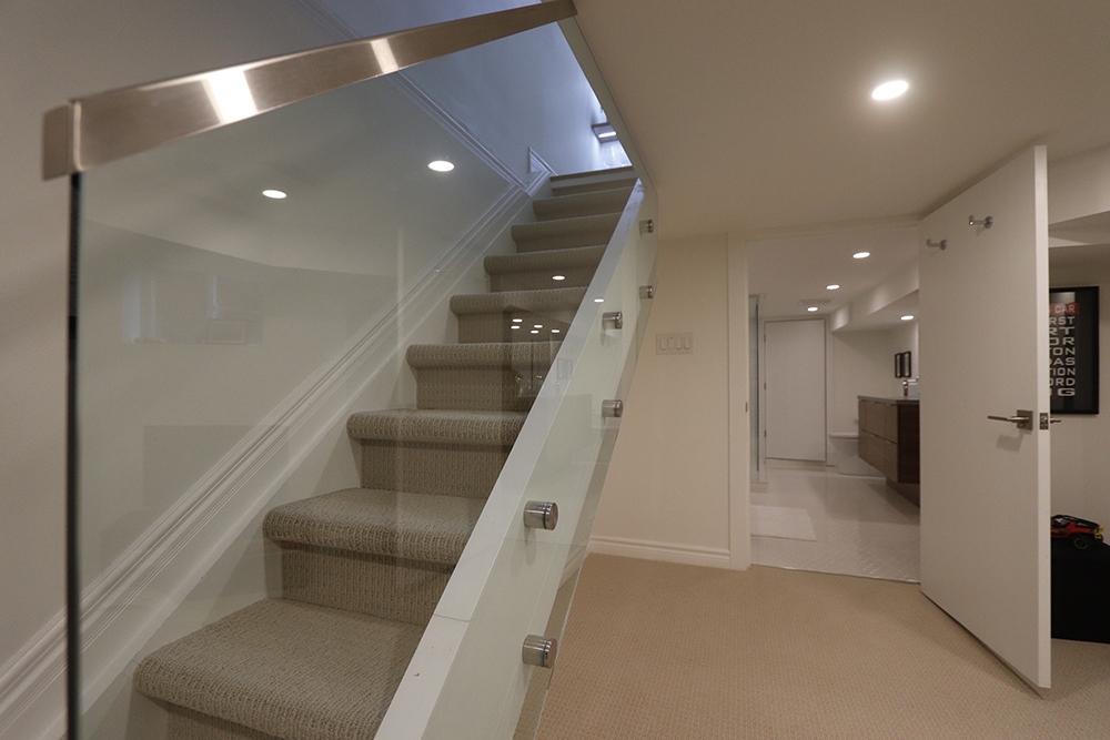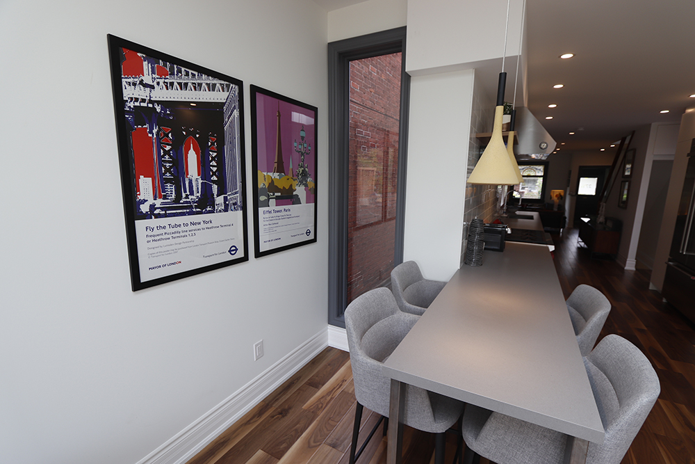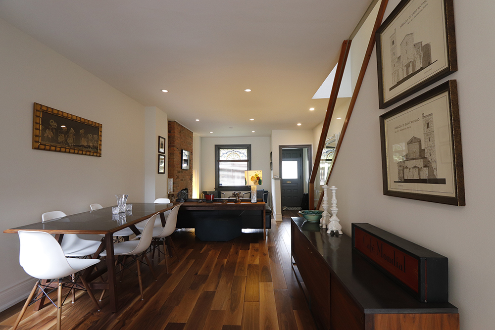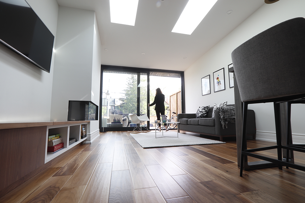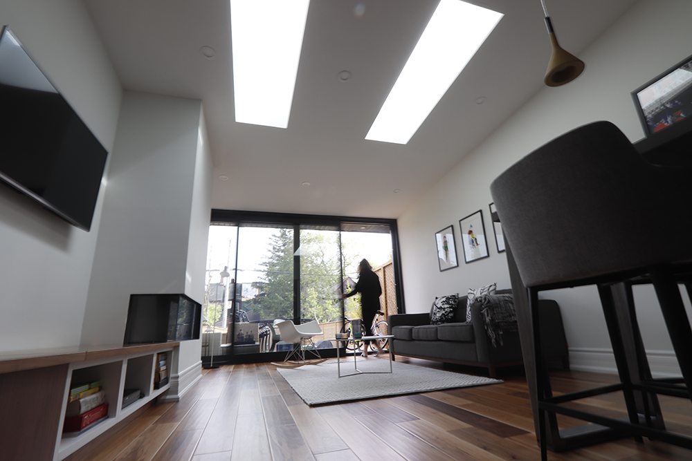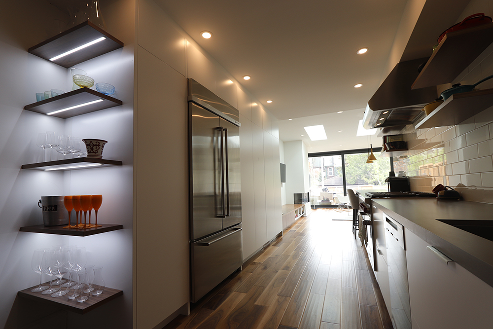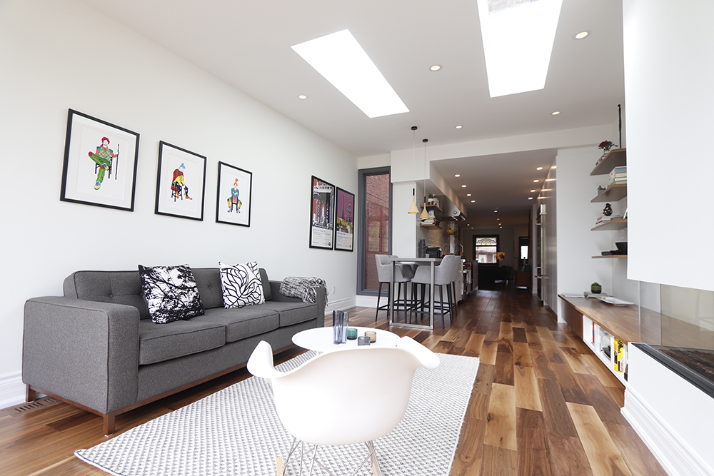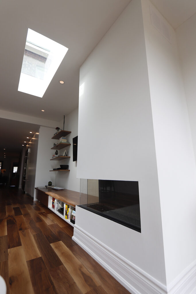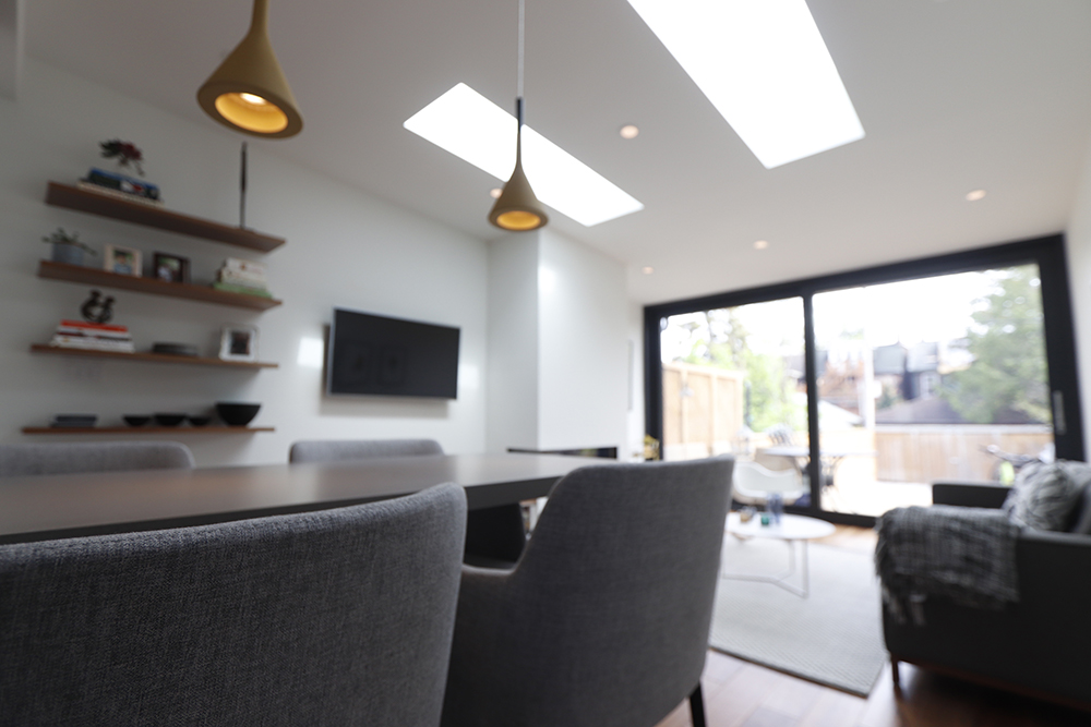 We renovated this Roncy semi’s main floor and basement, extending the original footprint to the rear. We made great use of the narrow layout by adding a full wall to wall and floor to ceiling glass wall on the addition, along with skylights. This project was completed on schedule, under budget, has been nominated for a BILD award.