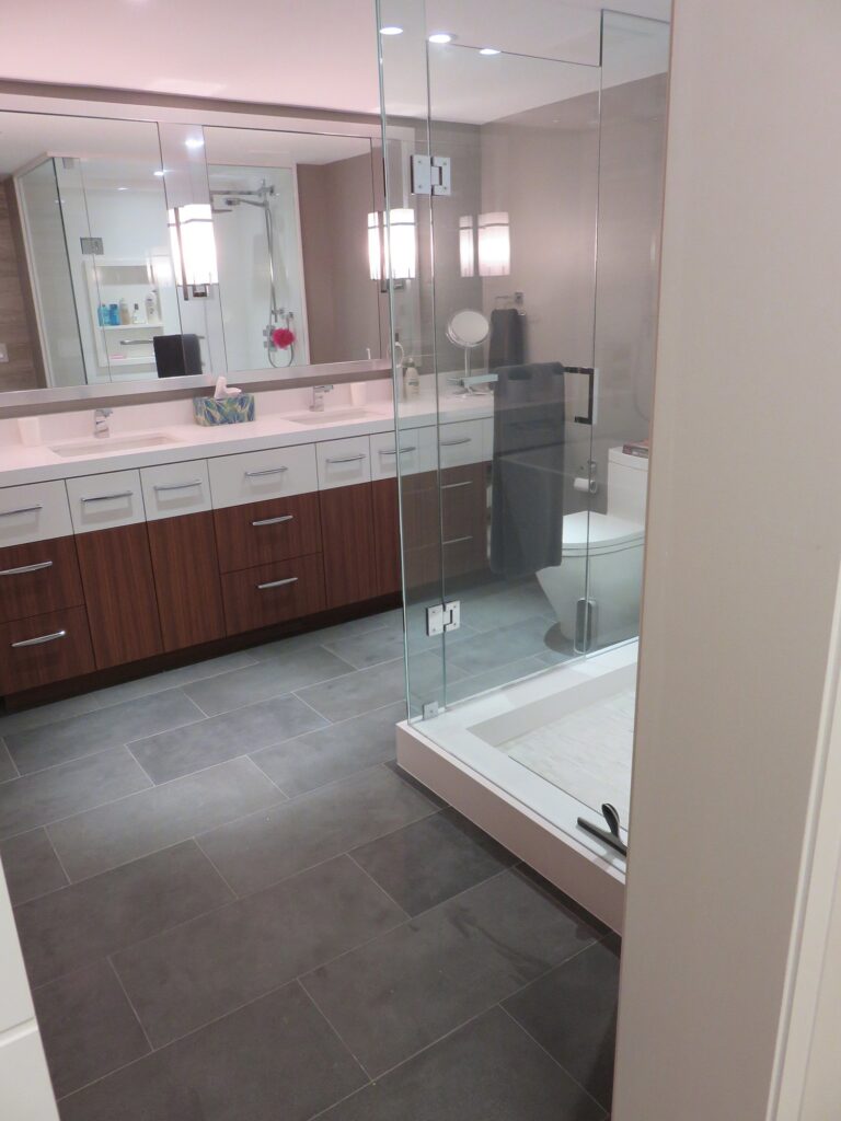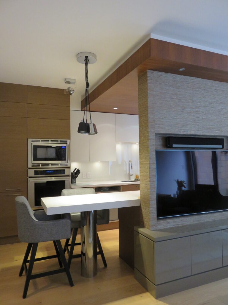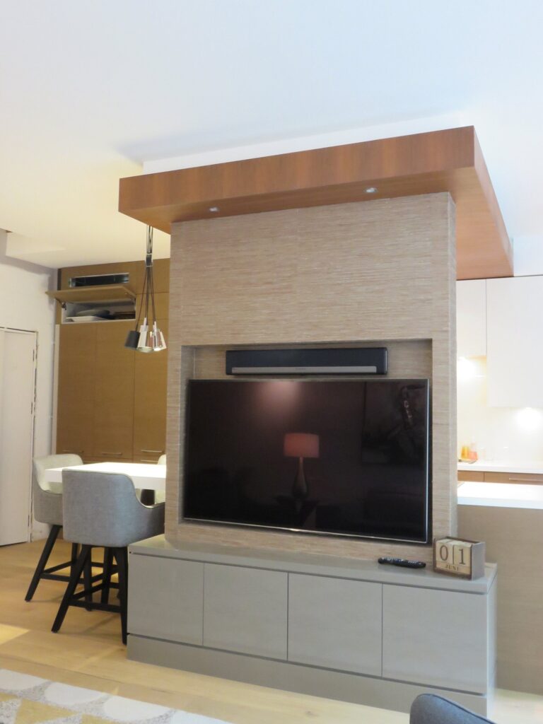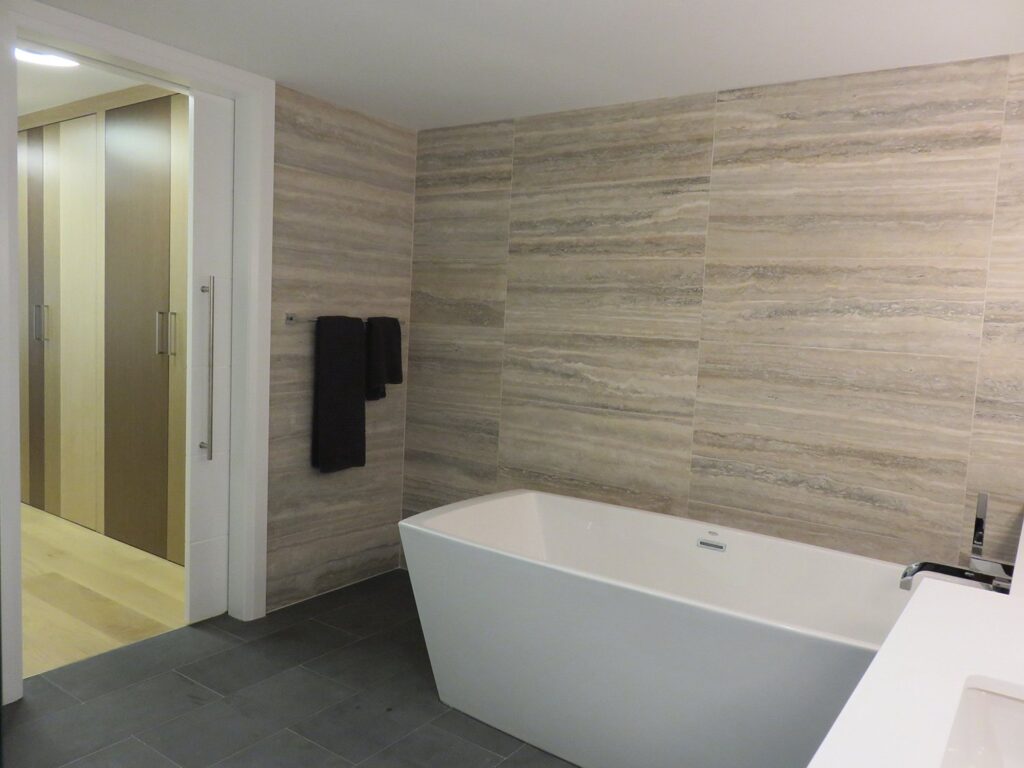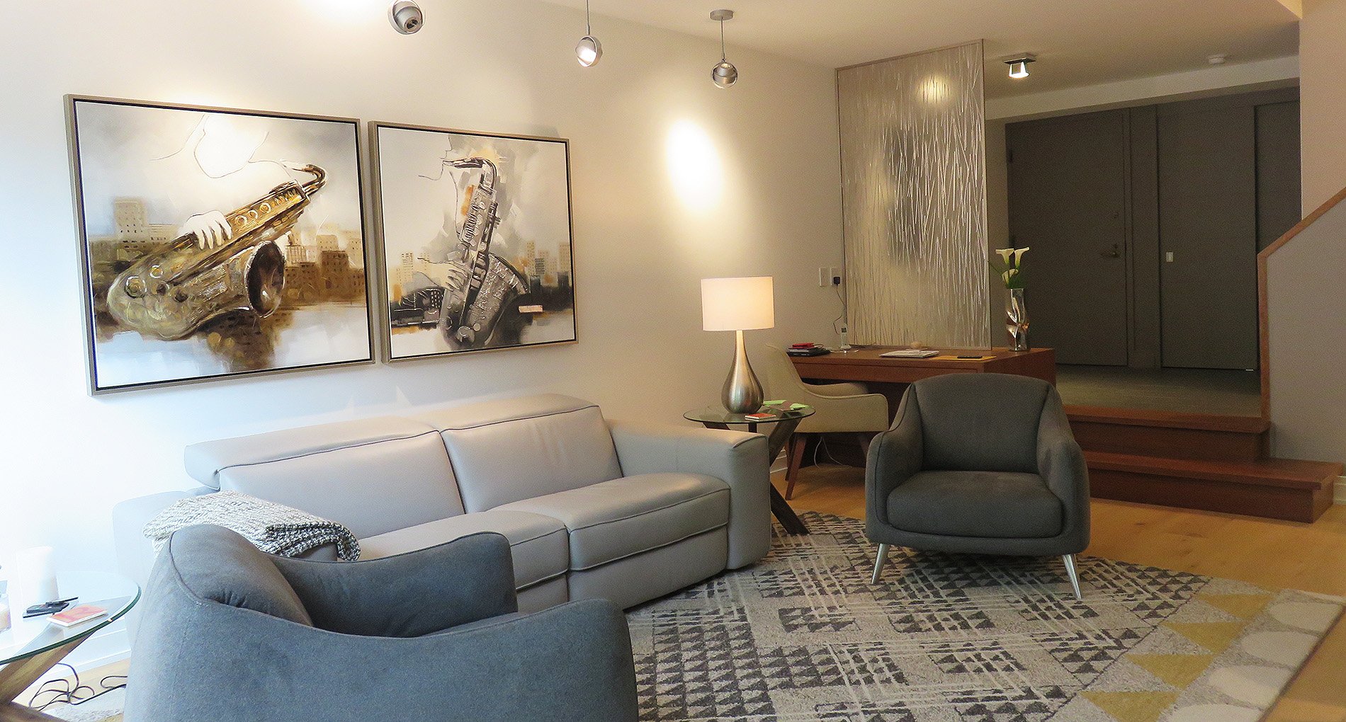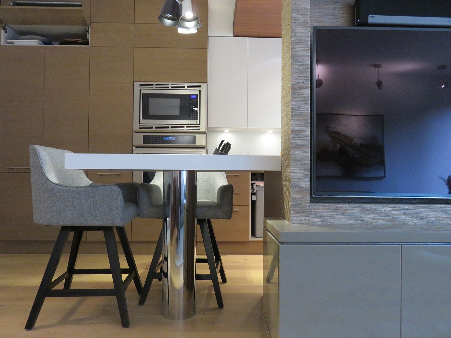 Complete remodel of a mid town condo. The overall design has a very open and contemporary feel. The galley style kitchen features stainless steel appliances complimented by medium brown, grey and white cabinets along with a simple white backsplash. Light wood floors span throughout the home along with contemporary furniture, and various modern touches. The master bath features slate tile floor, and a large freestanding soaker tub with stainless steel fixtures. The double vanity spans across the wall with two tone cabinets, and under-mounted sinks.