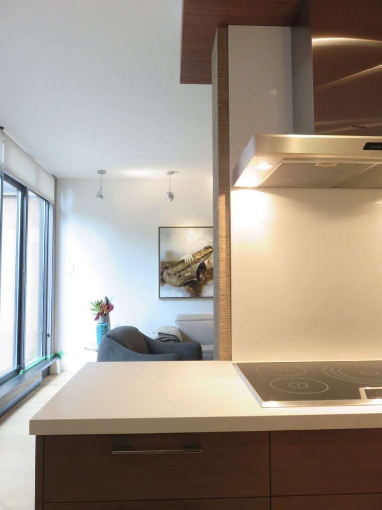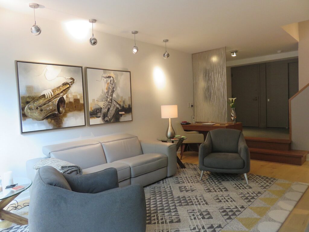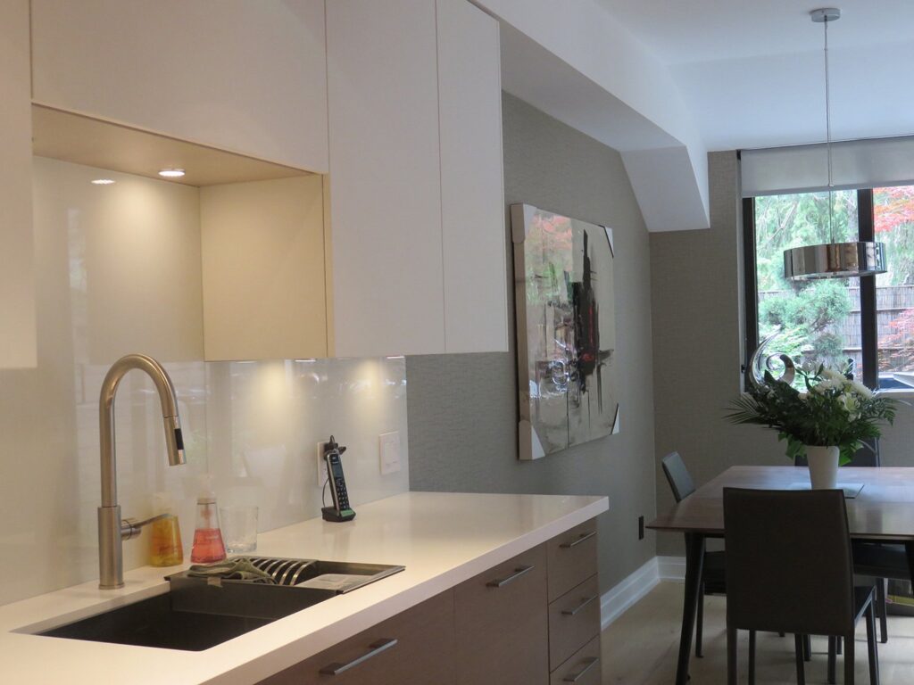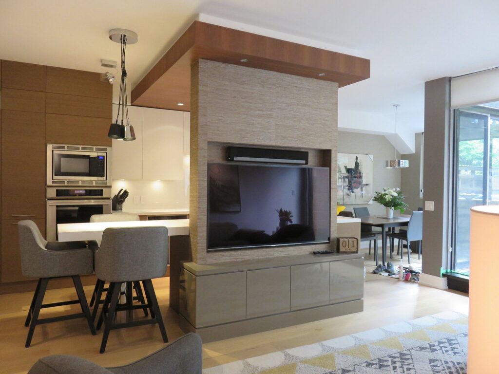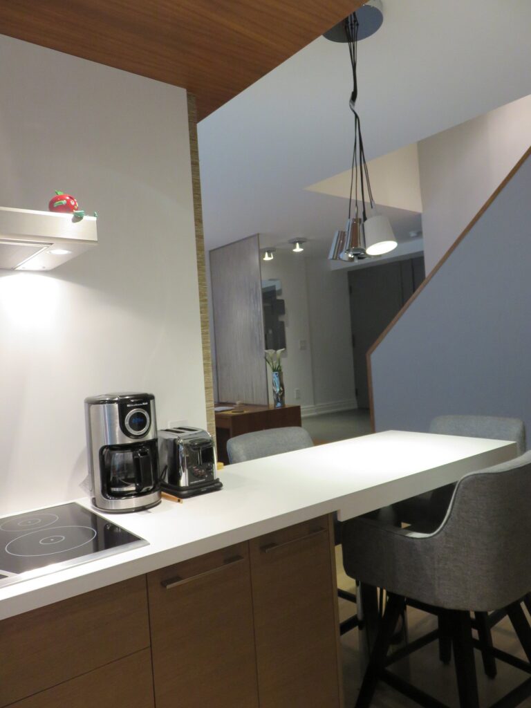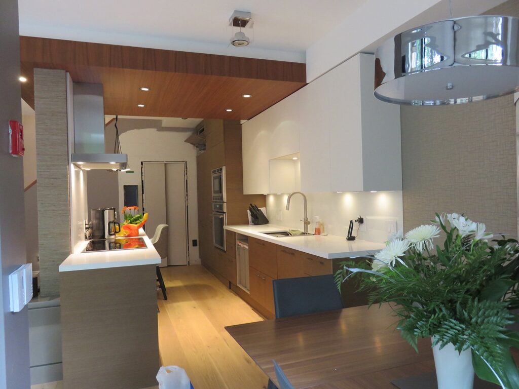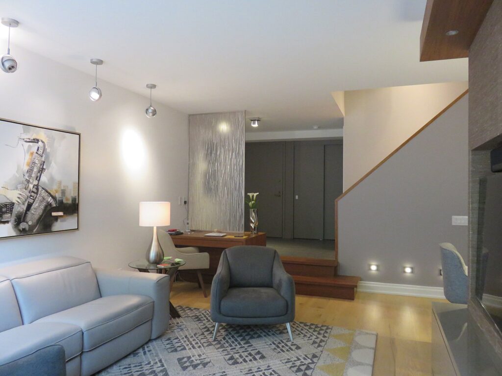 Complete remodel of a mid town condo. The overall design has a very open and contemporary feel. The galley style kitchen features stainless steel appliances complimented by medium brown, grey and white cabinets along with a simple white backsplash. Light wood floors span throughout the home along with contemporary furniture, and various modern touches. The master bath features slate tile floor, and a large freestanding soaker tub with stainless steel fixtures. The double vanity spans across the wall with two tone cabinets, and under-mounted sinks.