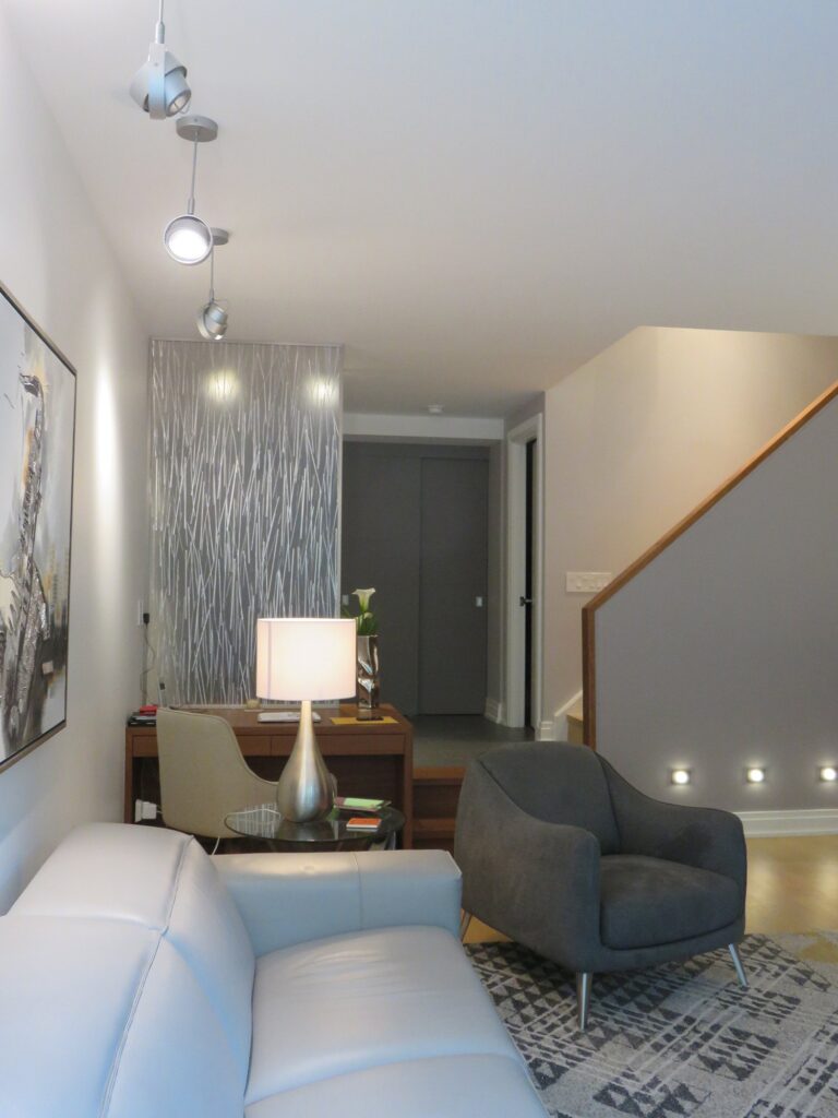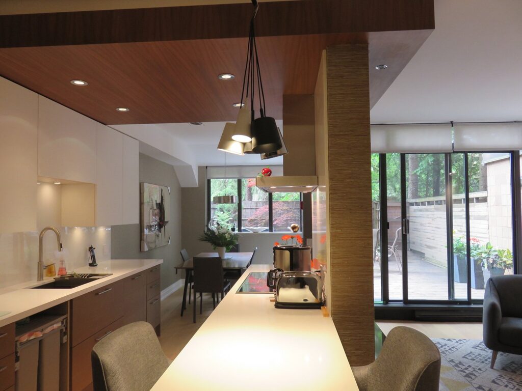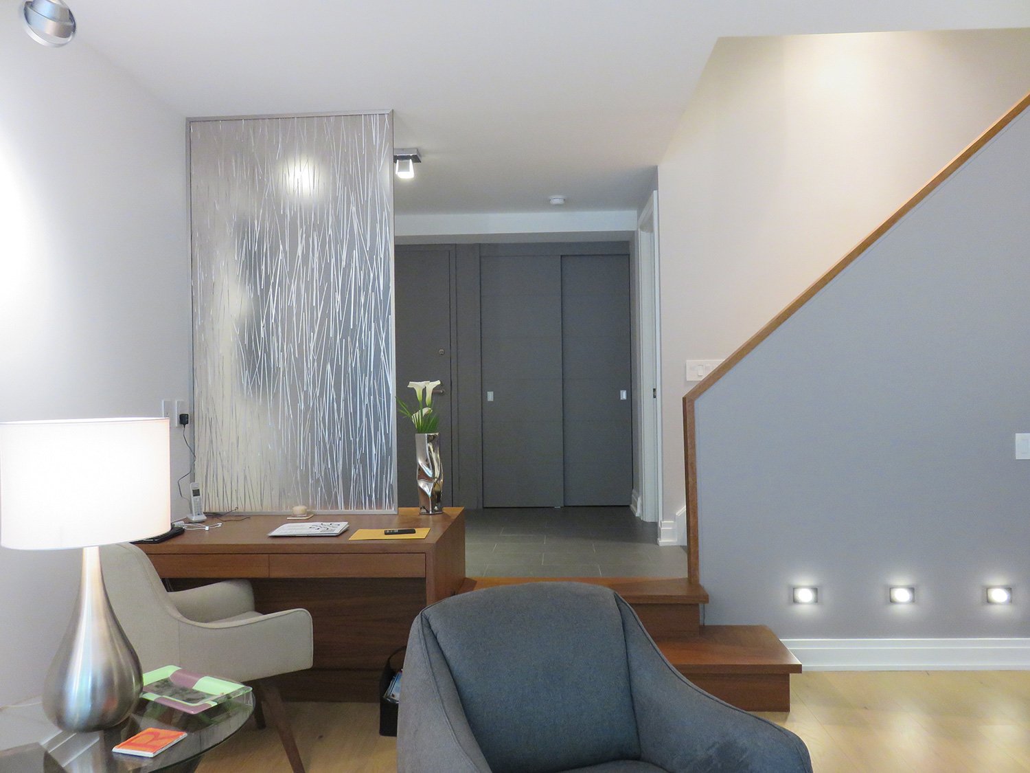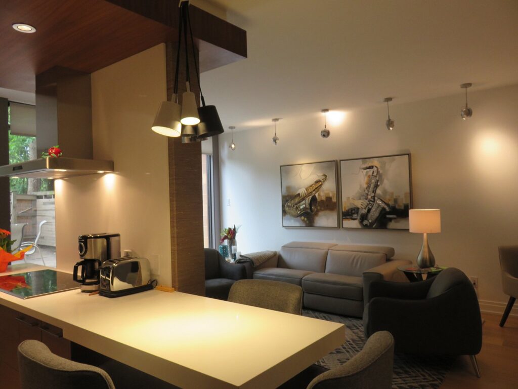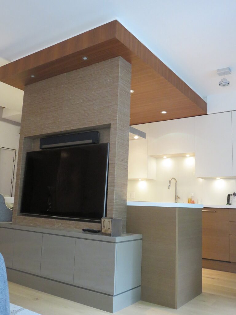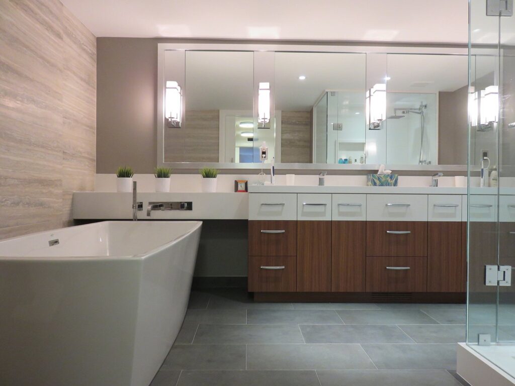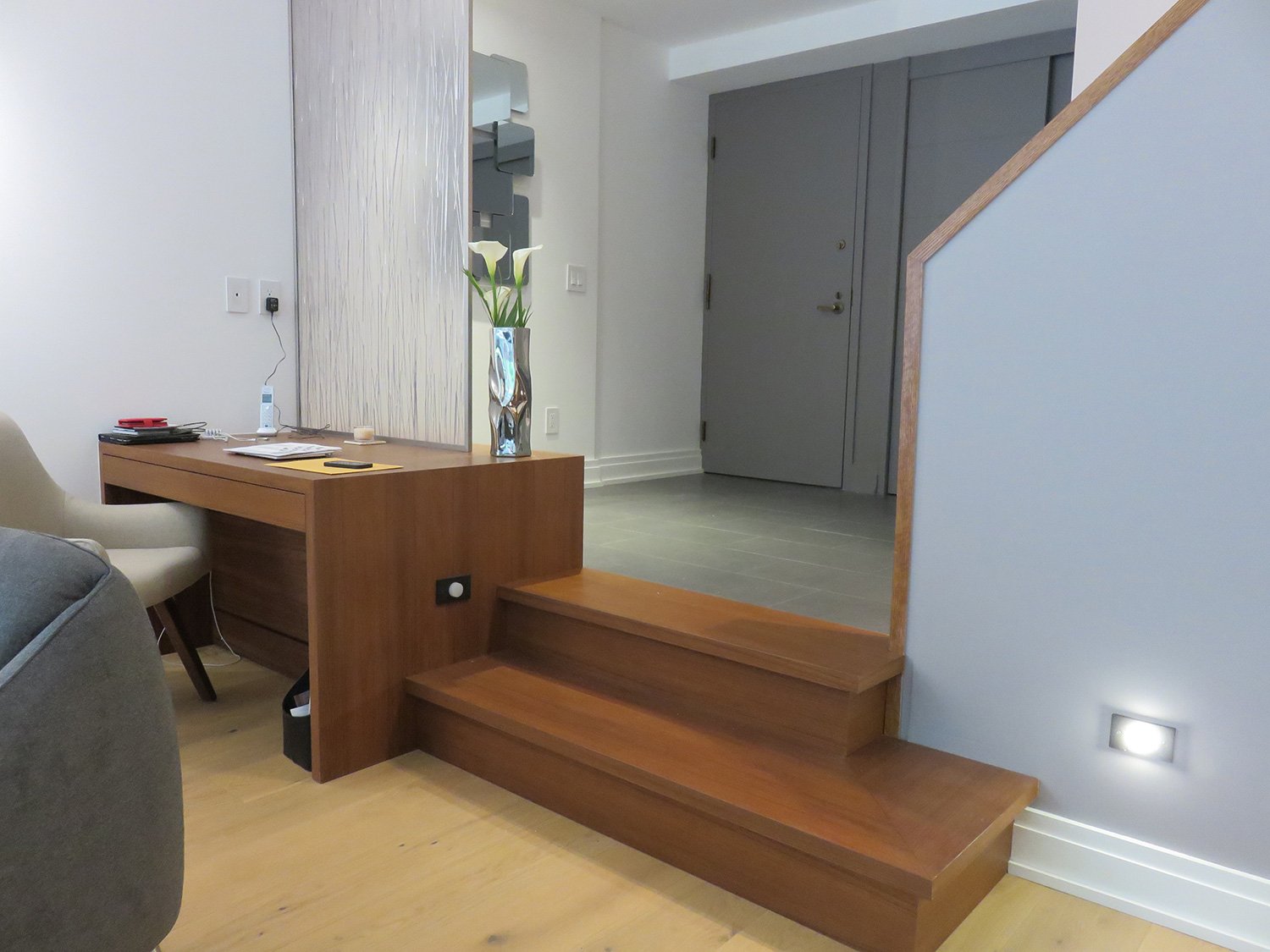 Complete remodel of a mid town condo. The overall design has a very open and contemporary feel. The galley style kitchen features stainless steel appliances complimented by medium brown, grey and white cabinets along with a simple white backsplash. Light wood floors span throughout the home along with contemporary furniture, and various modern touches. The master bath features slate tile floor, and a large freestanding soaker tub with stainless steel fixtures. The double vanity spans across the wall with two tone cabinets, and under-mounted sinks.