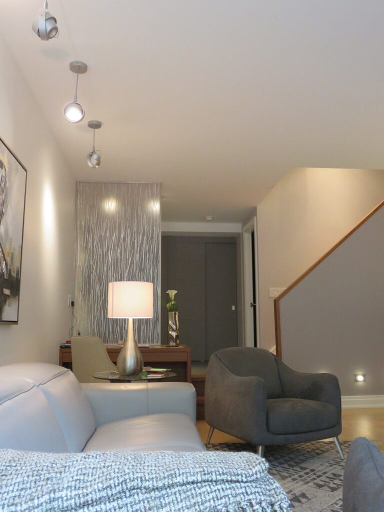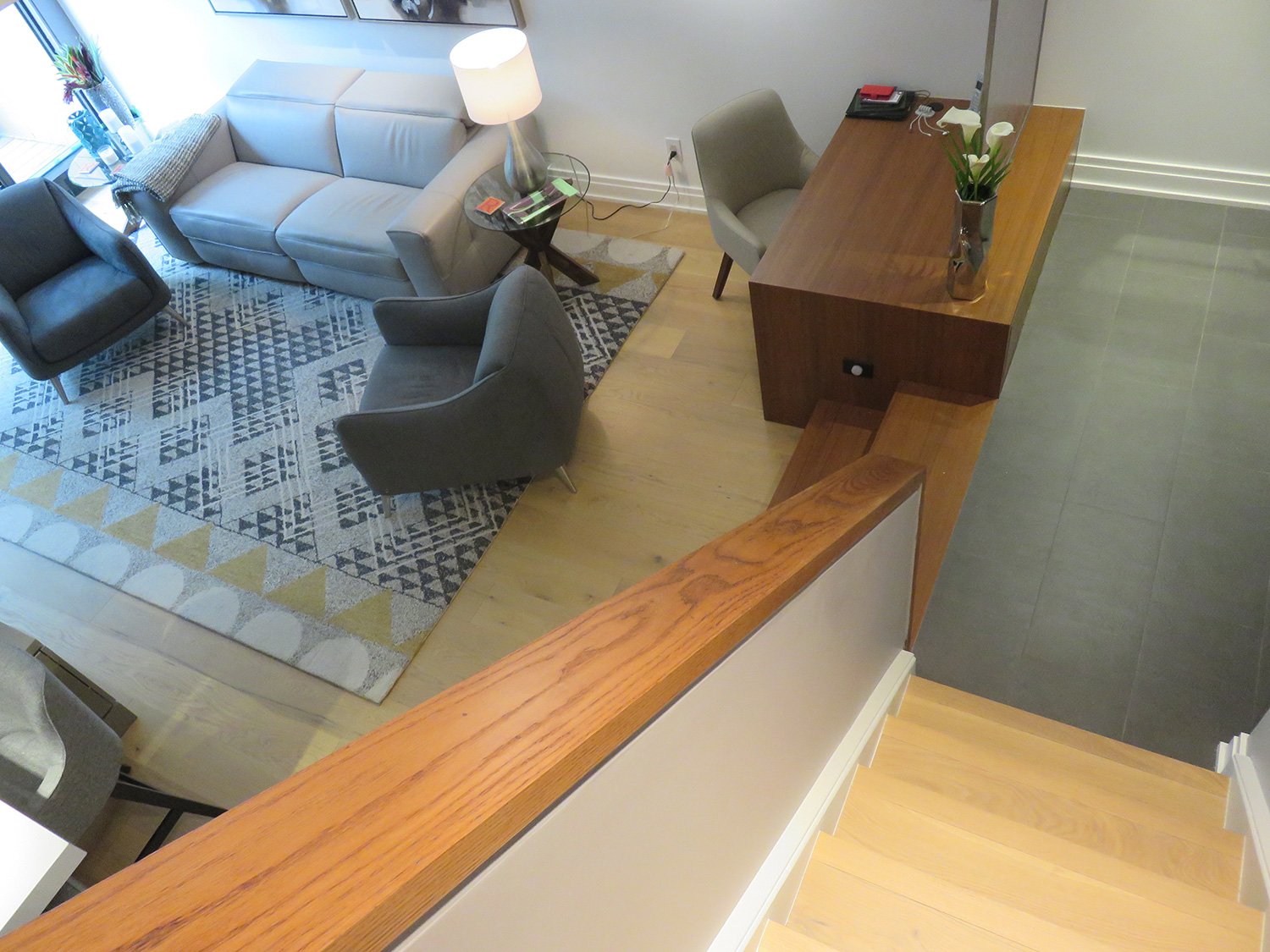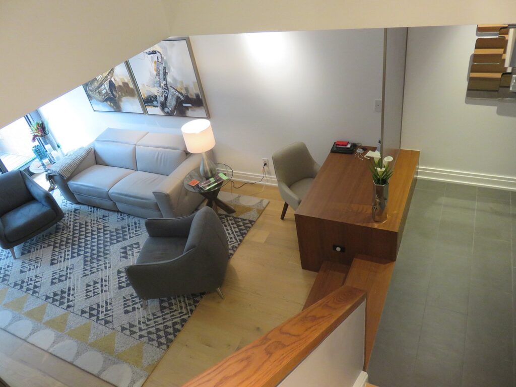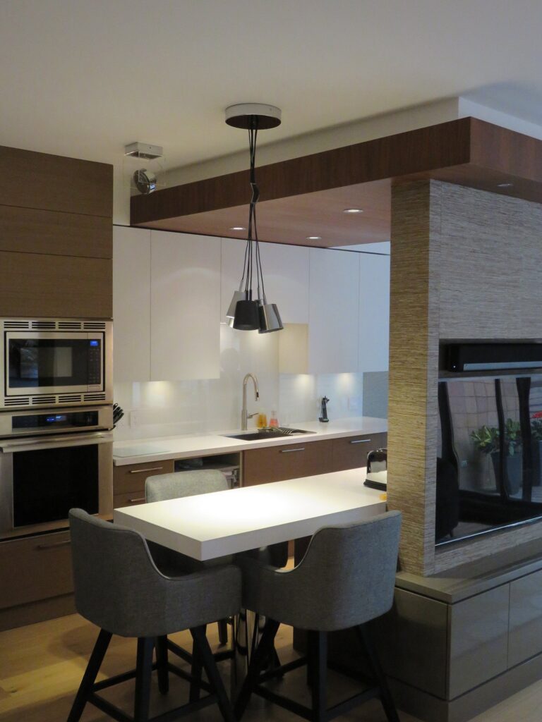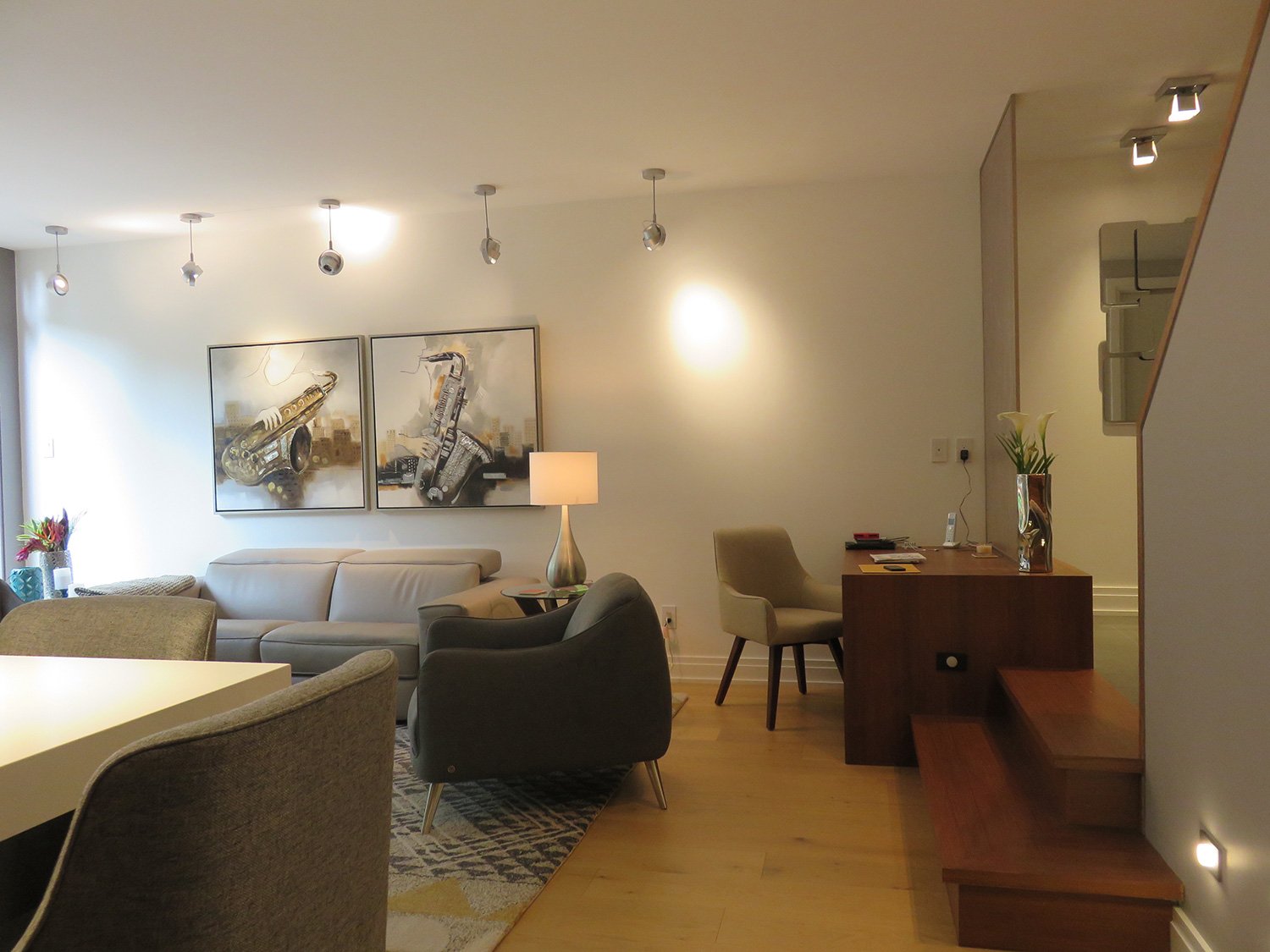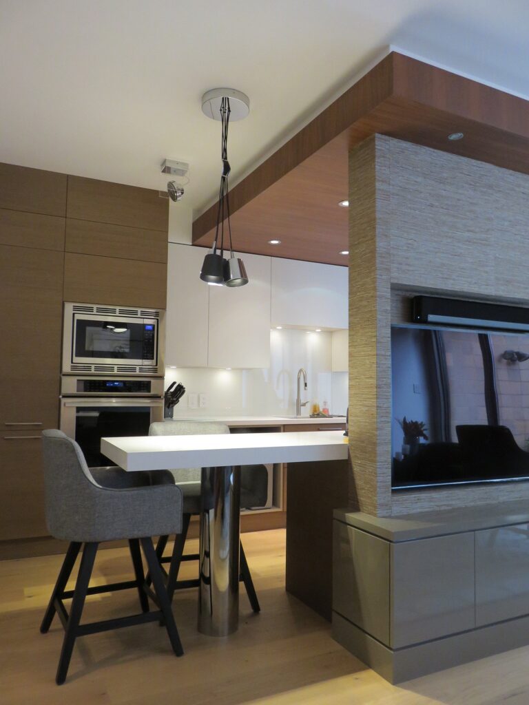 Complete remodel of a mid town condo. The overall design has a very open and contemporary feel. The galley style kitchen features stainless steel appliances complimented by medium brown, grey and white cabinets along with a simple white backsplash. Light wood floors span throughout the home along with contemporary furniture, and various modern touches. The master bath features slate tile floor, and a large freestanding soaker tub with stainless steel fixtures. The double vanity spans across the wall with two tone cabinets, and under-mounted sinks.