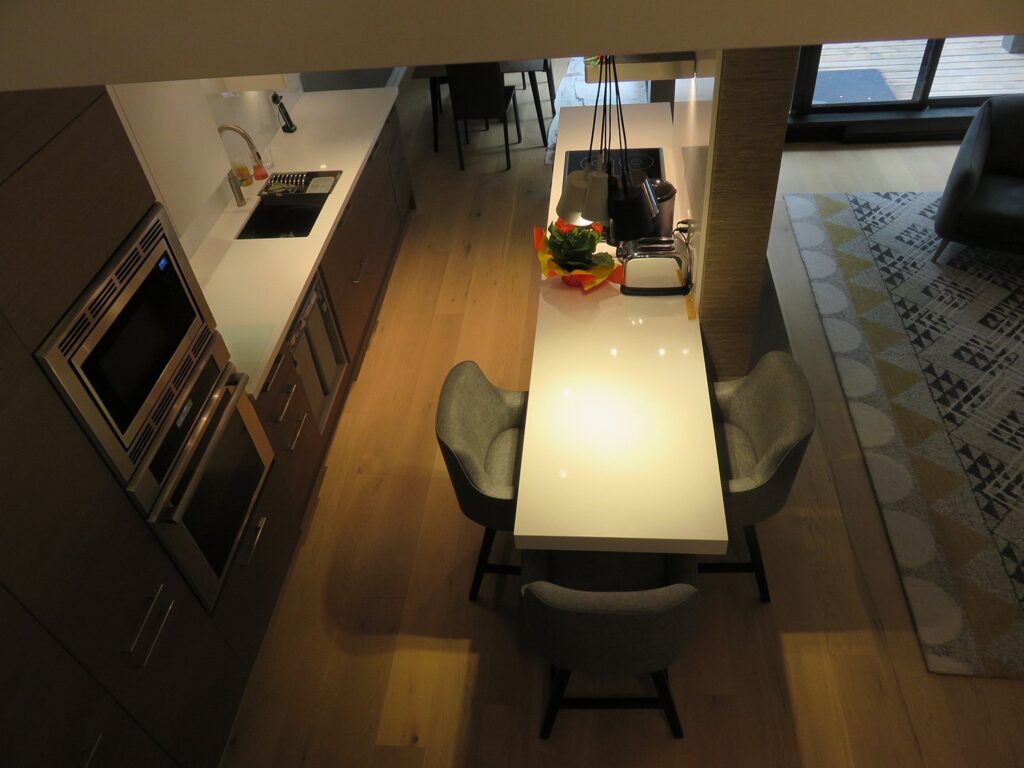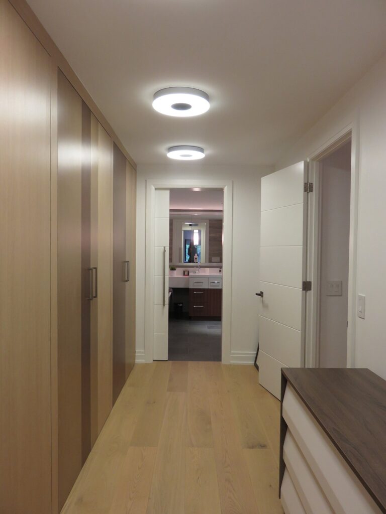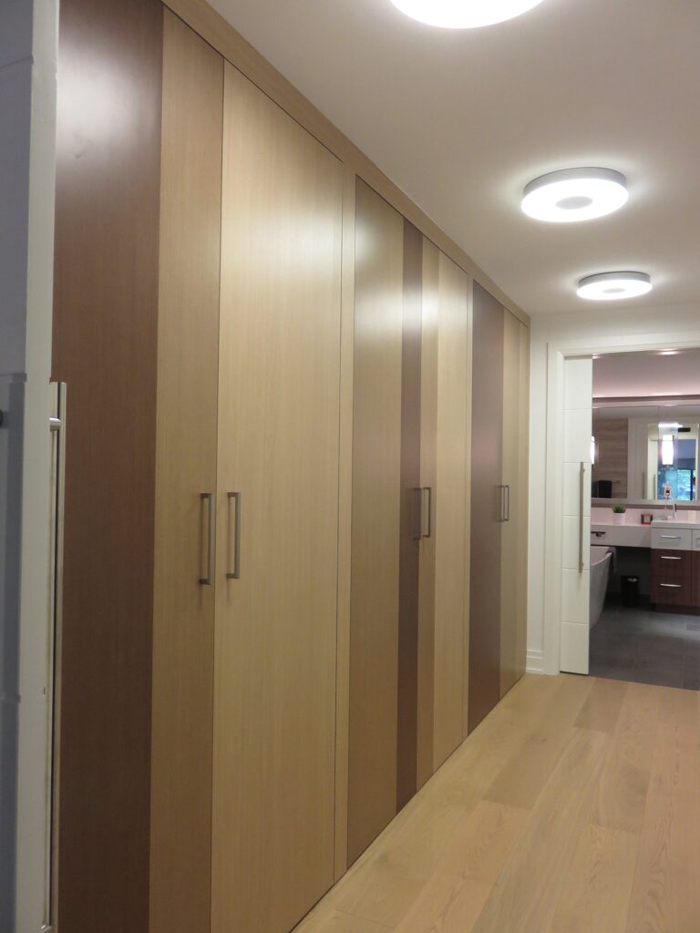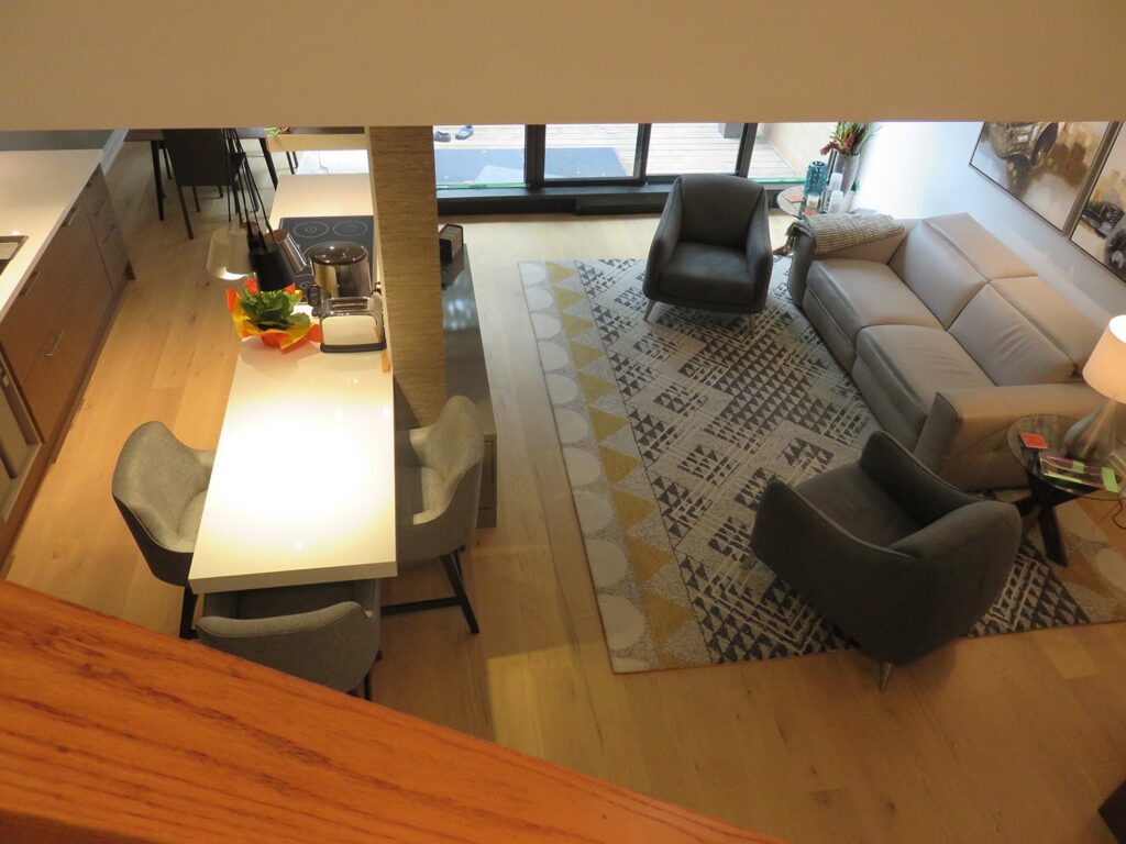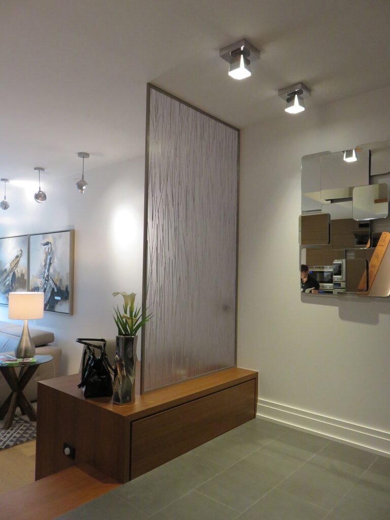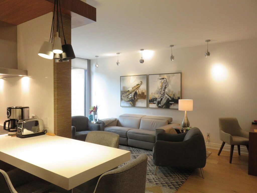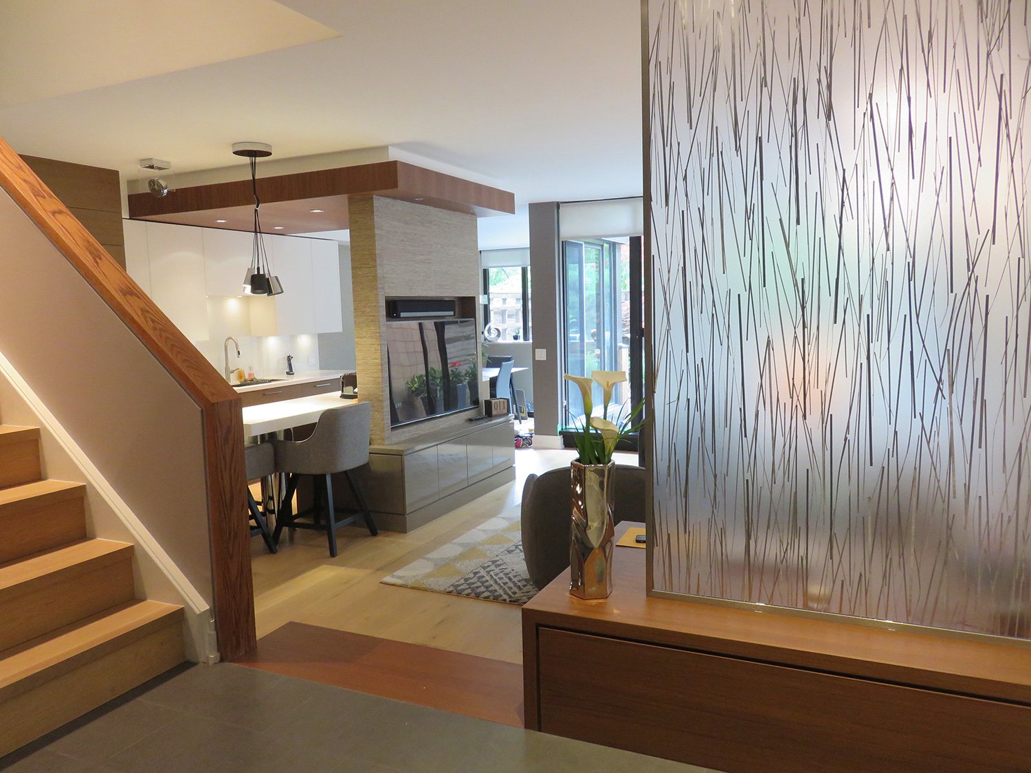 Complete remodel of a mid town condo. The overall design has a very open and contemporary feel. The galley style kitchen features stainless steel appliances complimented by medium brown, grey and white cabinets along with a simple white backsplash. Light wood floors span throughout the home along with contemporary furniture, and various modern touches. The master bath features slate tile floor, and a large freestanding soaker tub with stainless steel fixtures. The double vanity spans across the wall with two tone cabinets, and under-mounted sinks.