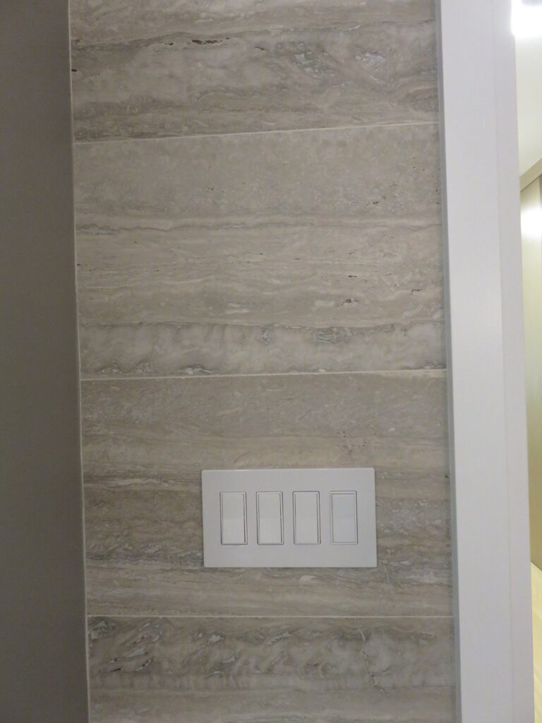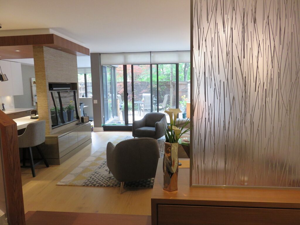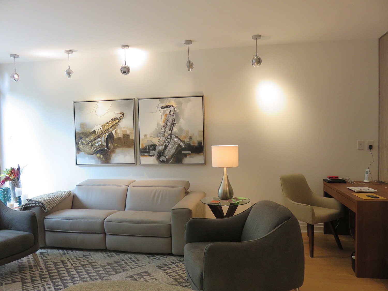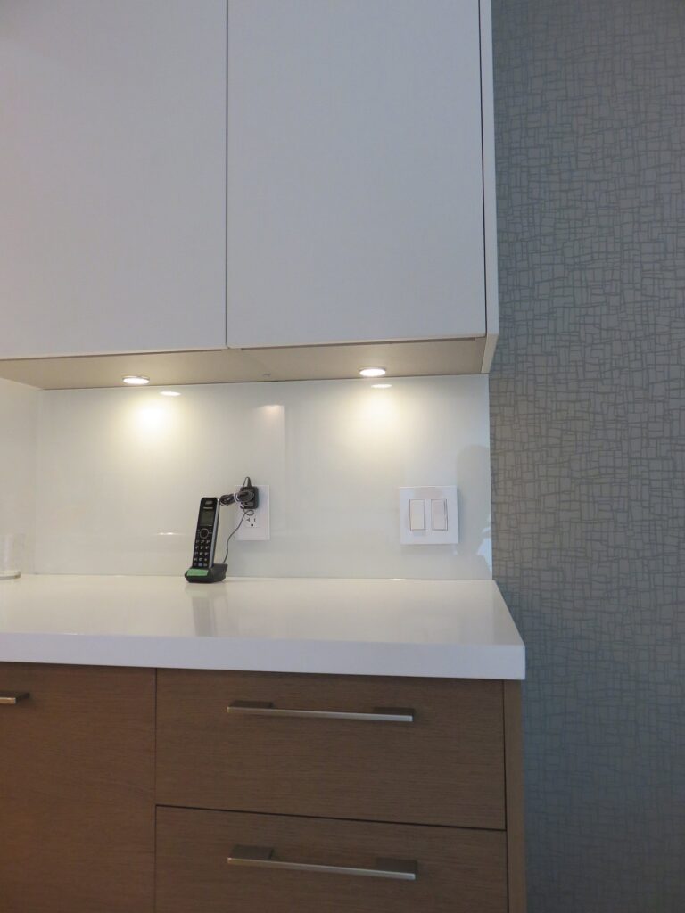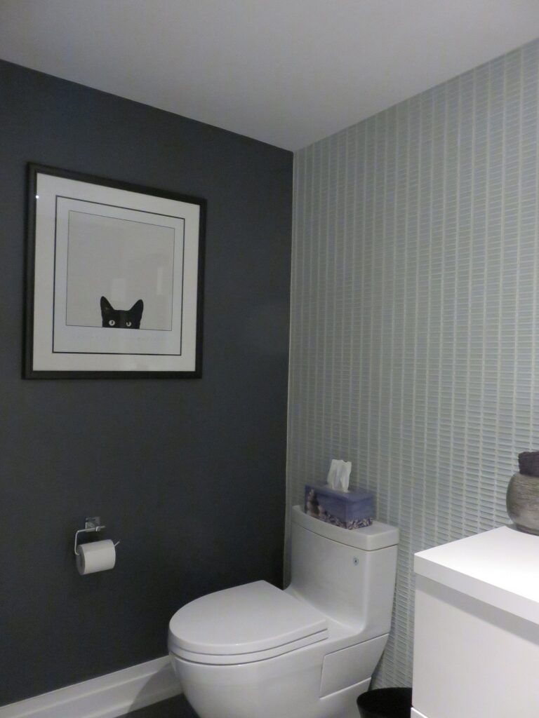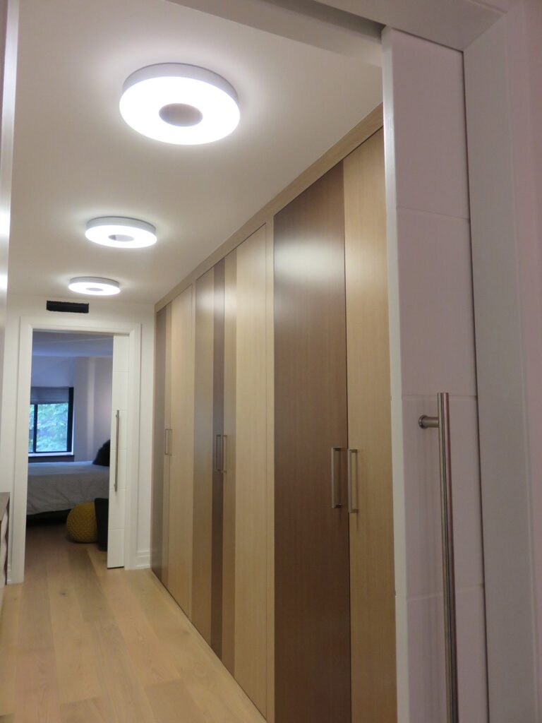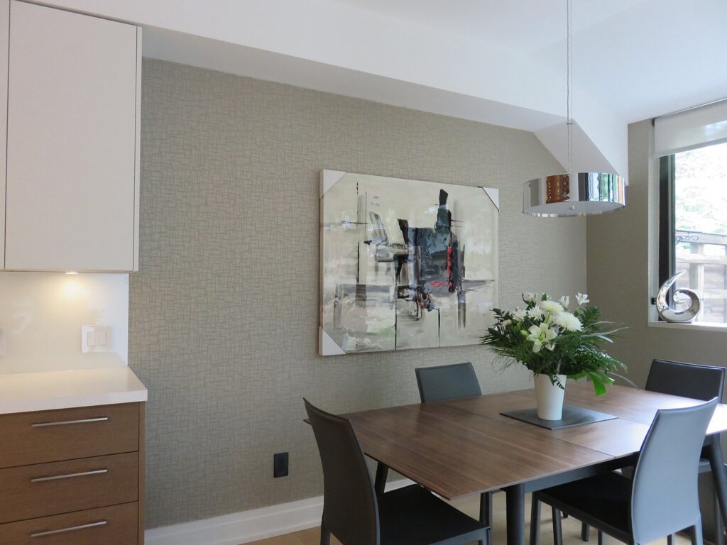 Complete remodel of a mid town condo. The overall design has a very open and contemporary feel. The galley style kitchen features stainless steel appliances complimented by medium brown, grey and white cabinets along with a simple white backsplash. Light wood floors span throughout the home along with contemporary furniture, and various modern touches. The master bath features slate tile floor, and a large freestanding soaker tub with stainless steel fixtures. The double vanity spans across the wall with two tone cabinets, and under-mounted sinks.
