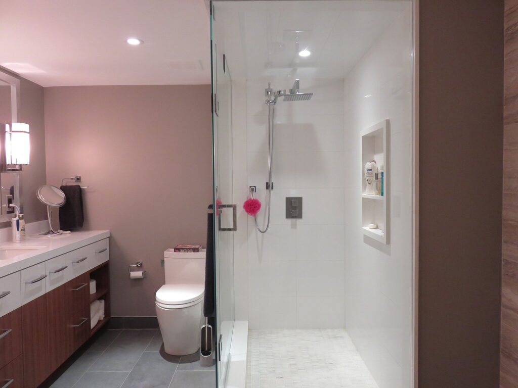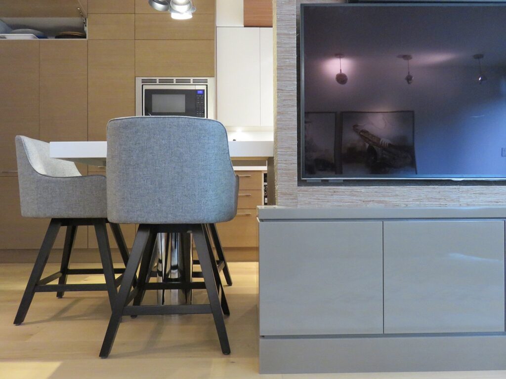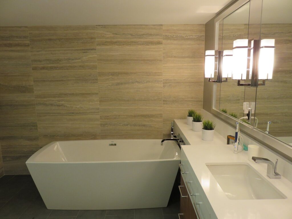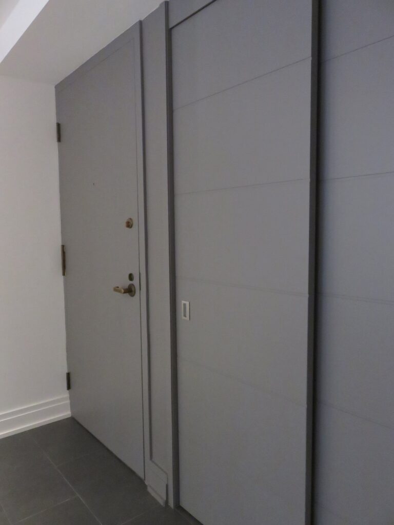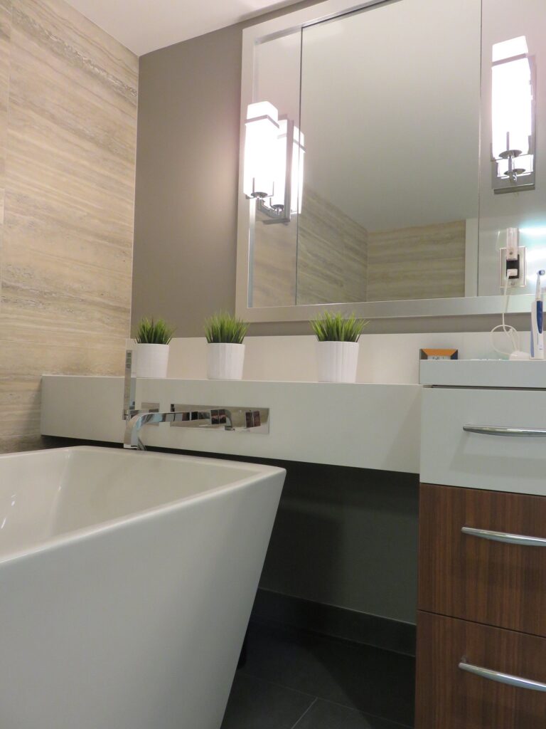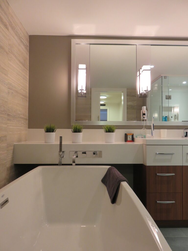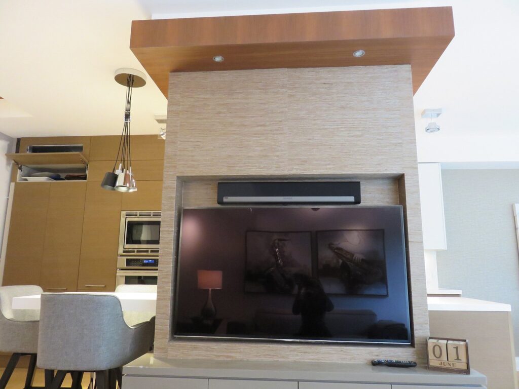 Complete remodel of a mid town condo. The overall design has a very open and contemporary feel. The galley style kitchen features stainless steel appliances complimented by medium brown, grey and white cabinets along with a simple white backsplash. Light wood floors span throughout the home along with contemporary furniture, and various modern touches. The master bath features slate tile floor, and a large freestanding soaker tub with stainless steel fixtures. The double vanity spans across the wall with two tone cabinets, and under-mounted sinks.