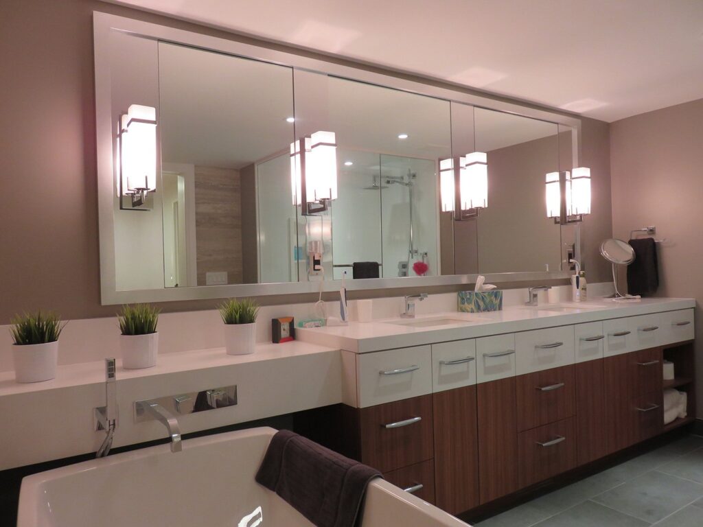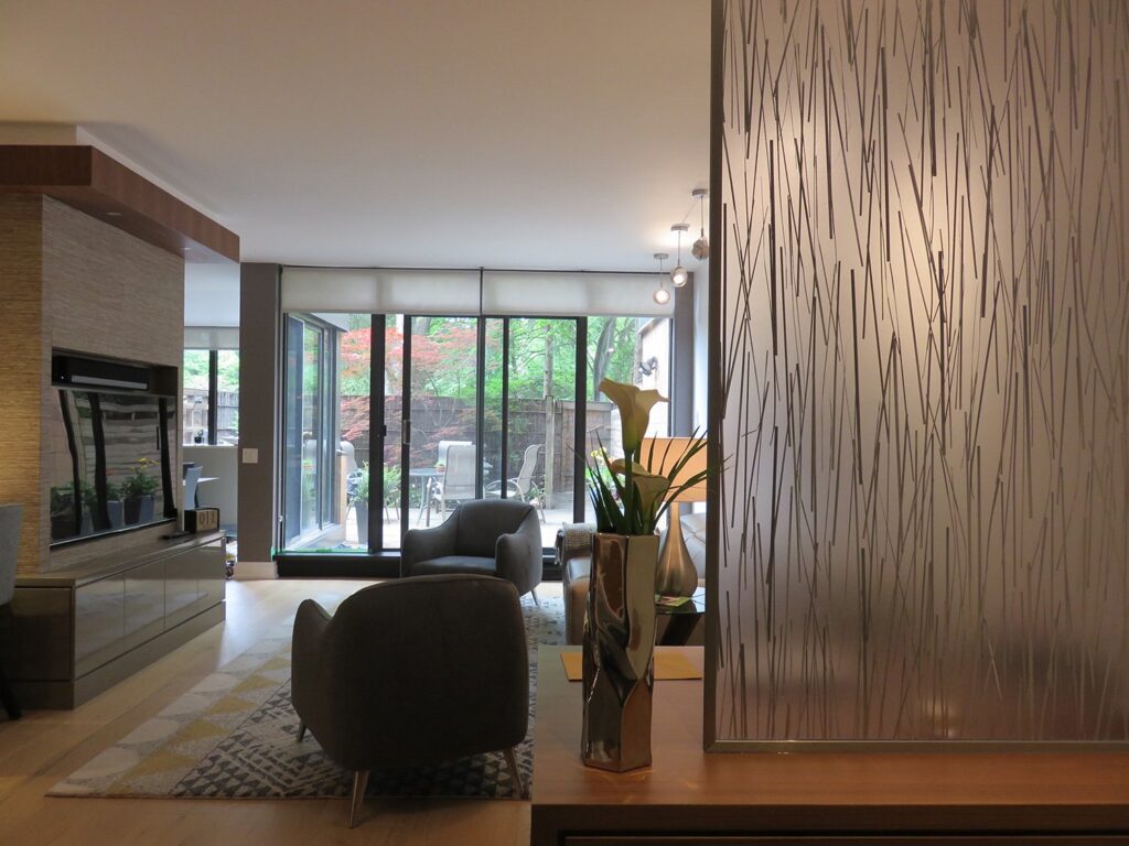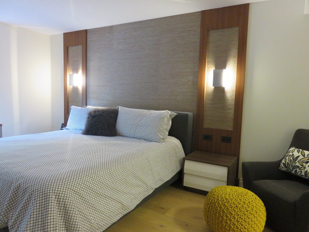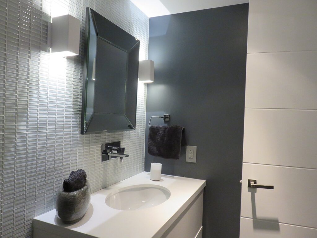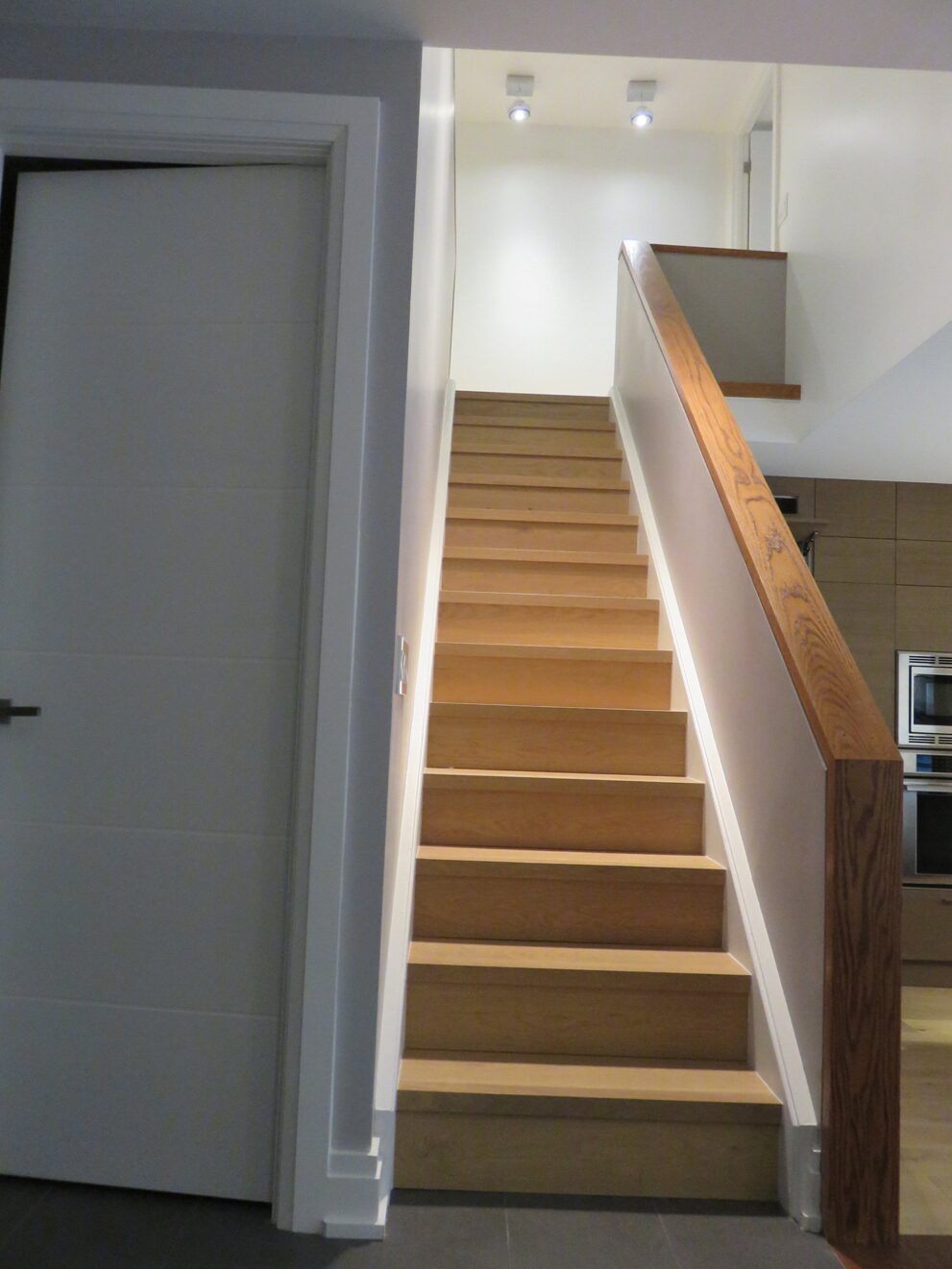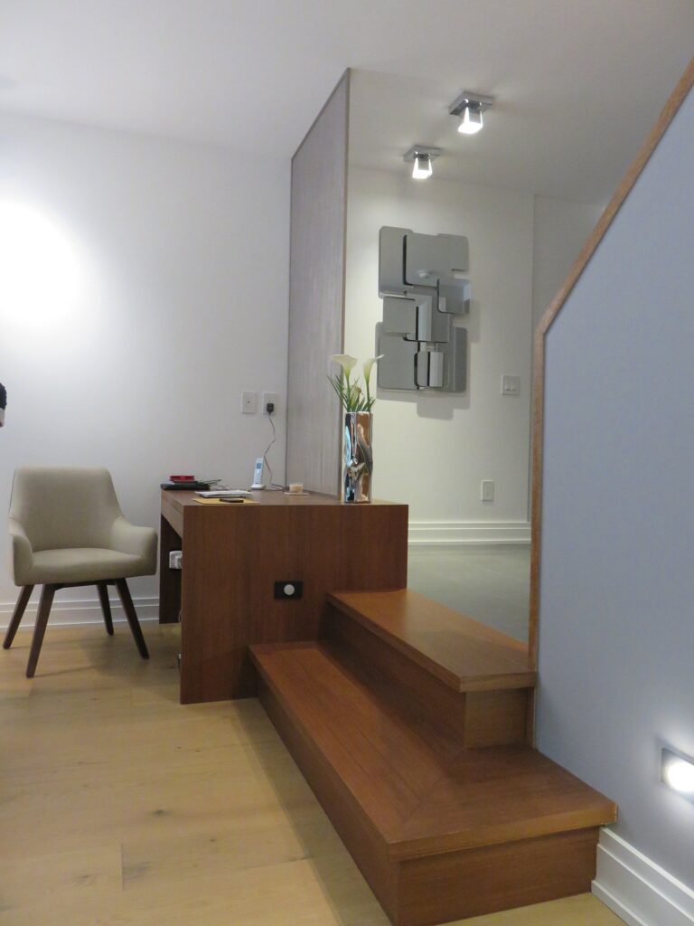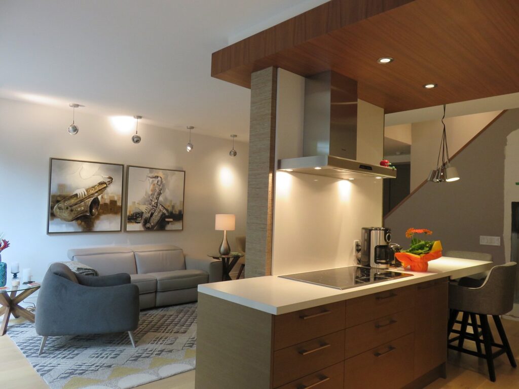 Complete remodel of a mid town condo. The overall design has a very open and contemporary feel. The galley style kitchen features stainless steel appliances complimented by medium brown, grey and white cabinets along with a simple white backsplash. Light wood floors span throughout the home along with contemporary furniture, and various modern touches. The master bath features slate tile floor, and a large freestanding soaker tub with stainless steel fixtures. The double vanity spans across the wall with two tone cabinets, and under-mounted sinks.