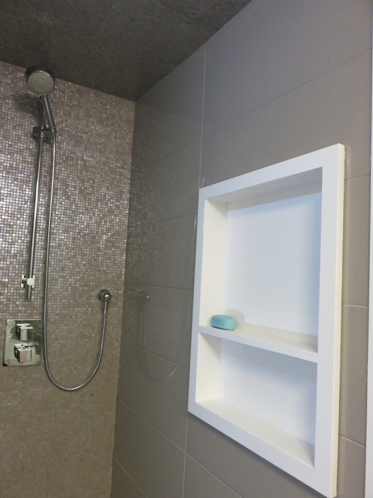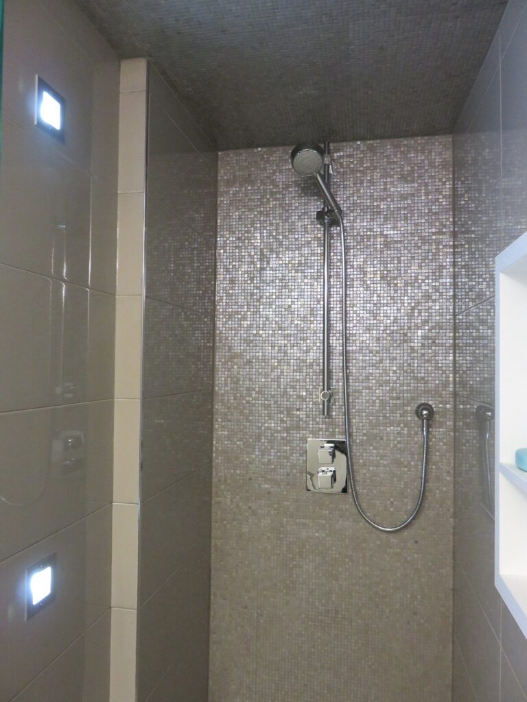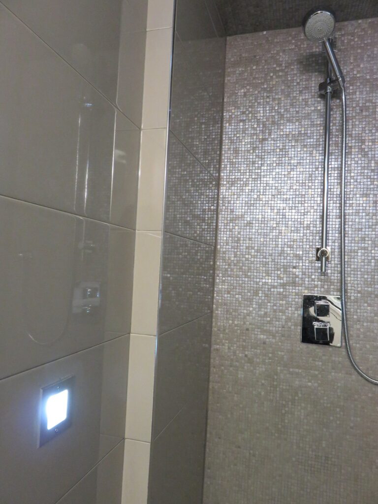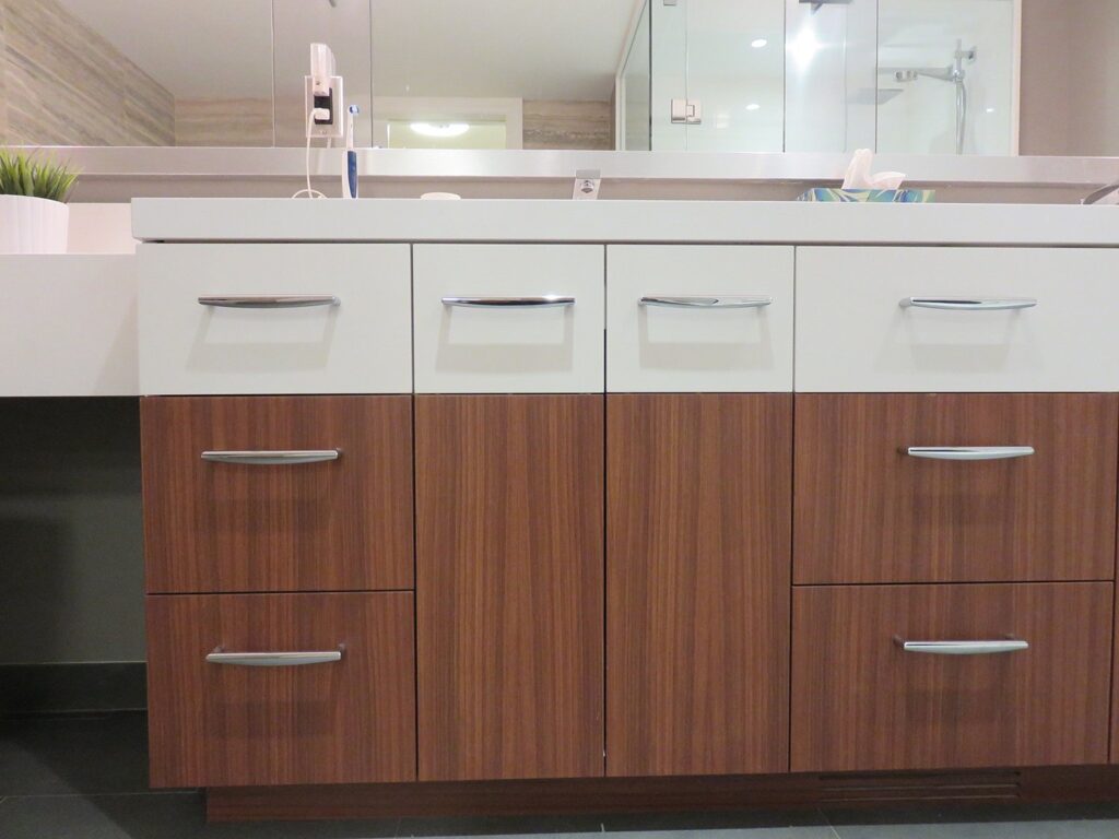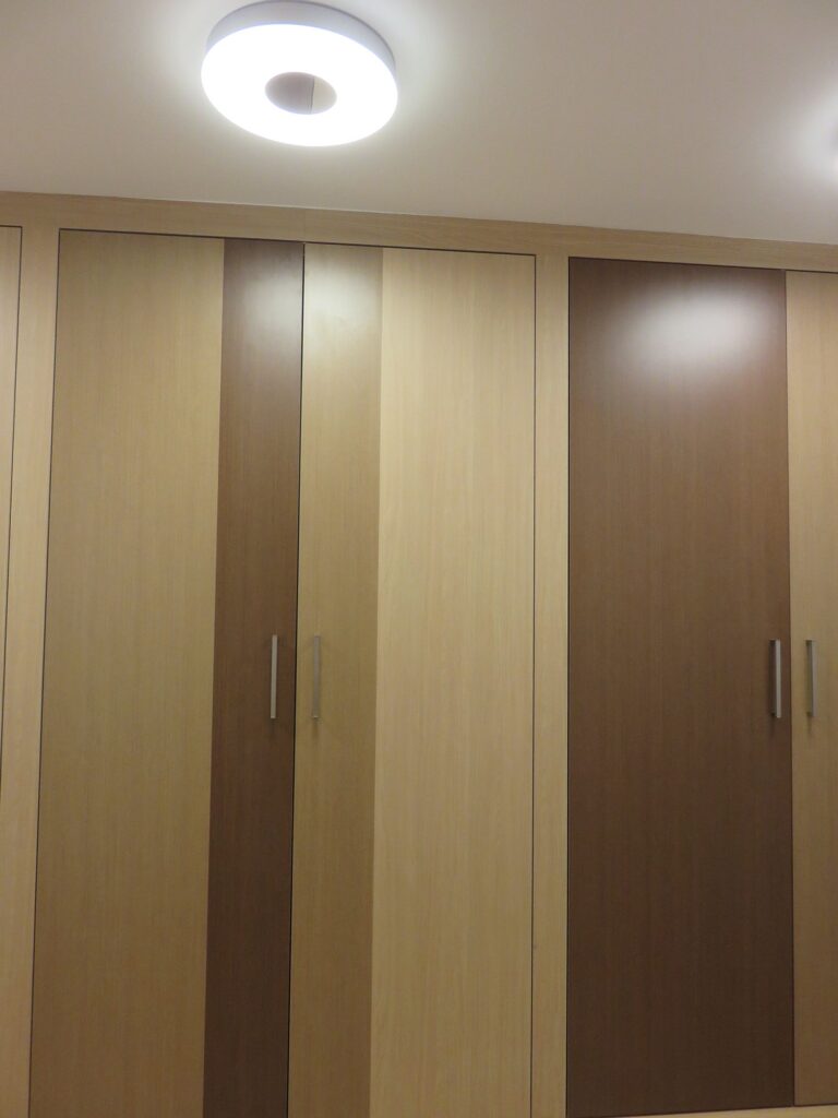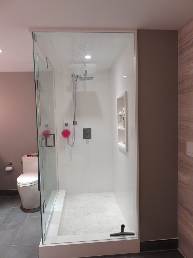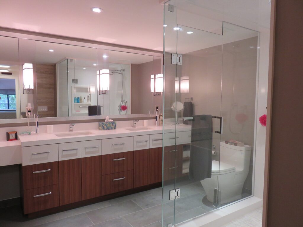 Complete remodel of a mid town condo. The overall design has a very open and contemporary feel. The galley style kitchen features stainless steel appliances complimented by medium brown, grey and white cabinets along with a simple white backsplash. Light wood floors span throughout the home along with contemporary furniture, and various modern touches. The master bath features slate tile floor, and a large freestanding soaker tub with stainless steel fixtures. The double vanity spans across the wall with two tone cabinets, and under-mounted sinks.