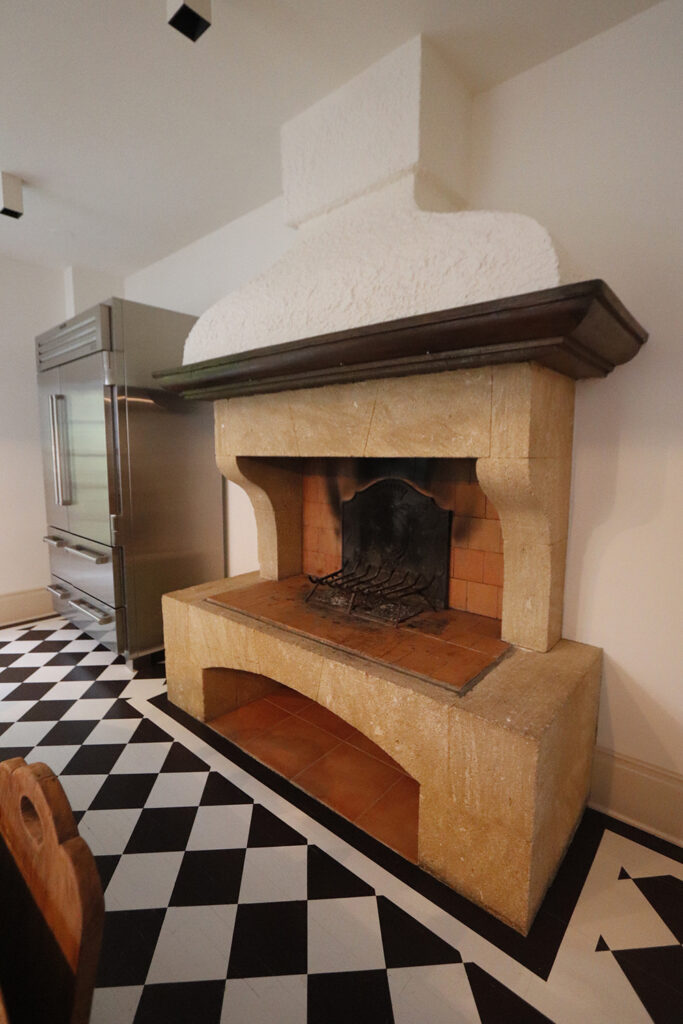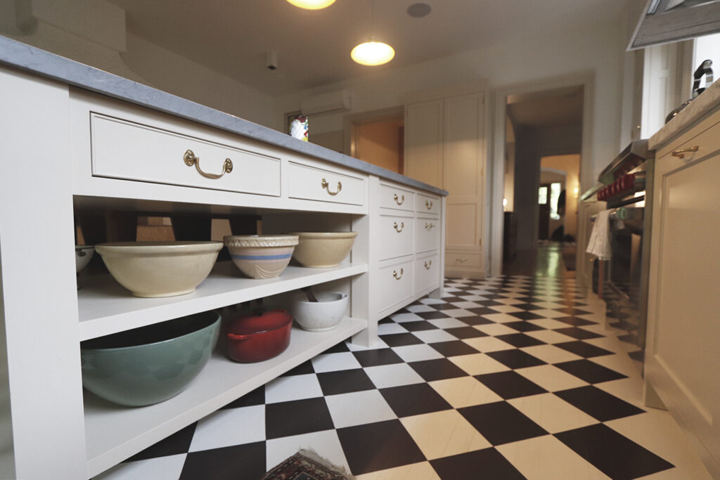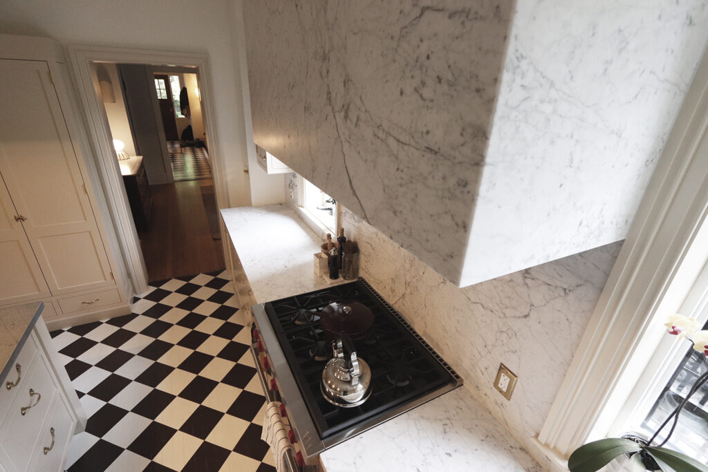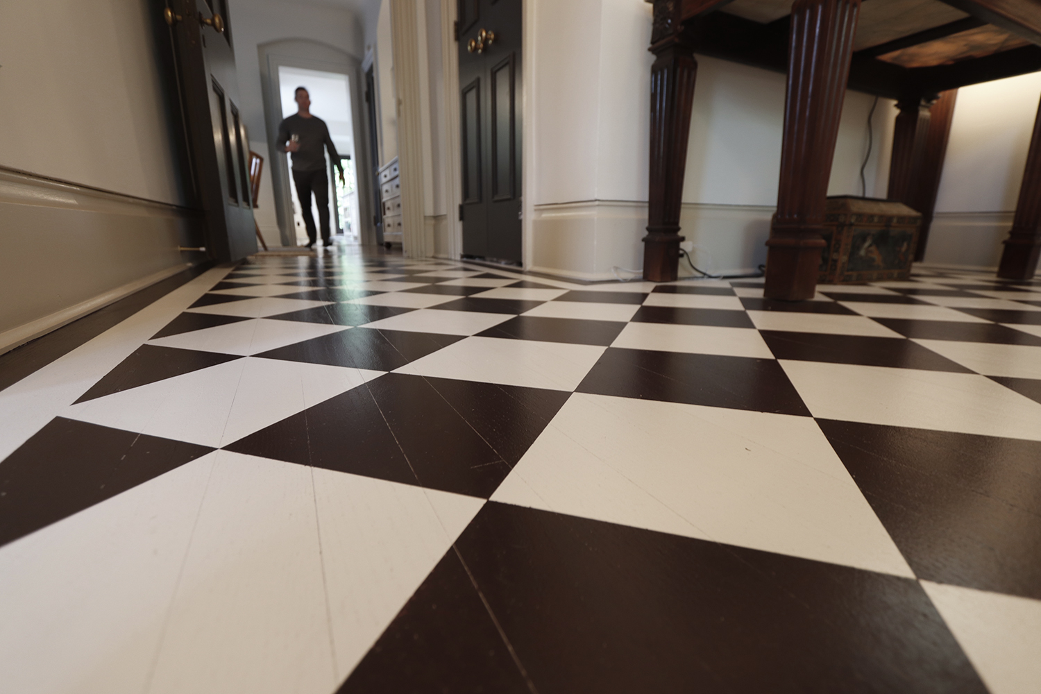 This classic-style major renovation features a gorgeous hardwood floor painted to look like black and white tile in the foyer and kitchen.