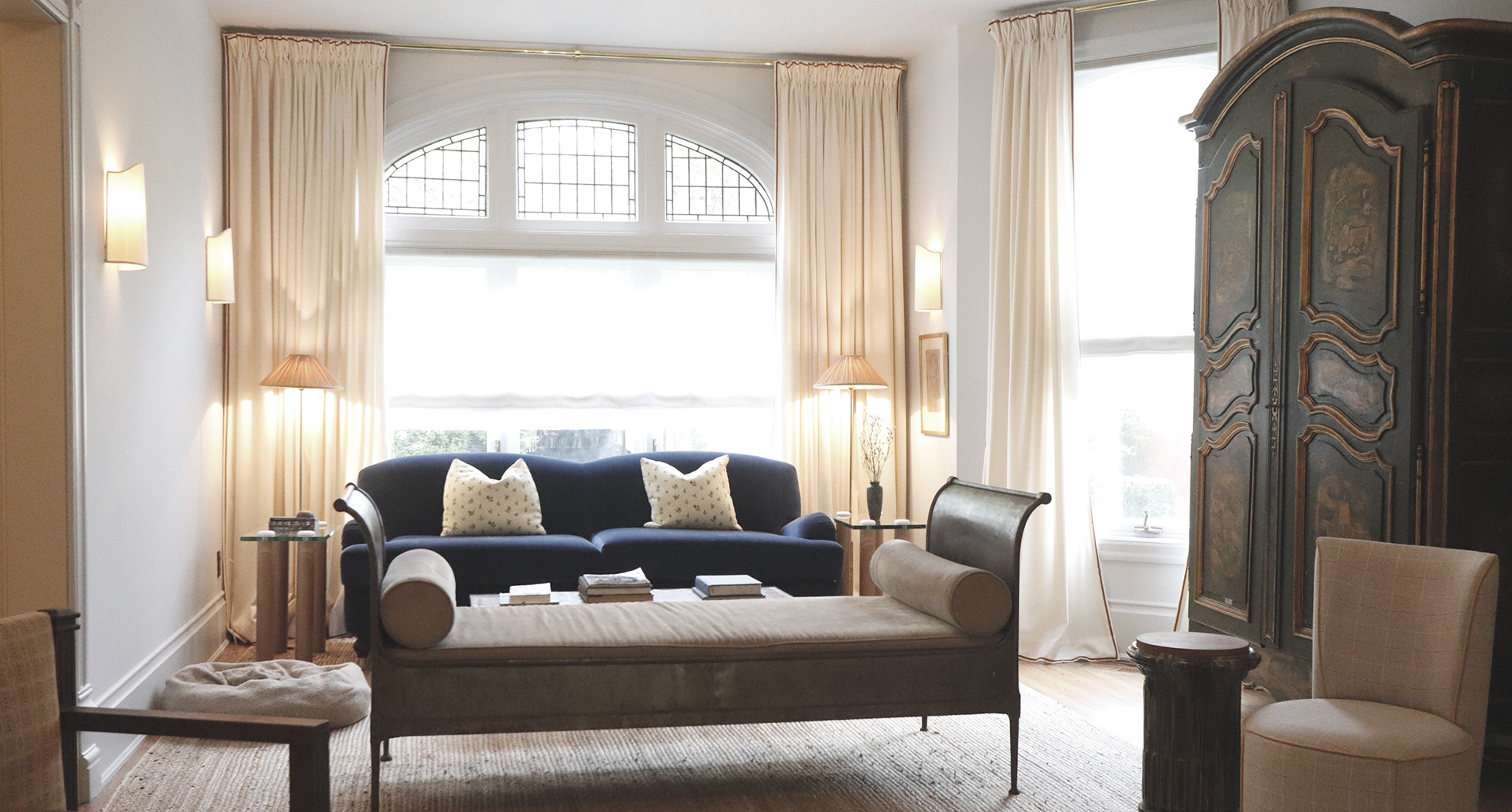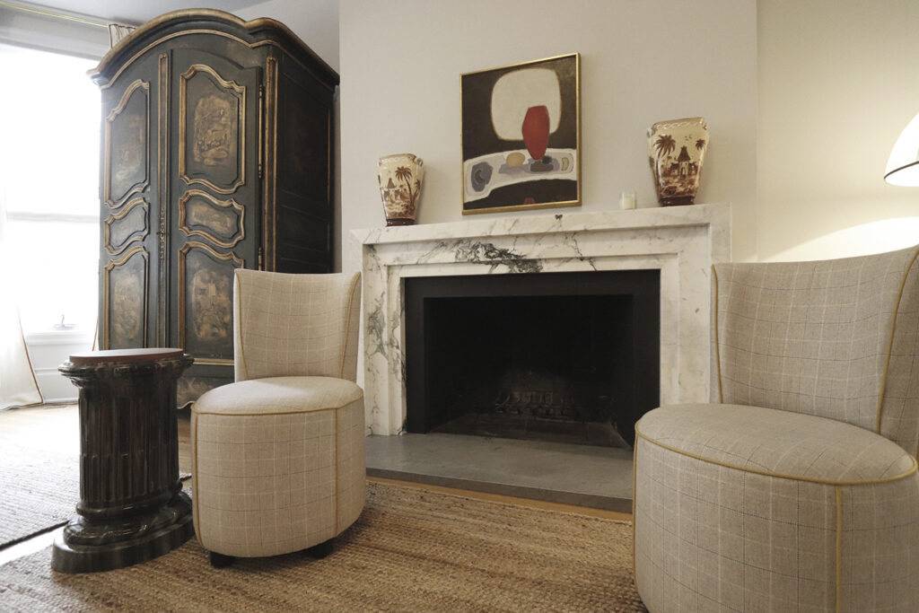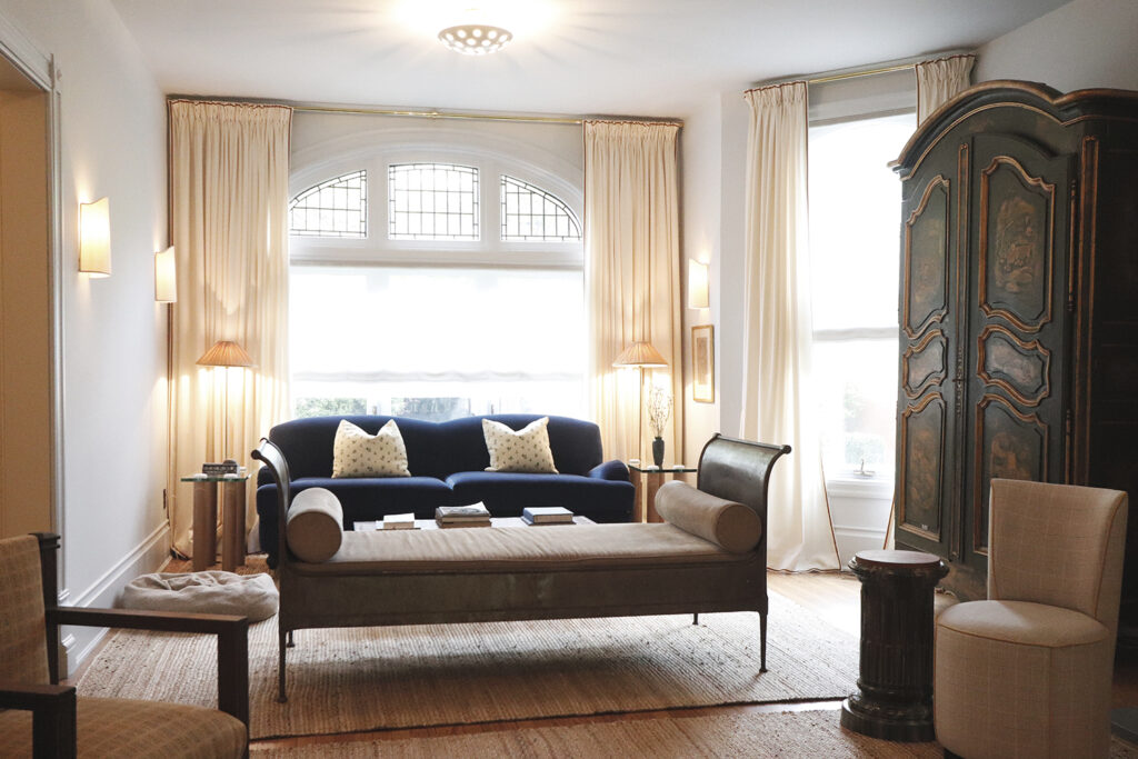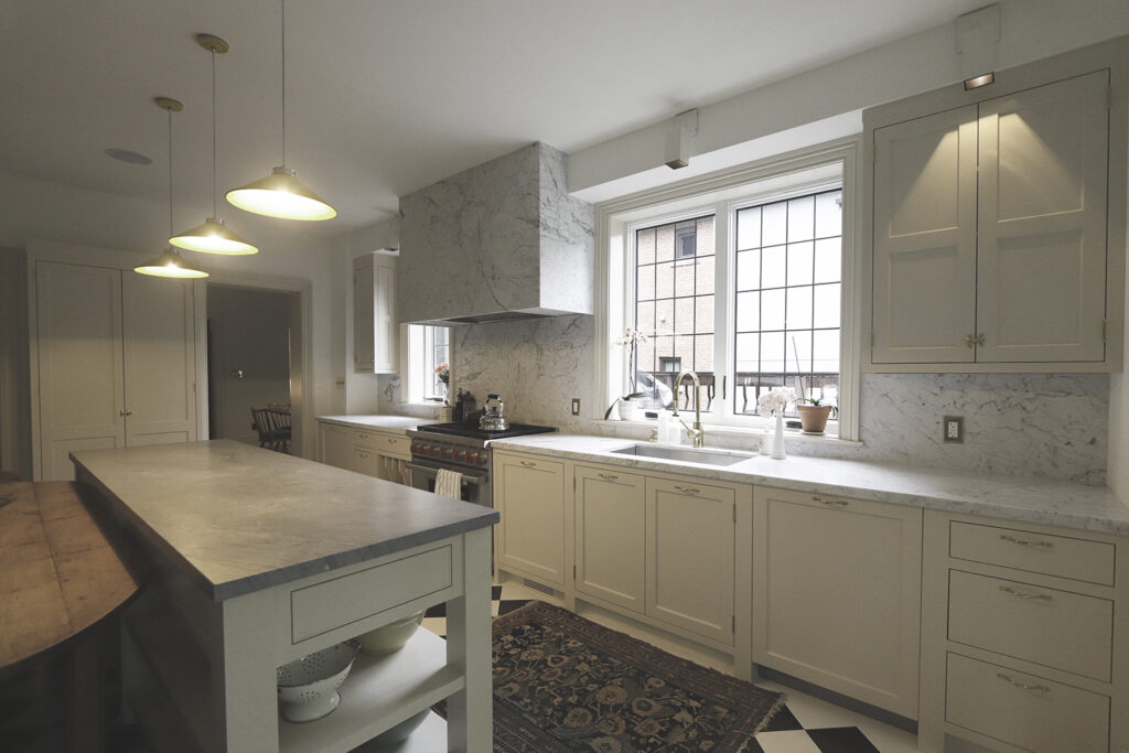 This classic-style major renovation features a gorgeous hardwood floor painted to look like black and white tile in the foyer and kitchen.
