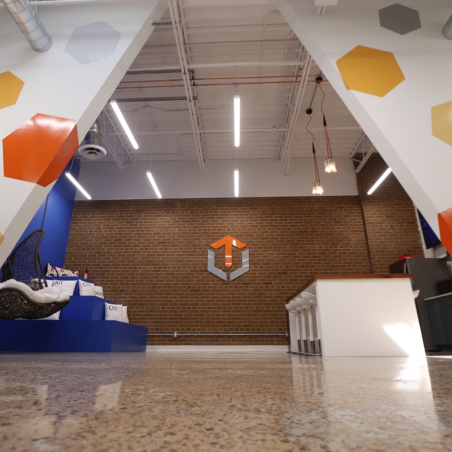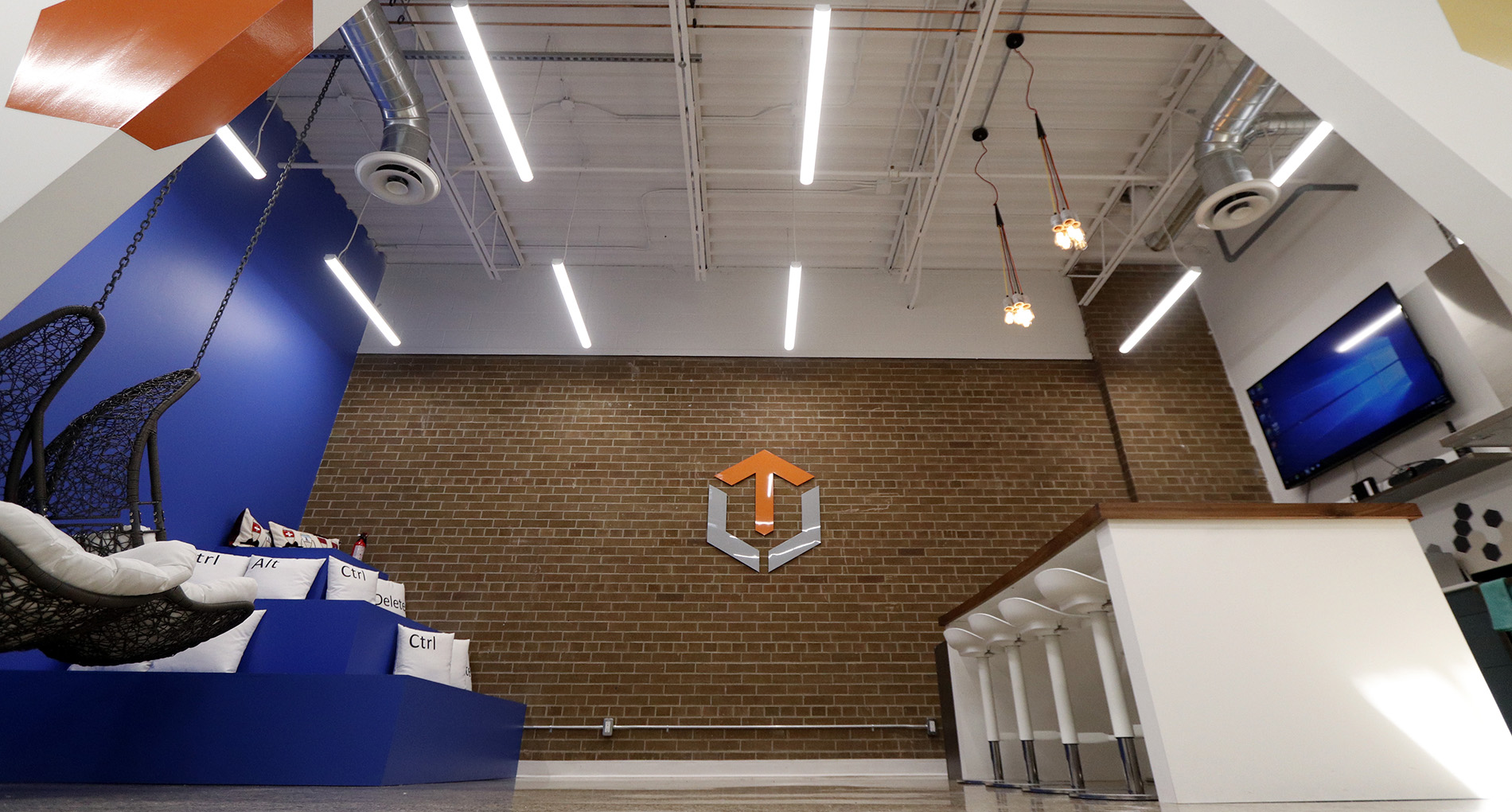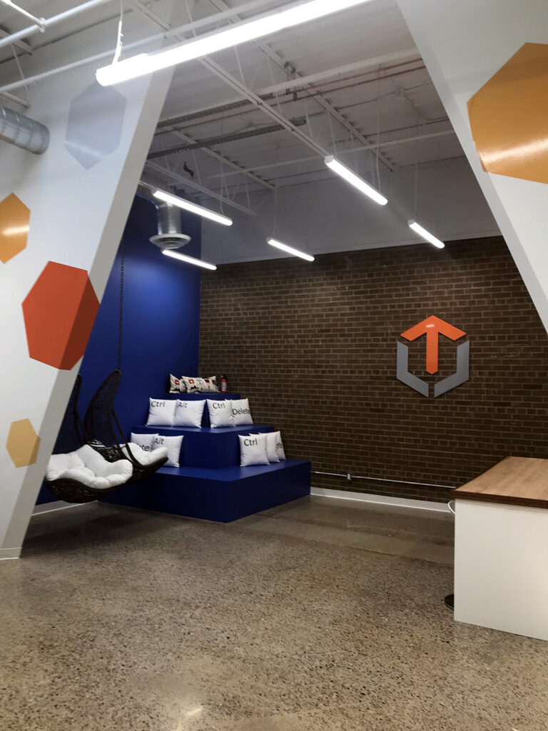 These tech offices received a bold, modern update to their work and recreation spaces. Bright colours and bold shapes contrast with the rustic brick feature wall in the common room.