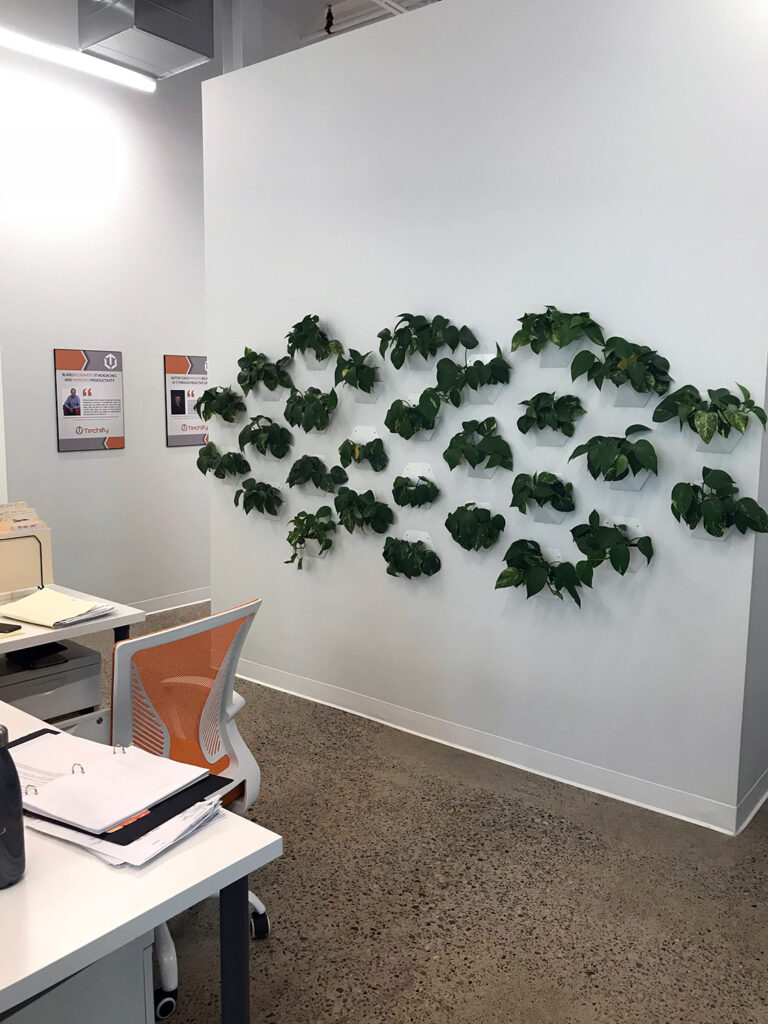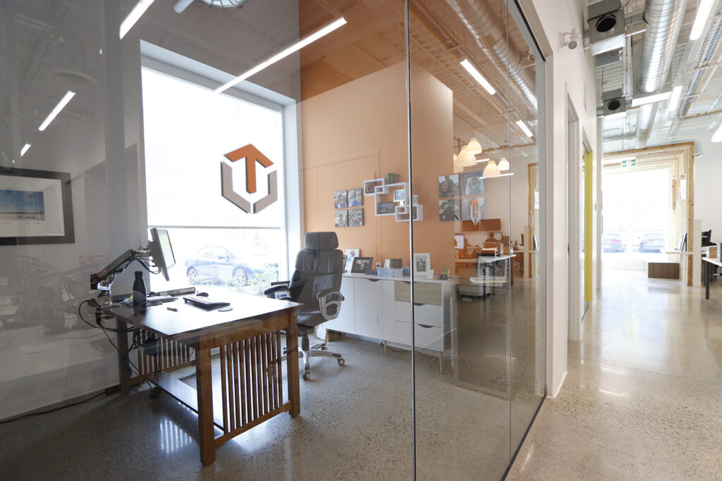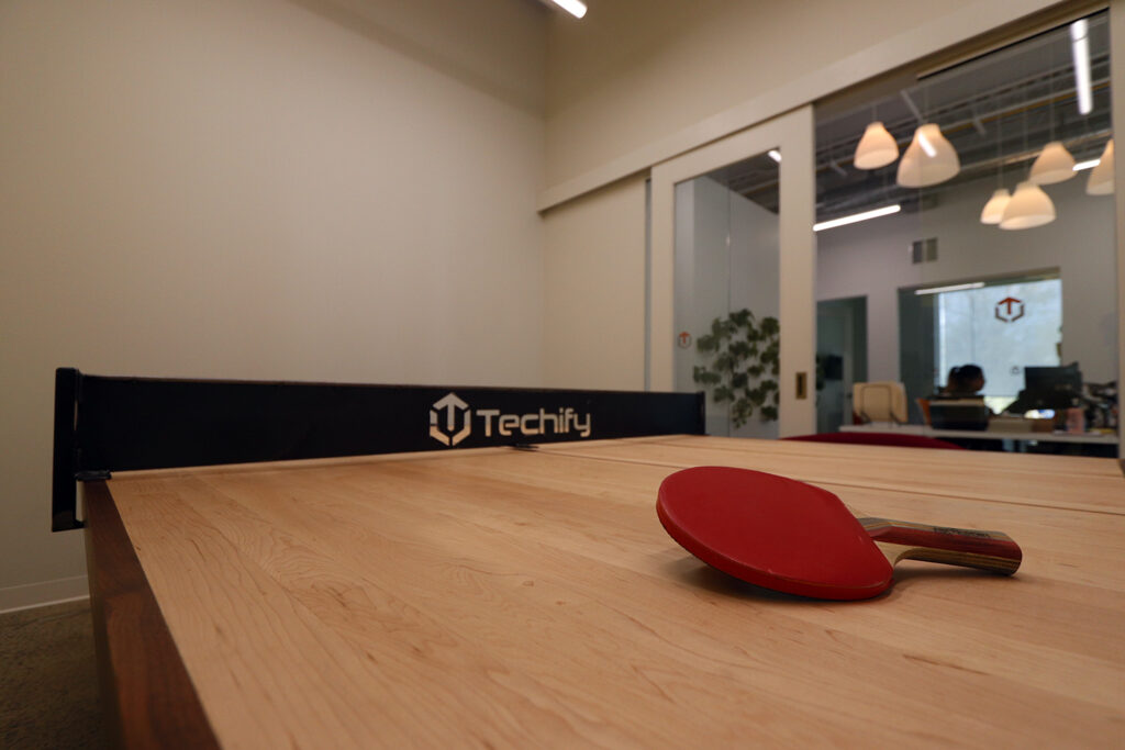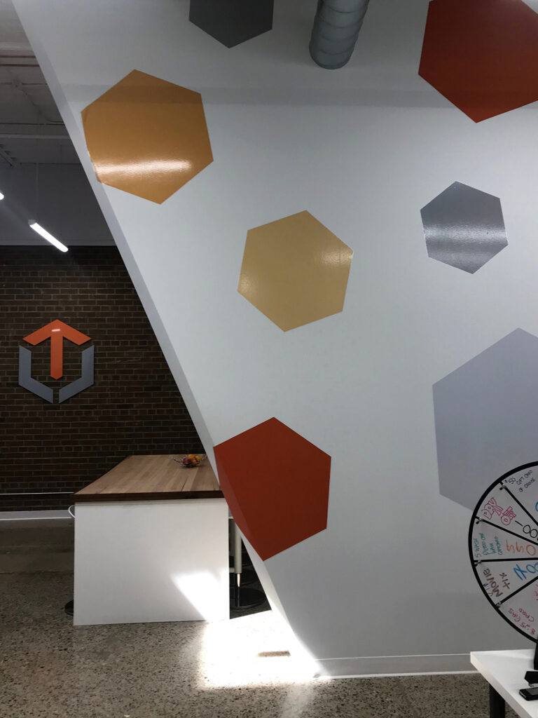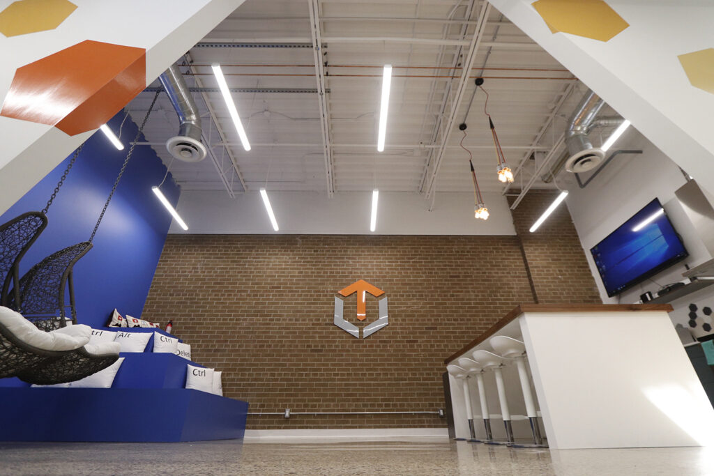 These tech offices received a bold, modern update to their work and recreation spaces. Bright colours and bold shapes contrast with the rustic brick feature wall in the common room.