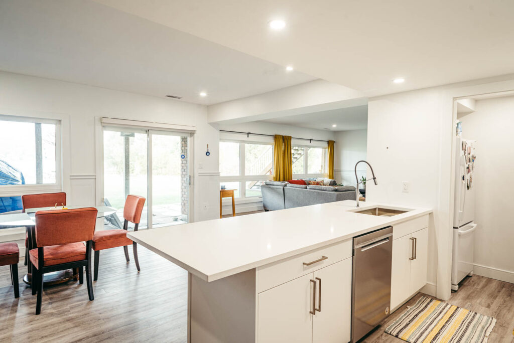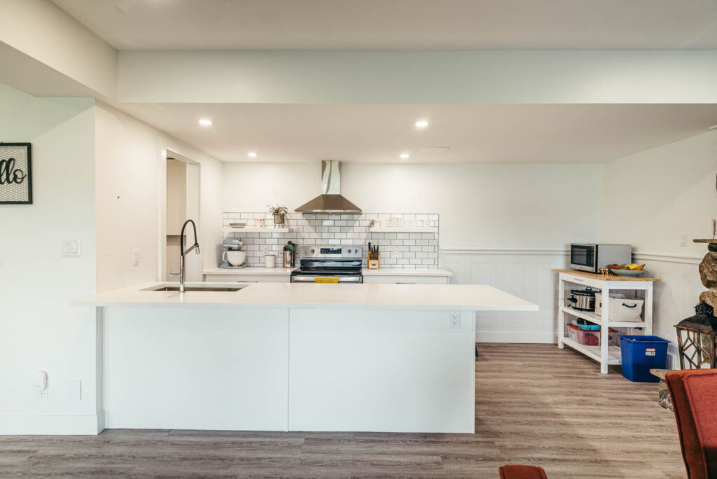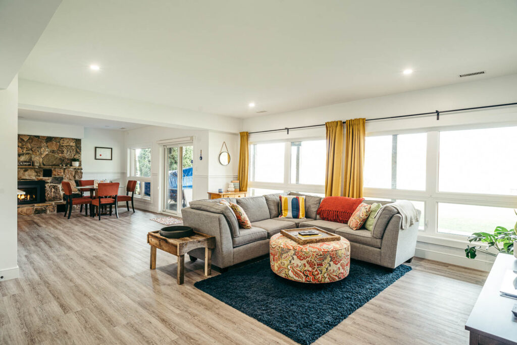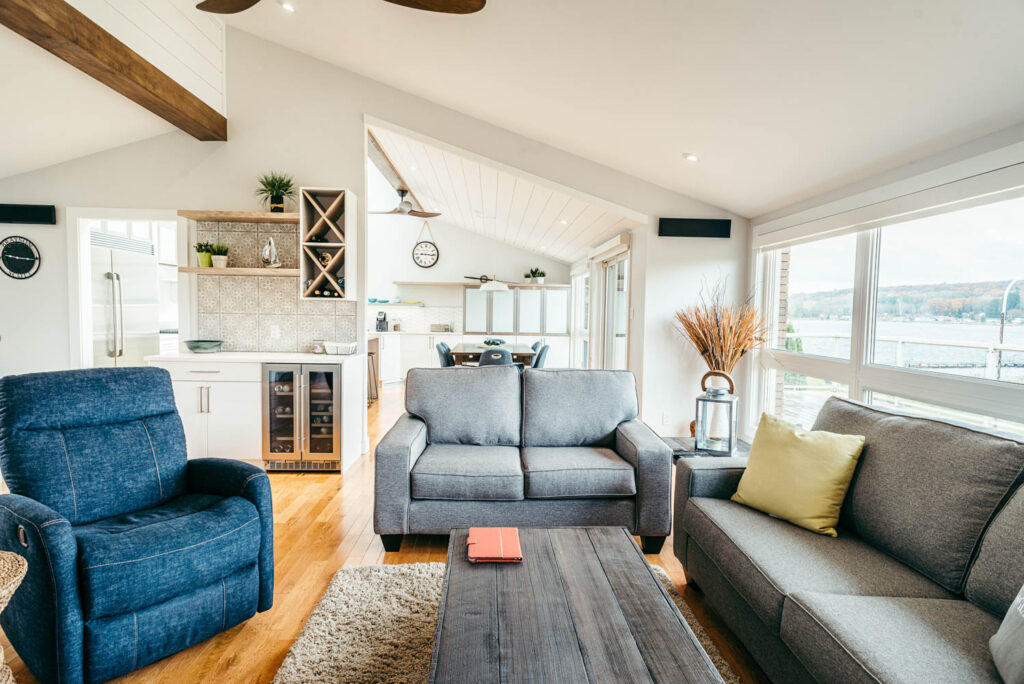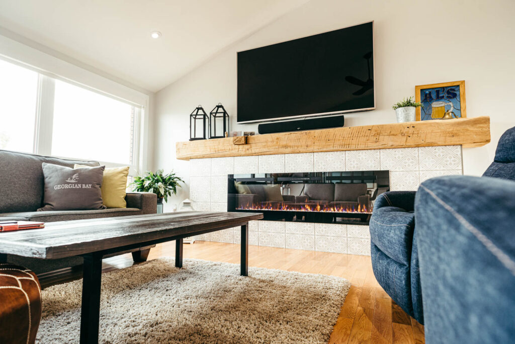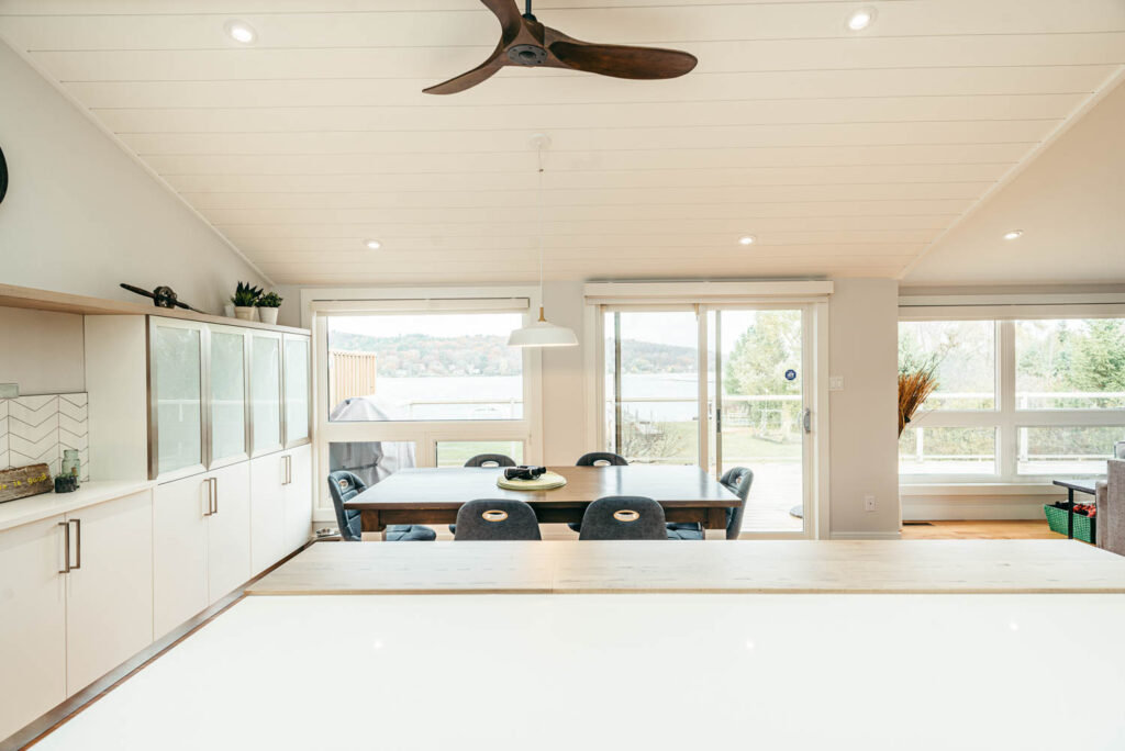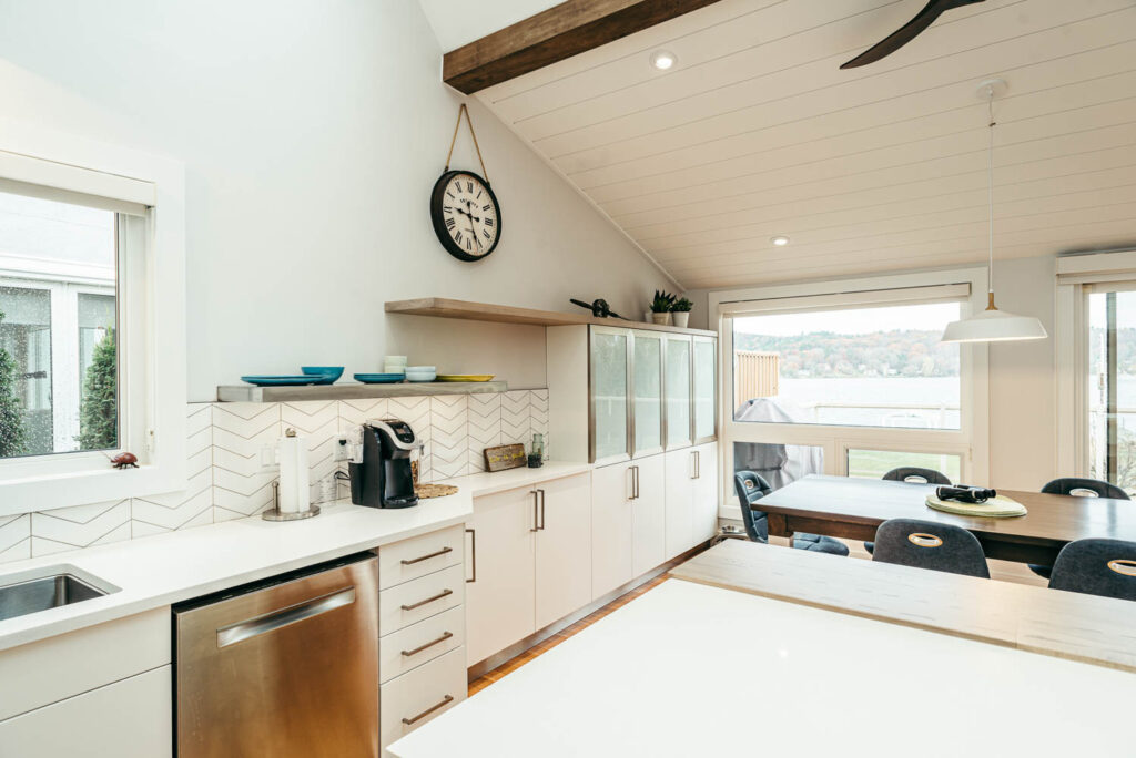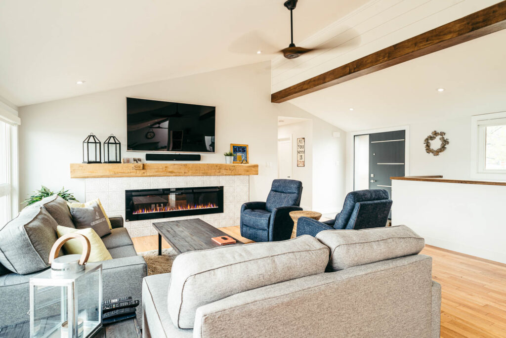 Our client grew up in this waterfront home. The intent of the renovation was to modernize the design while maintaining some of the original features of the home, like the wood burning fireplace clad in Georgian Bay stone in the family room. This provided just the right amount of nostalgia.