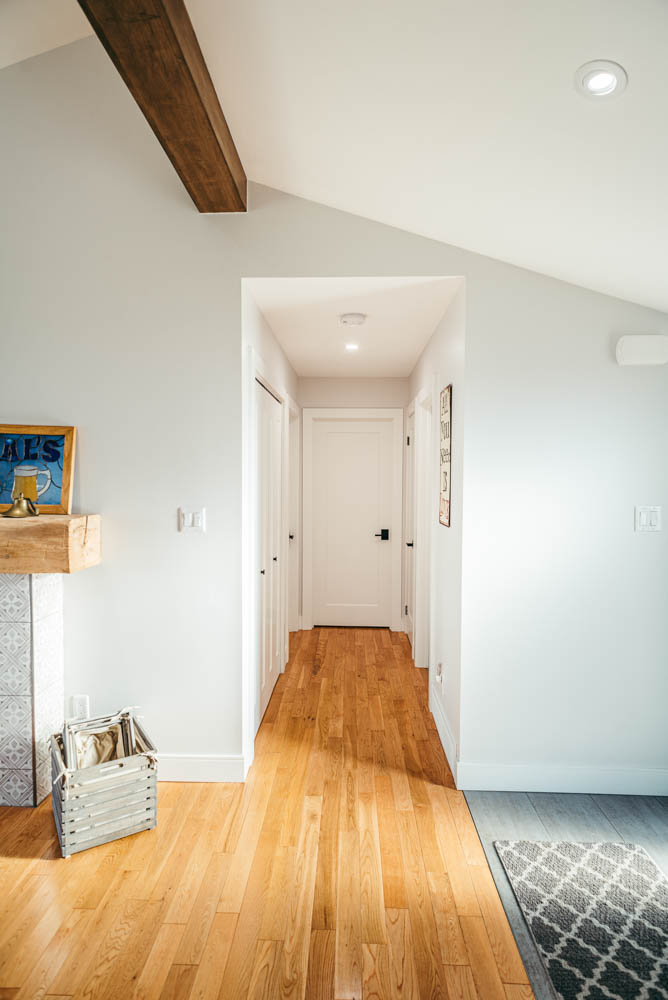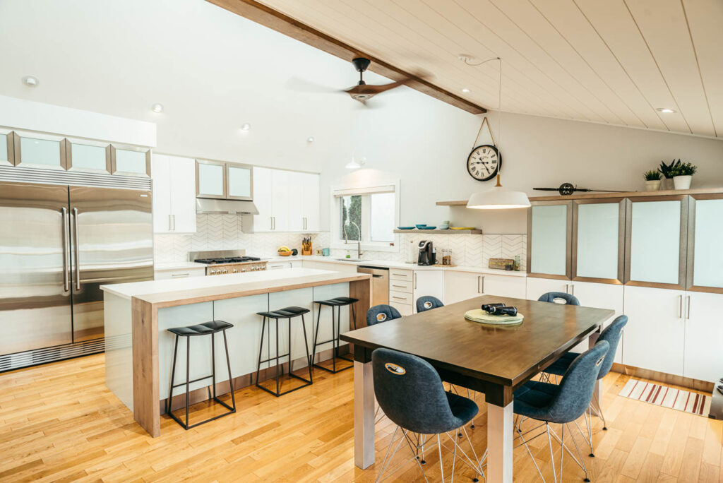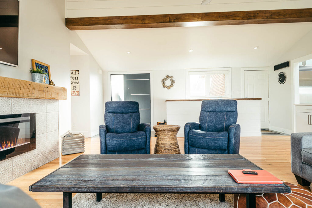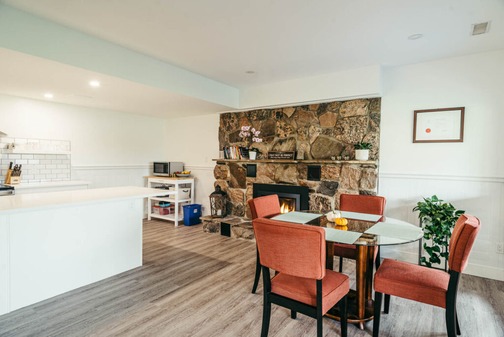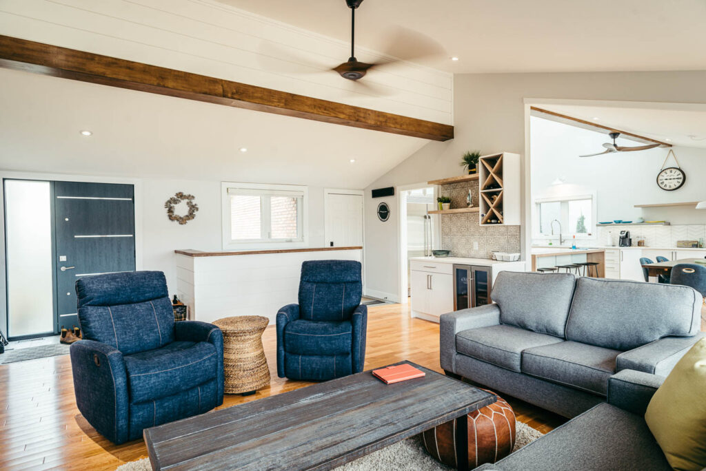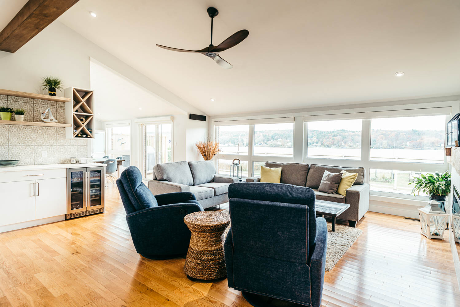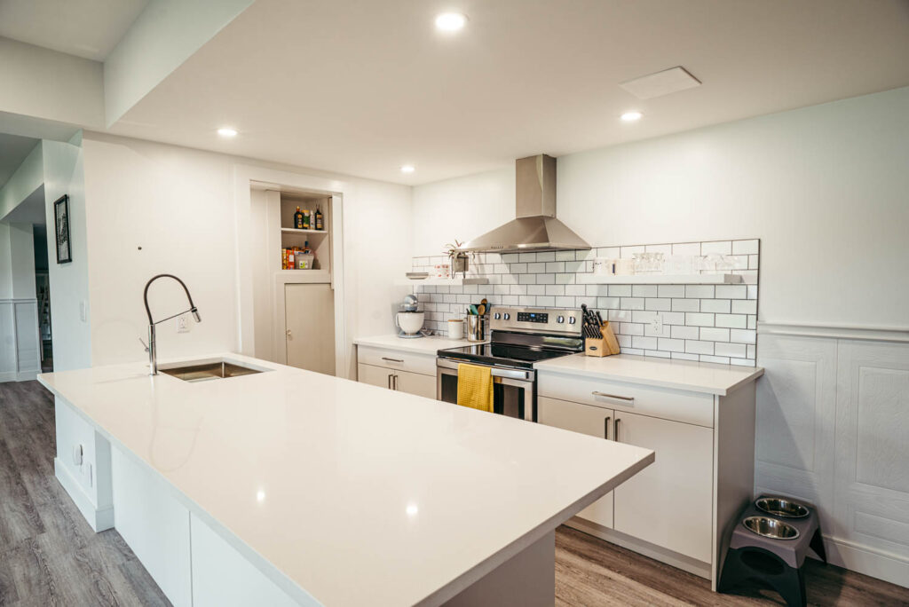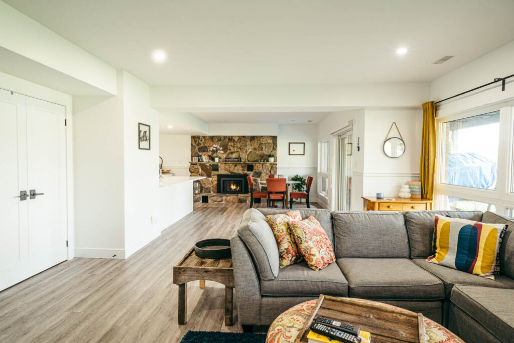 Our client grew up in this waterfront home. The intent of the renovation was to modernize the design while maintaining some of the original features of the home, like the wood burning fireplace clad in Georgian Bay stone in the family room. This provided just the right amount of nostalgia.