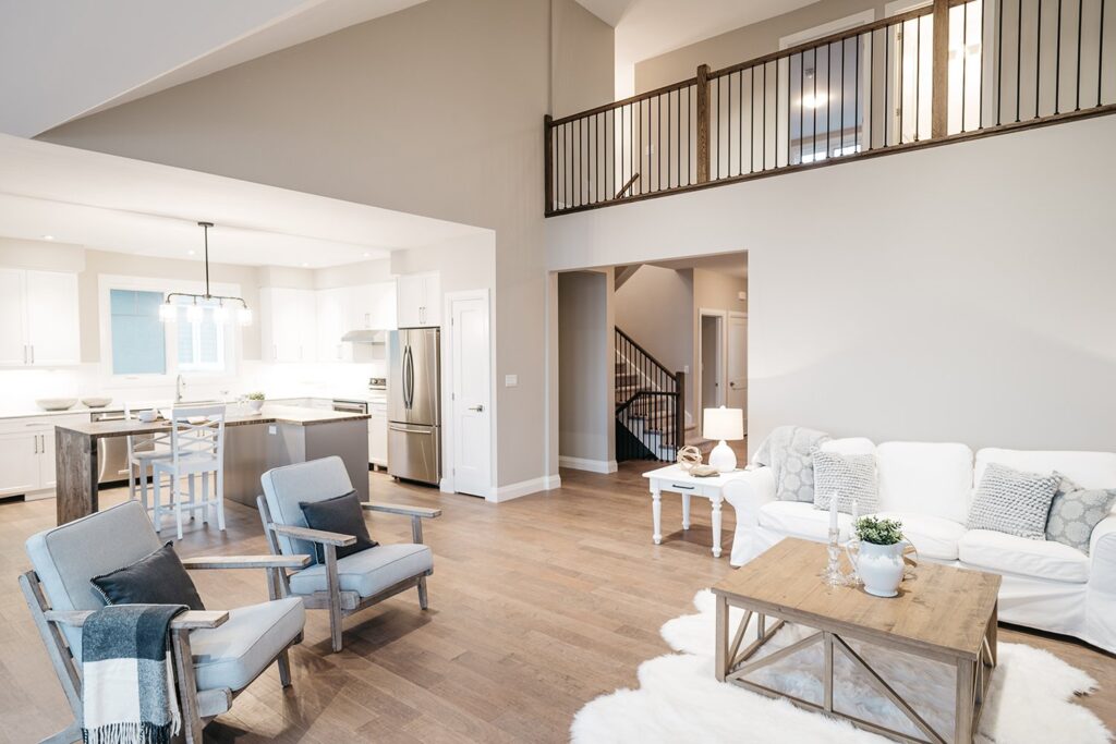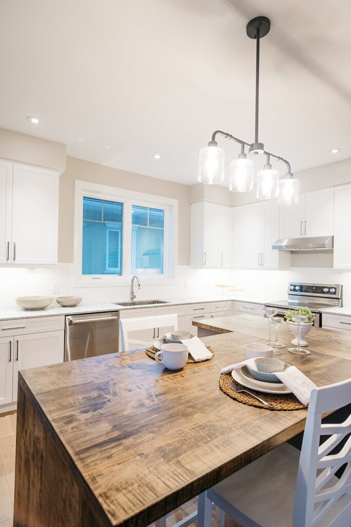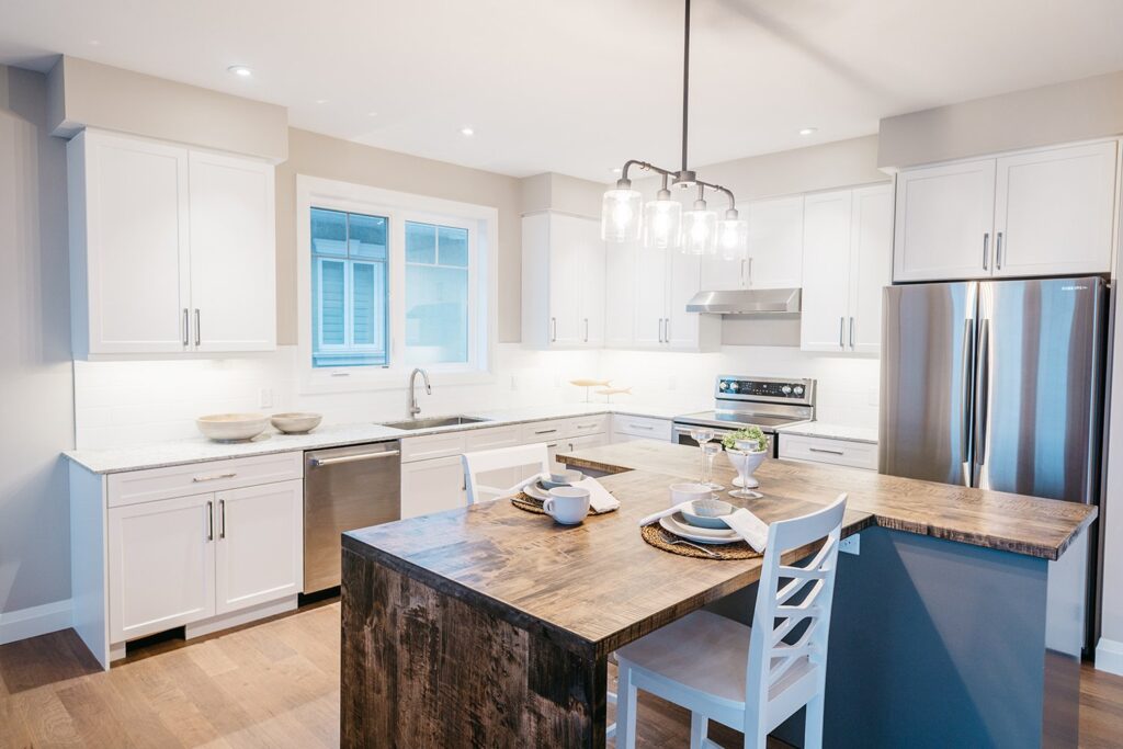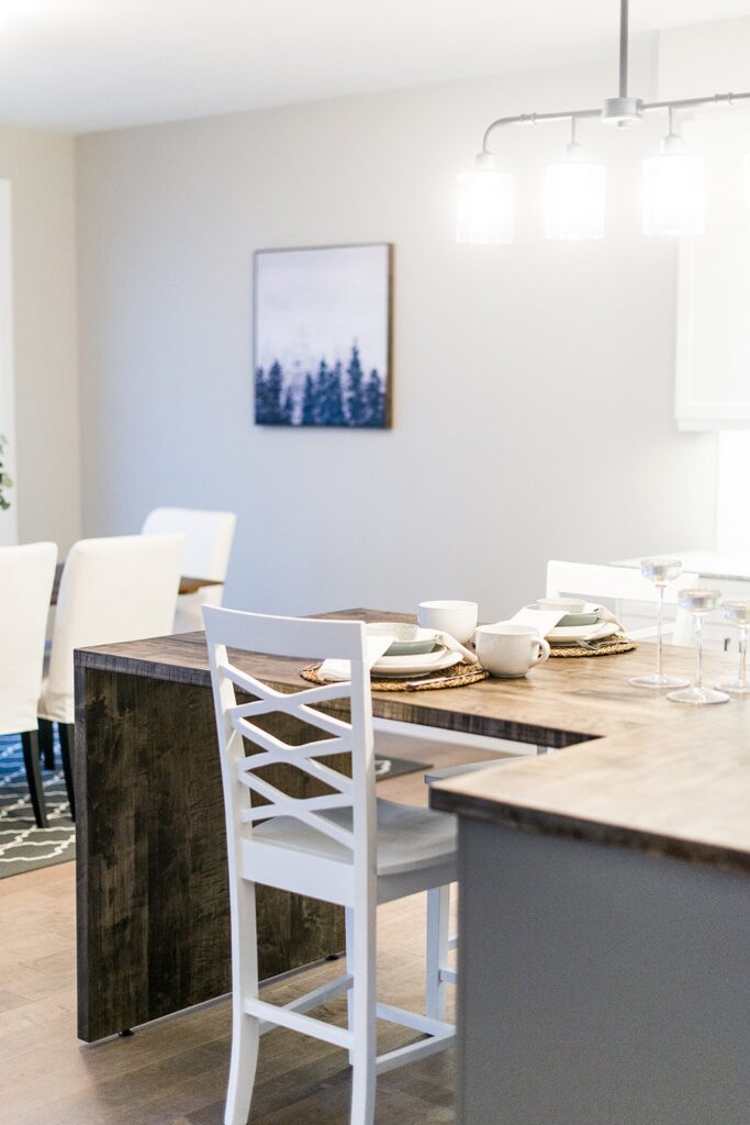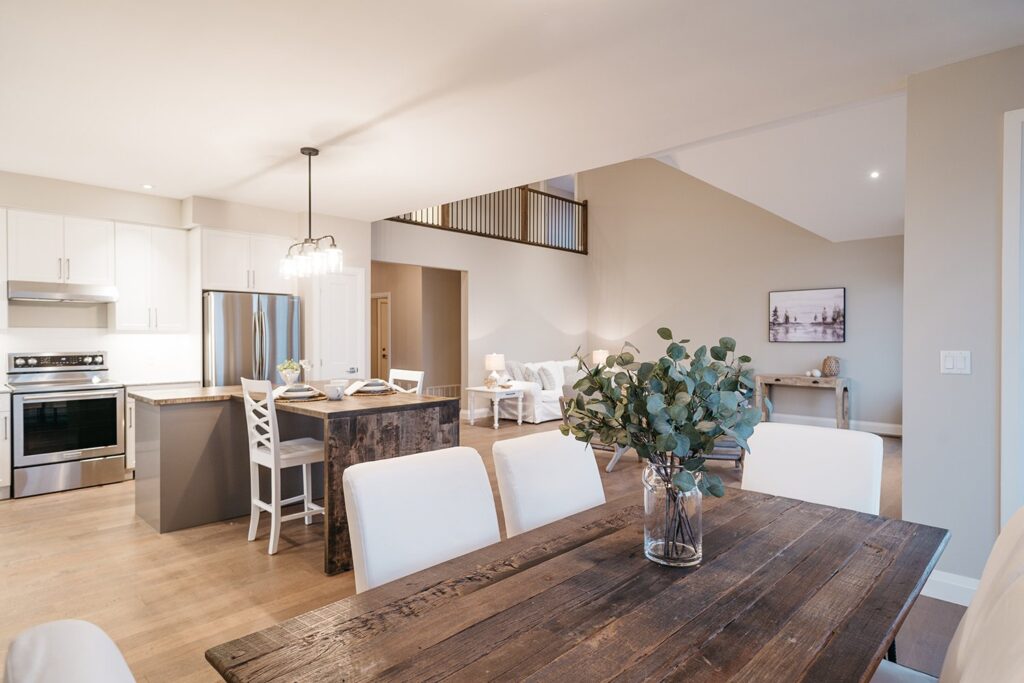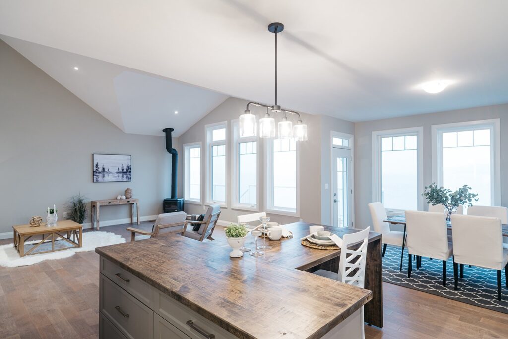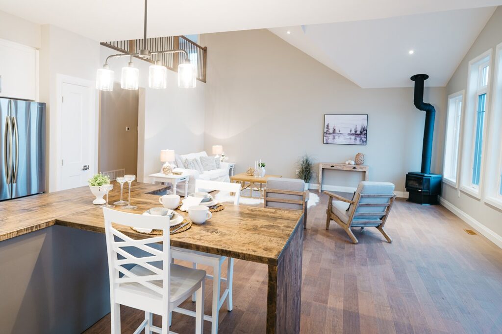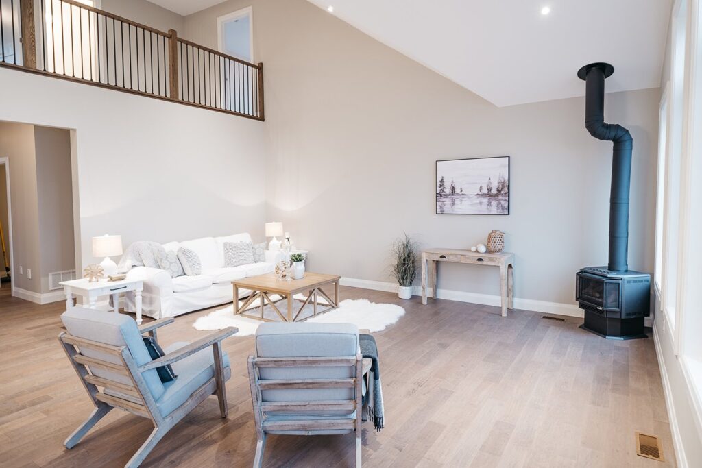 This 4 bedroom, 2.5 bath custom home features an open-concept layout with vaulted ceilings and hardwood floors throughout. The kitchen and living room features a blend of rustic and modern design elements – distressed wood counters and finishes, white cabinets and chairs, and stainless-steel appliances create a cozy and sophisticated atmosphere. The wood stove in the living room adds to the rustic charm of the space.