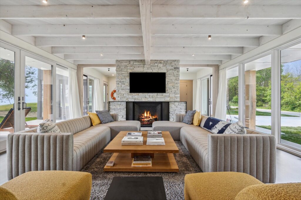 Costello envisioned a modern design that would still feel rooted in its surroundings, incorporating locally sourced materials including ceiling beams and limestone for the large fireplace and chimney.