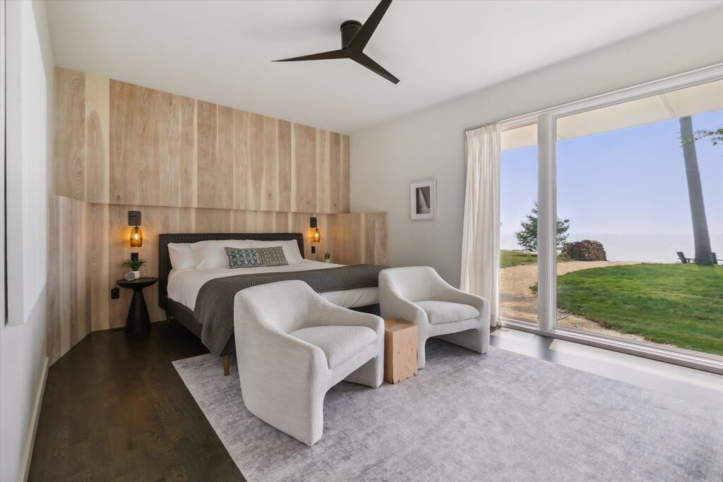 In the primary bedroom, a natural wood accent wall introduces warmth and texture.