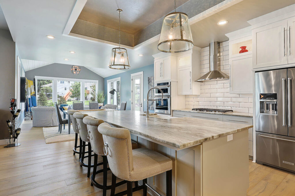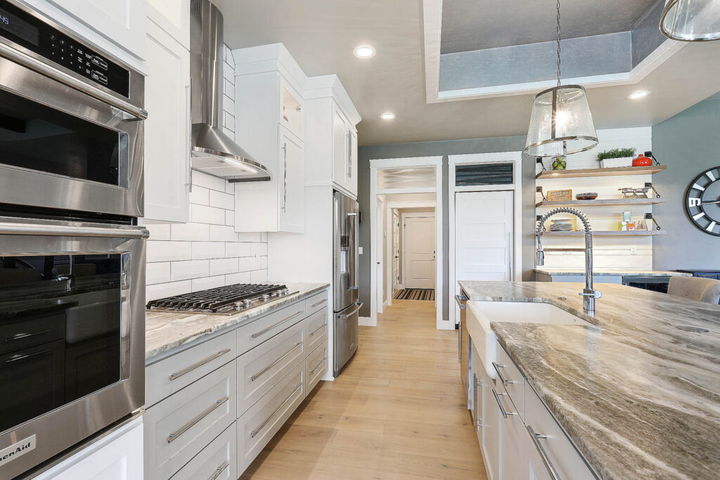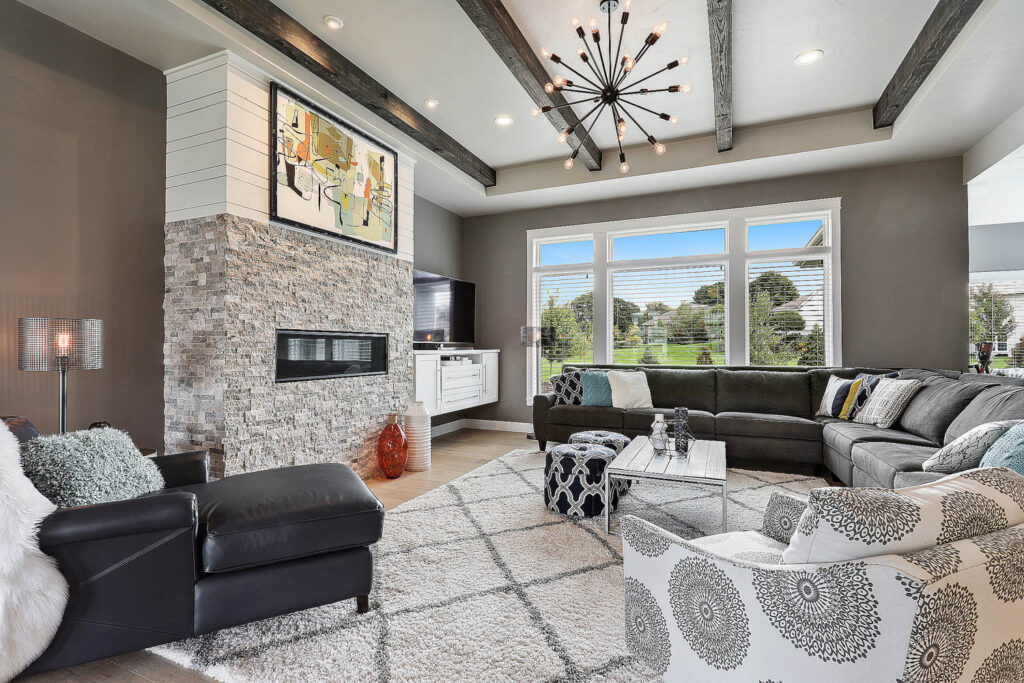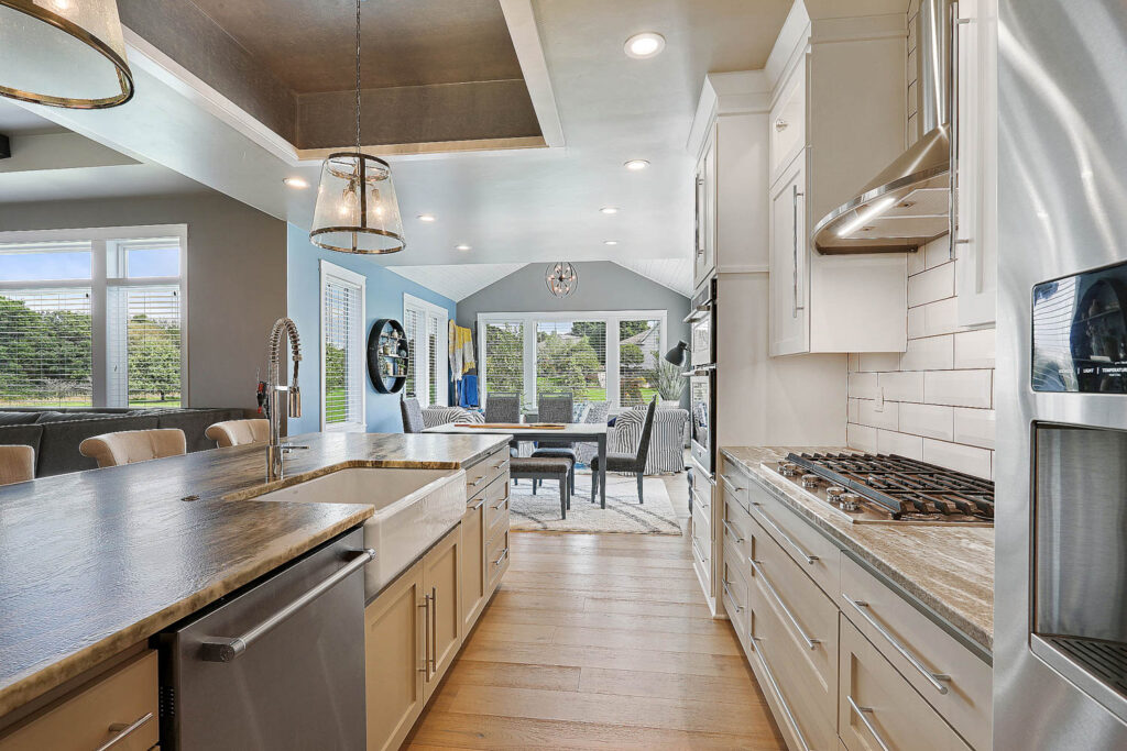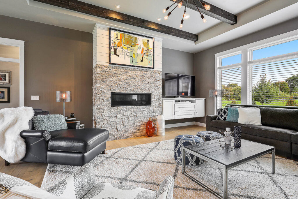 This gorgeous custom home features a cohesive blending of styles, an open concept kitchen, and high-end finishes.