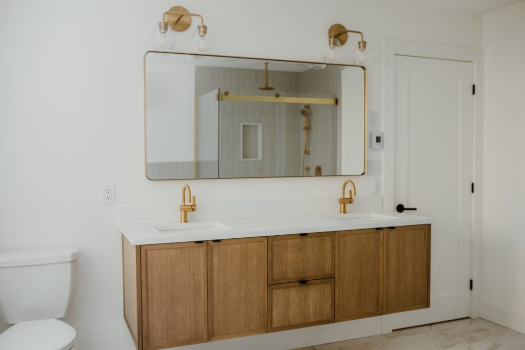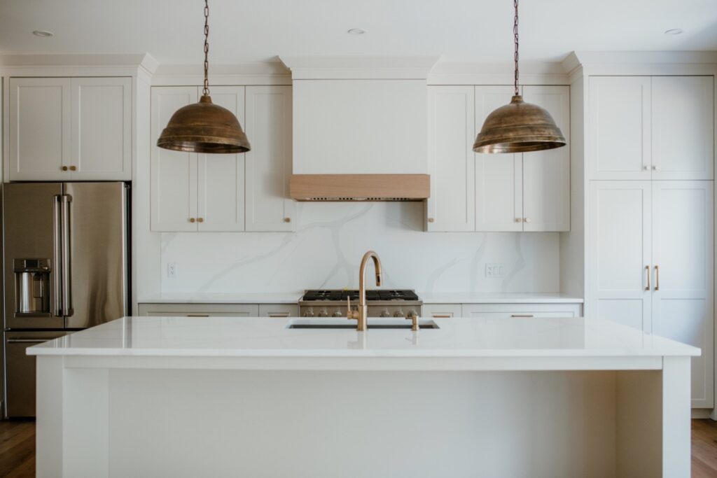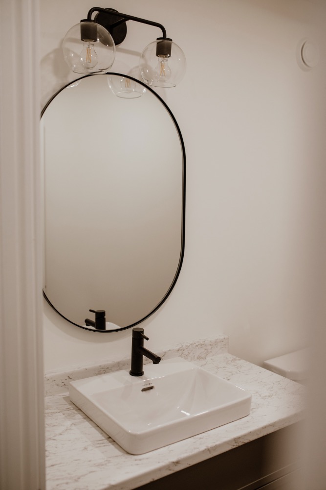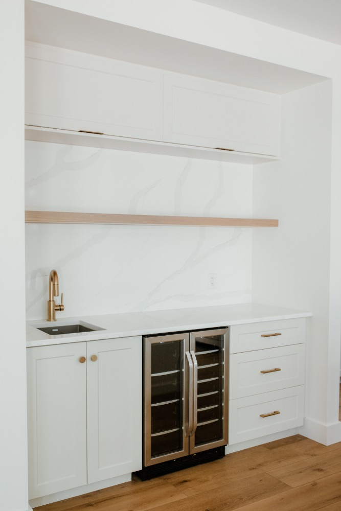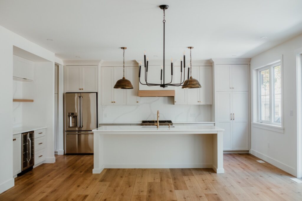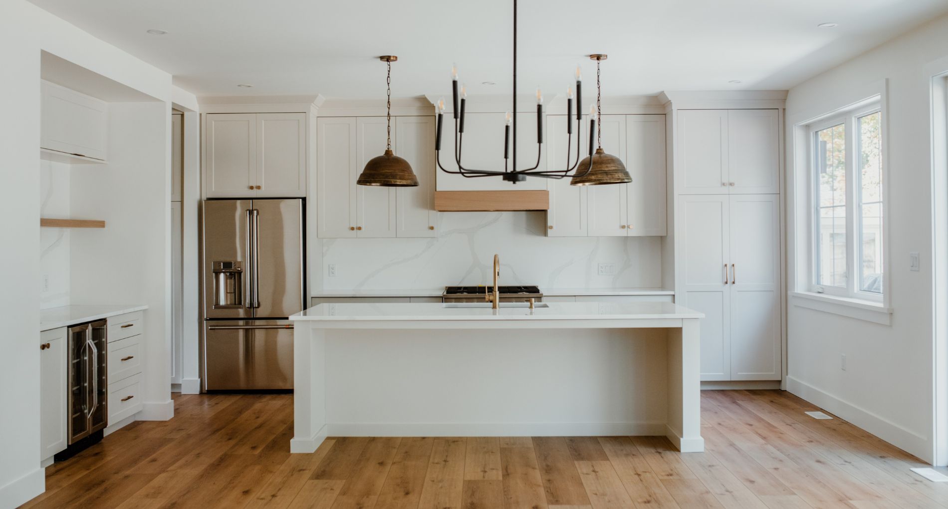This striking renovation blends modern farmhouse warmth with elevated, family-friendly design. Featuring custom millwork, warm white oak accents, and curated black hardware, the home balances cozy textures with clean lines. The open-concept kitchen anchors the main floor with stone countertops, matte finishes, and thoughtful storage, while layered lighting and soft, neutral tones create a calming flow throughout the living spaces. From the mudroom to the media room, every detail was crafted with intention to support both daily life and effortless entertaining. modern farmhouse, custom home renovation, white oak interiors, kitchen remodel, black fixtures, neutral decor, home inspiration, interior design ideas, family home design, cozy modern home.