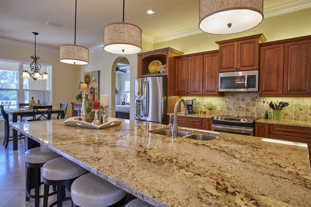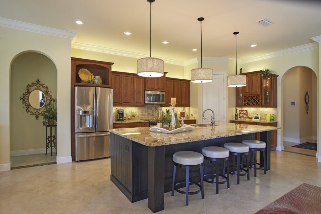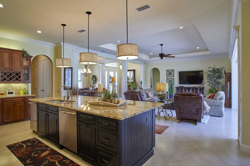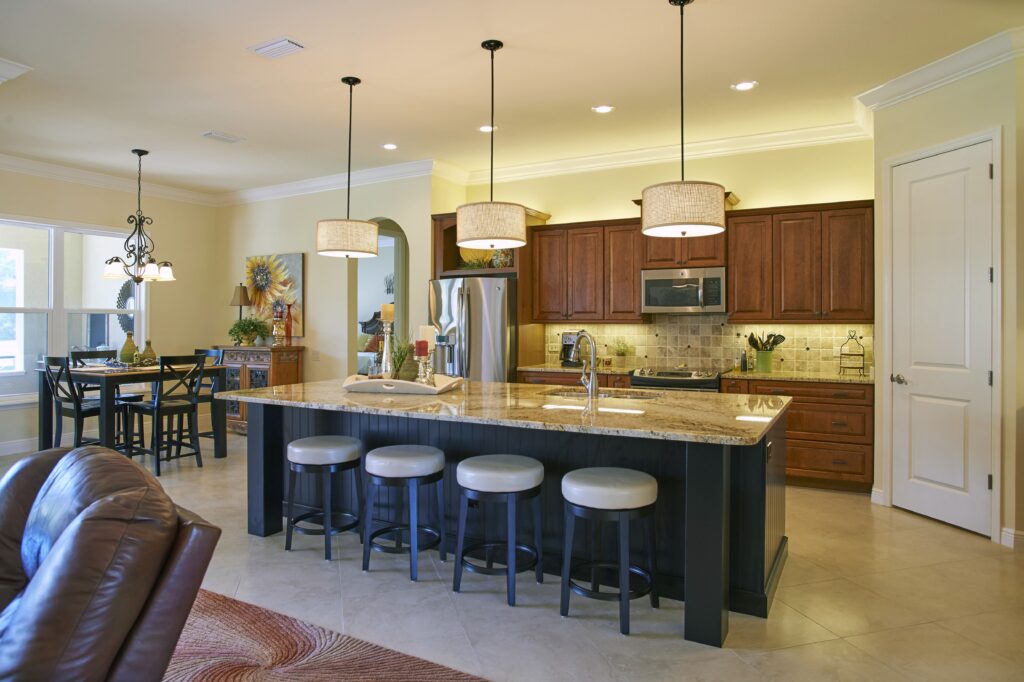 Fairway View was designed with the essence of Florida living at its core—bright, open, welcoming, and connected to the outdoors. The open floor plan creates seamless flow from room to room, while large pocketing sliding doors invite the beauty of the Sun-N-Lake golf course directly into the home. A spacious screened lanai with pool and a full outdoor kitchen make everyday living feel like a vacation, perfect for both entertaining and unwinding. The master bedroom also captures sweeping scenic views, giving homeowners a peaceful retreat at any time of day.