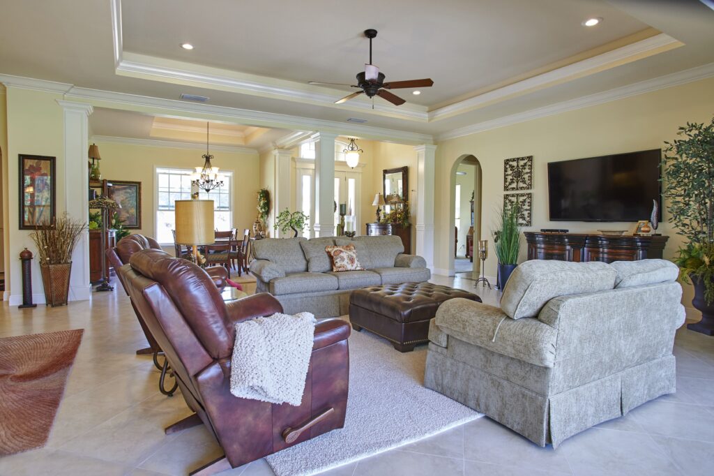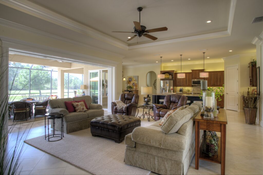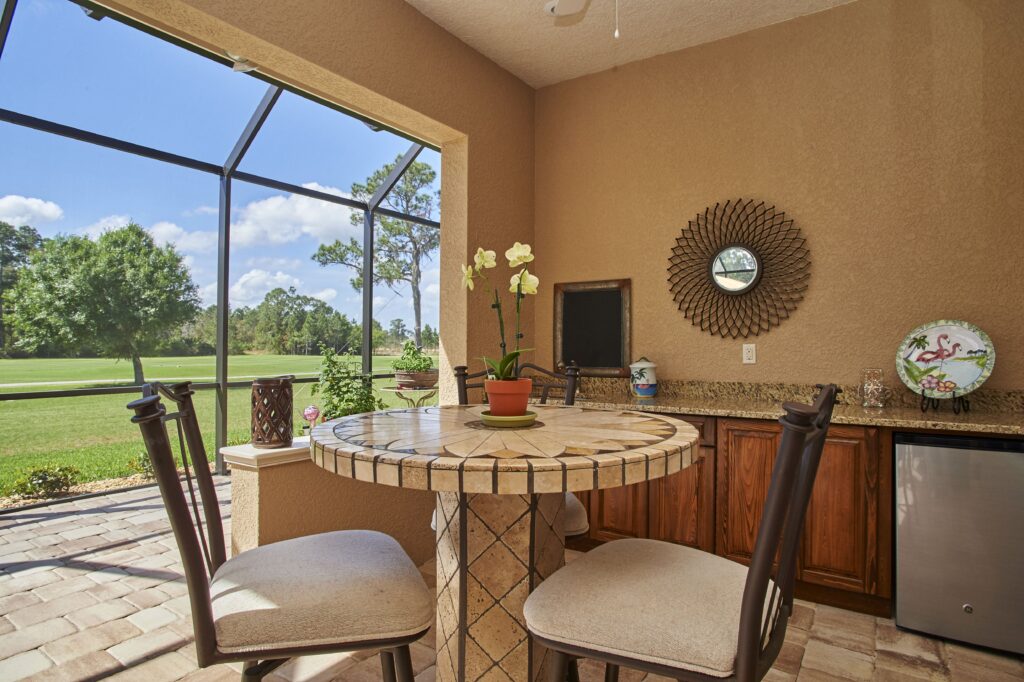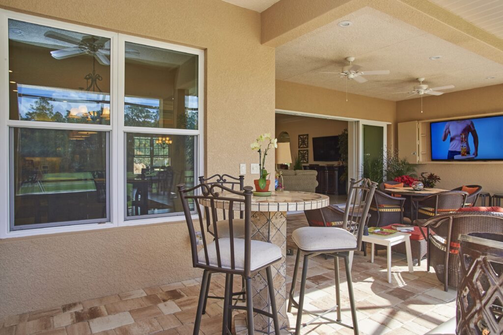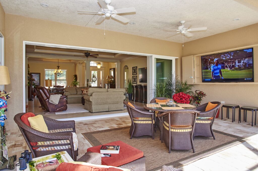 The vision behind Fairway View centered on capturing the heart of Florida golf-course living—sunshine, scenery, and community. The home was designed to maximize outdoor connection, with pocketing sliding glass doors that fully retract to reveal expansive views of Fairway 9. This openness encourages fresh air, natural light, and effortless movement between indoor and outdoor spaces, creating a setting ideal for gatherings, relaxation, and taking in the rhythm of daily life on the course.