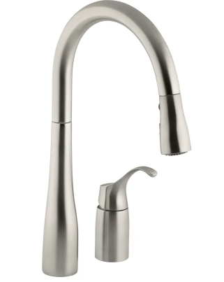 Choose a single-lever or sensor-based kitchen faucet with sprayer like the Kohler Simplice Two-Hole Kitchen Sink Faucet with Pull-Down Swing Spout, DockNetik Magnetic Docking System and a 3-Function Sprayhead Featuring Sweep Spray.