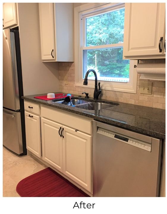 To resolve the inconvenient pathway leading to the kitchen, the breakfast bar was moved to the opposite wall and downsized to create more space in the kitchen aisle. In the original kitchen layout, the placement of the old appliances made it awkward for cooking meals. The kitchen consisted of only one large fluorescent light which provided inadequate lighting when prepping and cooking meals. In the newly renovated kitchen, new stainless steel appliances were installed and relocated to create a highly functional work triangle. The refrigerator is counter depth and therefore offers more aisle space in the kitchen. The old popcorn ceiling was transformed into a new smooth drywall ceiling that made it possible to install recessed lights providing the perfect amount of light. The couple selected lovely industrial-style pendant light fixtures in an oil-rubbed bronze finish that coordinates with the cabinet hardware, doorknobs, and kitchen faucet.