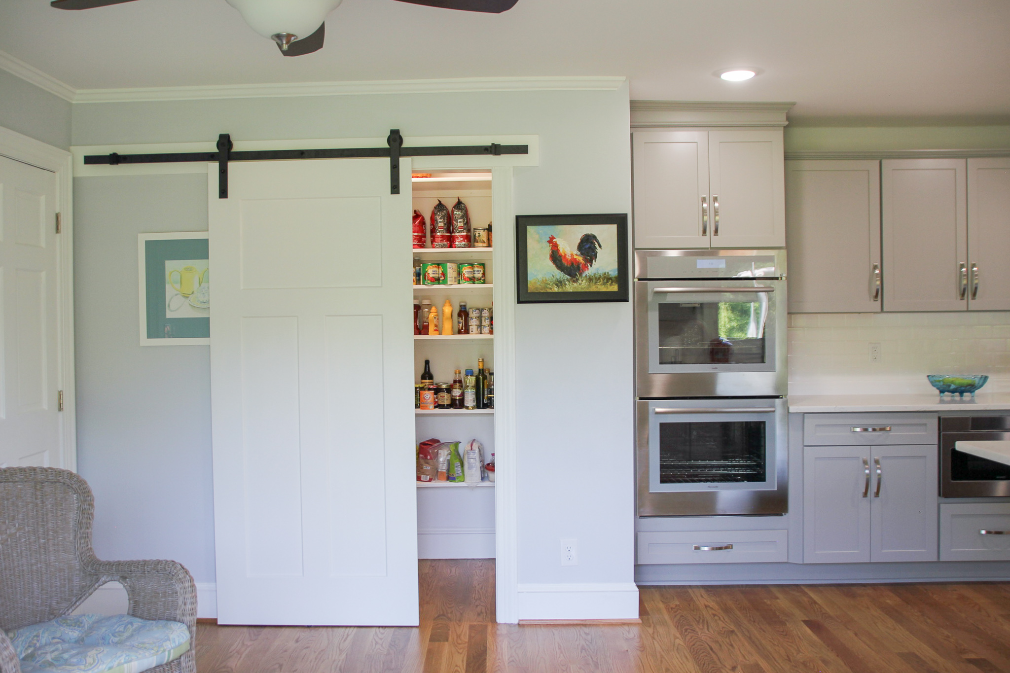 By enlarging the space and adding a custom kitchen island, the newly renovated kitchen includes ample countertop space, extra cabinetry storage, and plenty of workspace to prep and cook meals. The white quartz countertops and backsplash paired with the gray perimeter cabinets and black onyx kitchen island create a transitional aesthetic. Polished nickel hardware were used to complete this clean and sleek design. New luxury appliances were installed as well as a walk-in pantry with a sliding barn door