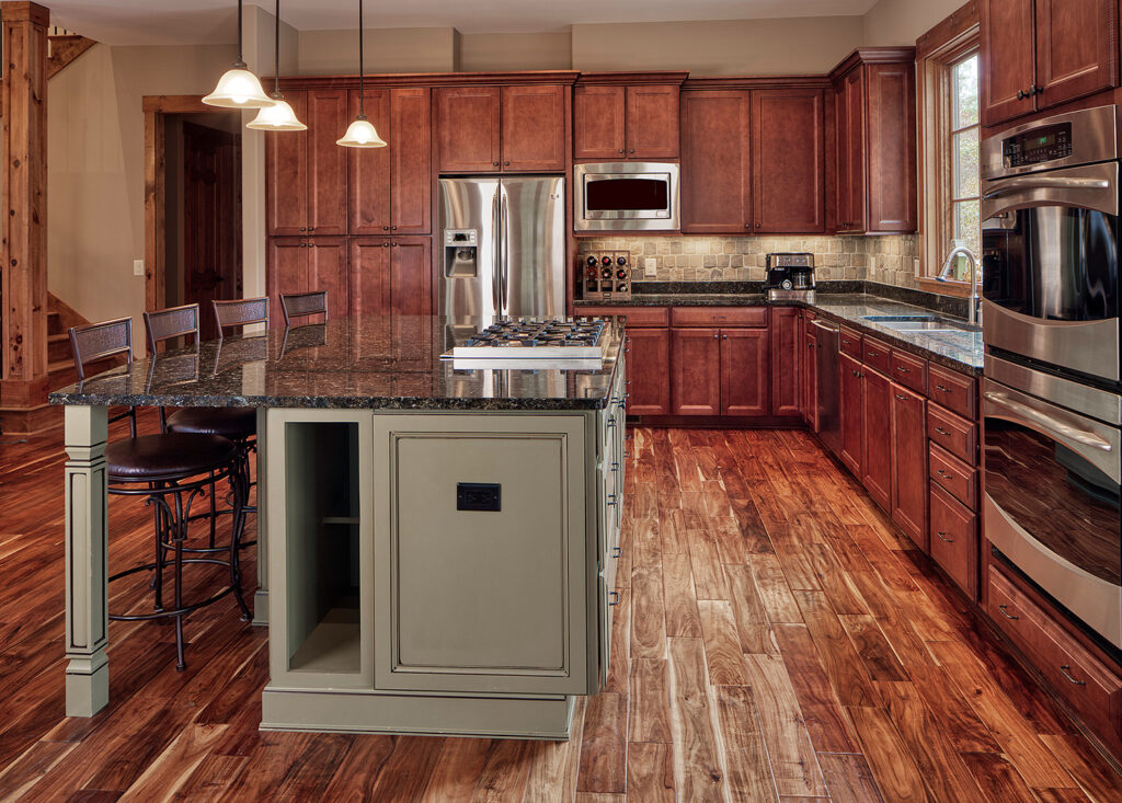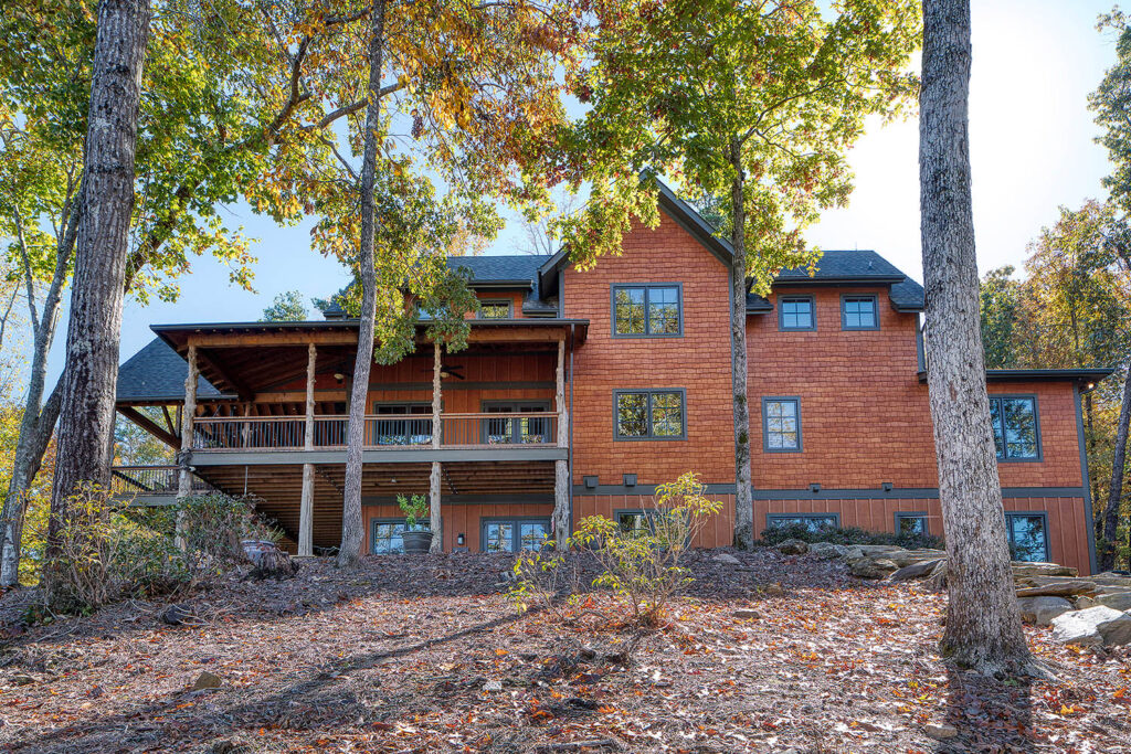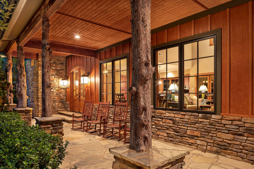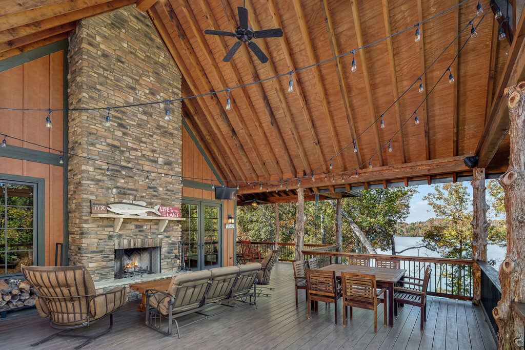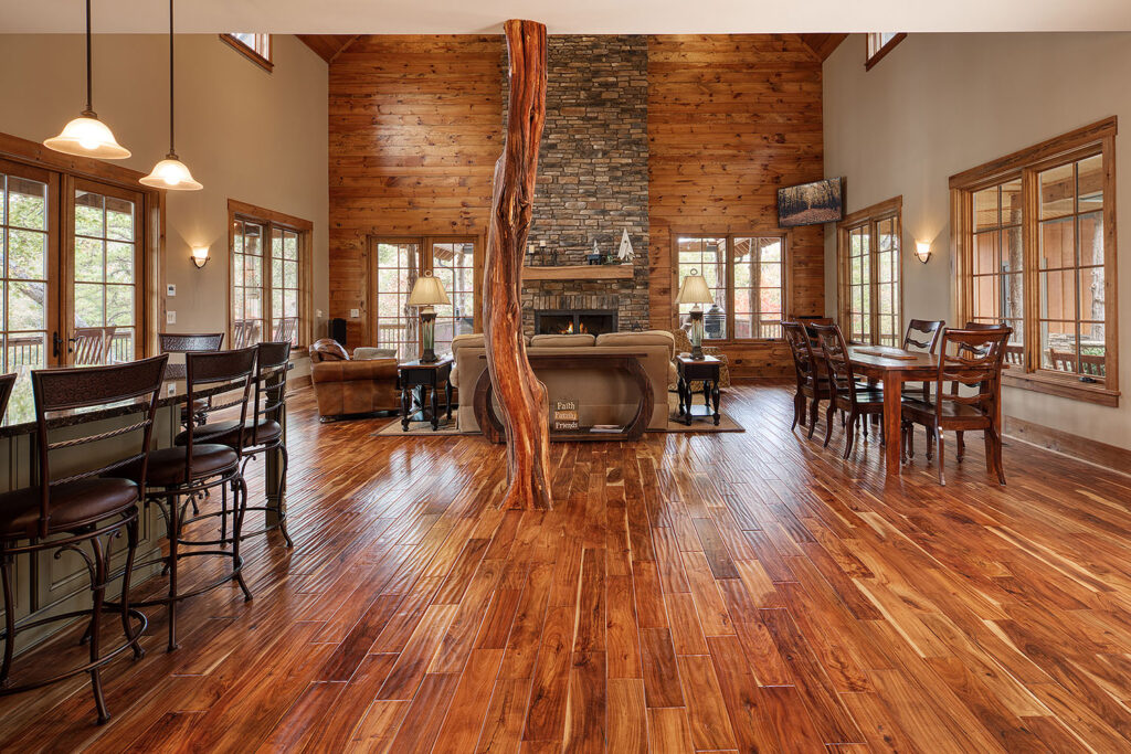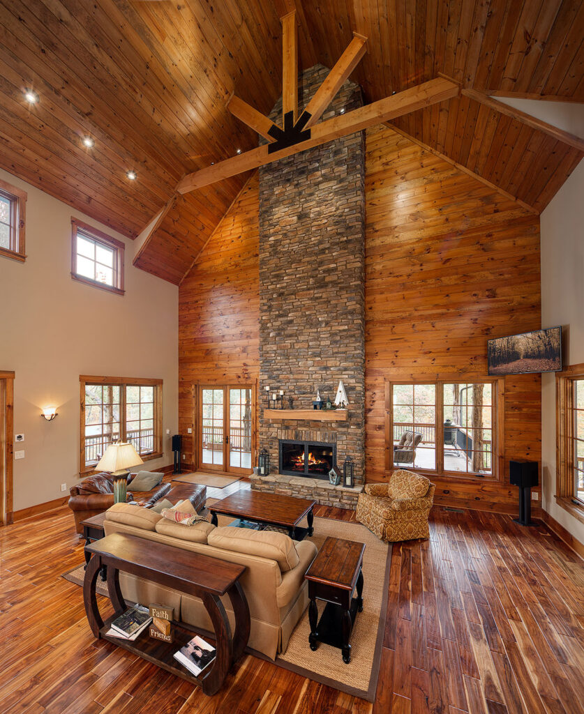 The main living space of this rustic custom home features a distressed wood feature wall that continues across the vaulted ceiling with wood support beams.